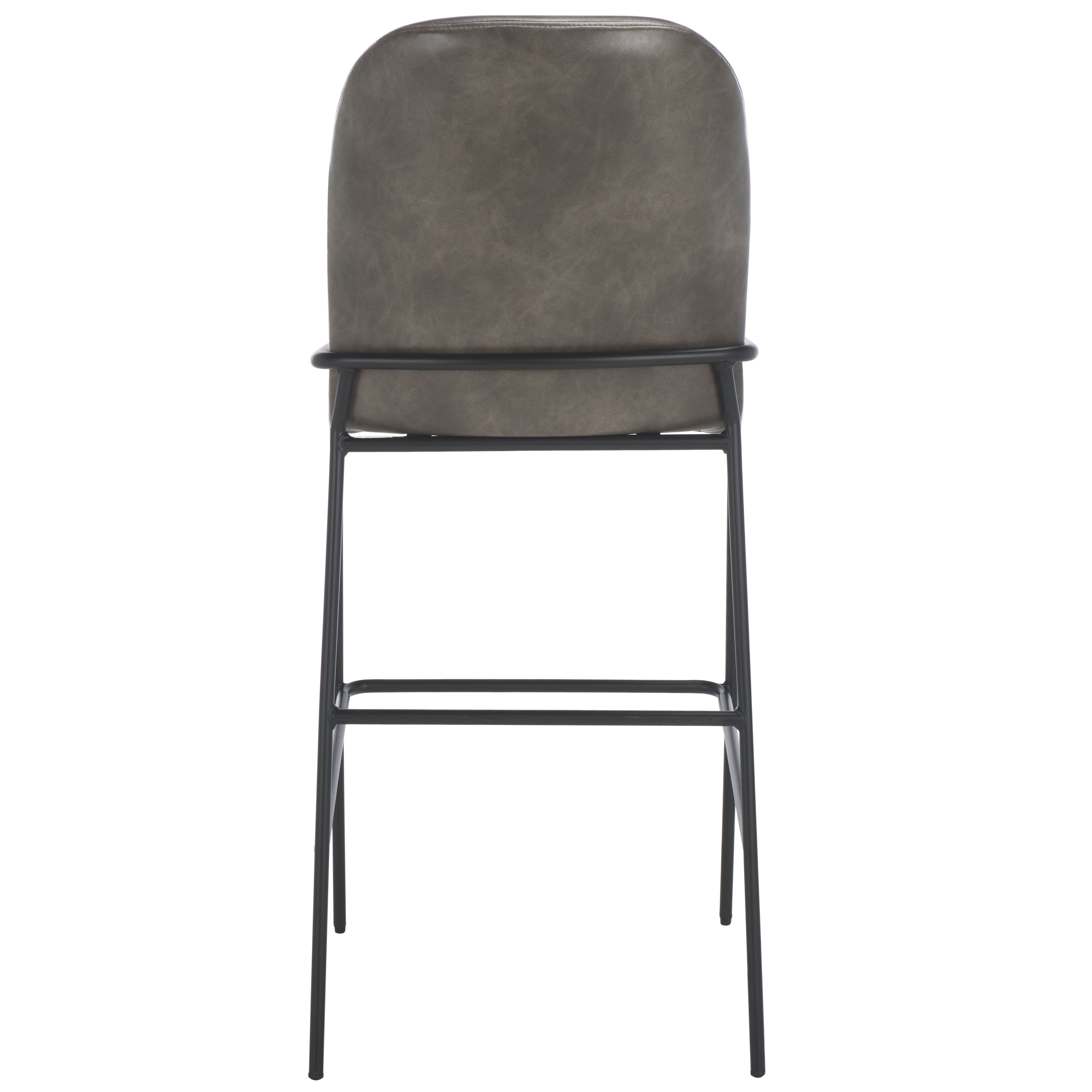 Lend a fashion forward upgrade to your bar and high dining areas with our Ivey bar stool. Our airy and sophisticated bar stool packs a dose of style and comfort. The back is beautifully sculpted and curved to promise a comfortable stay. Its generously padded back and seat are covered in breathable leather in a versatile grey hue. Complemented with a slender black metallic base, our bar stool makes any space feel open and airy. It can add a dose of comfort and style to your kitchen island, bar, or high dining area.