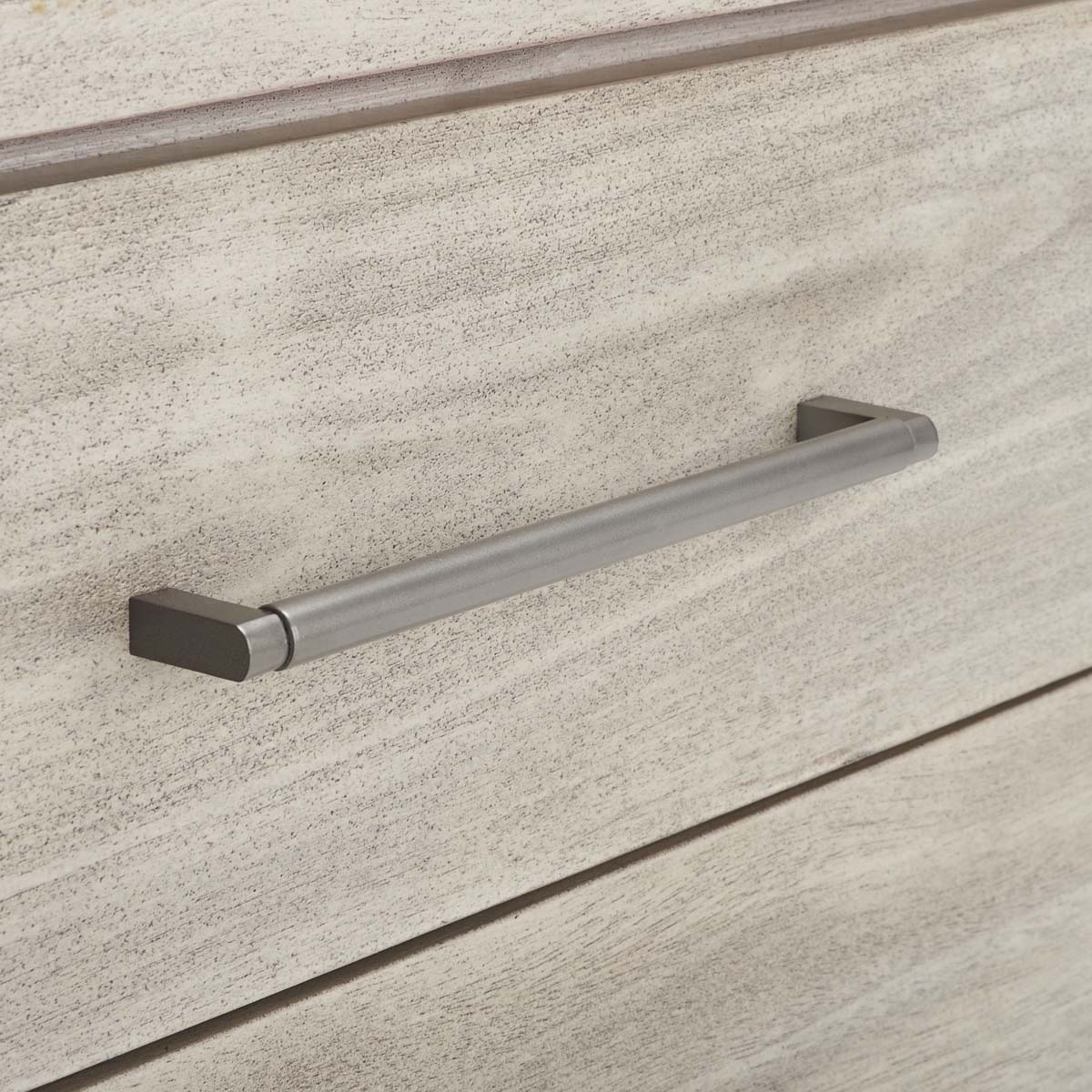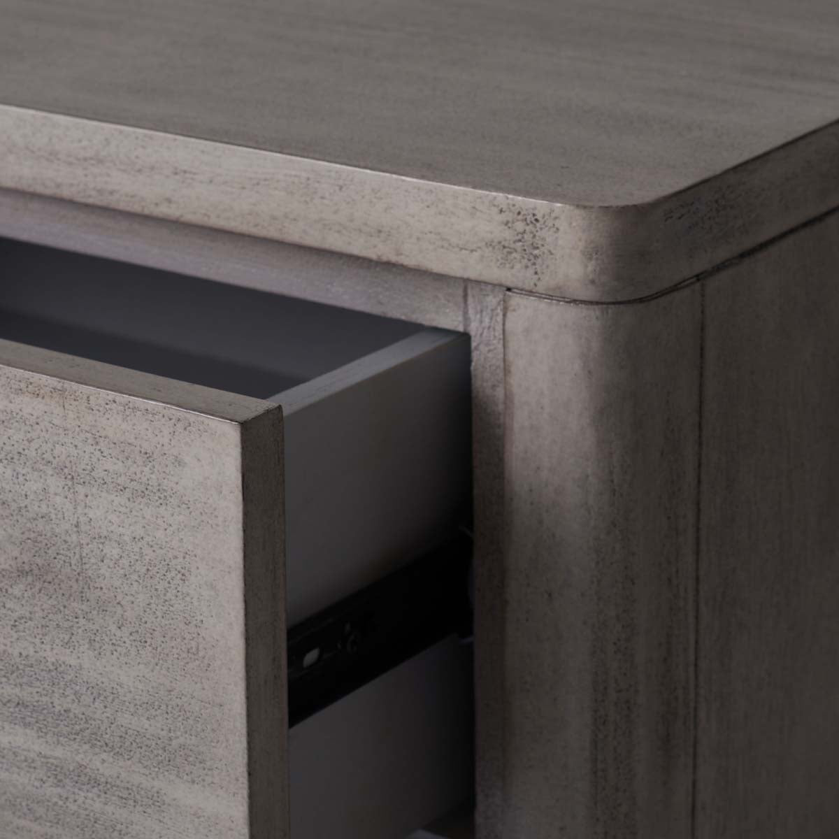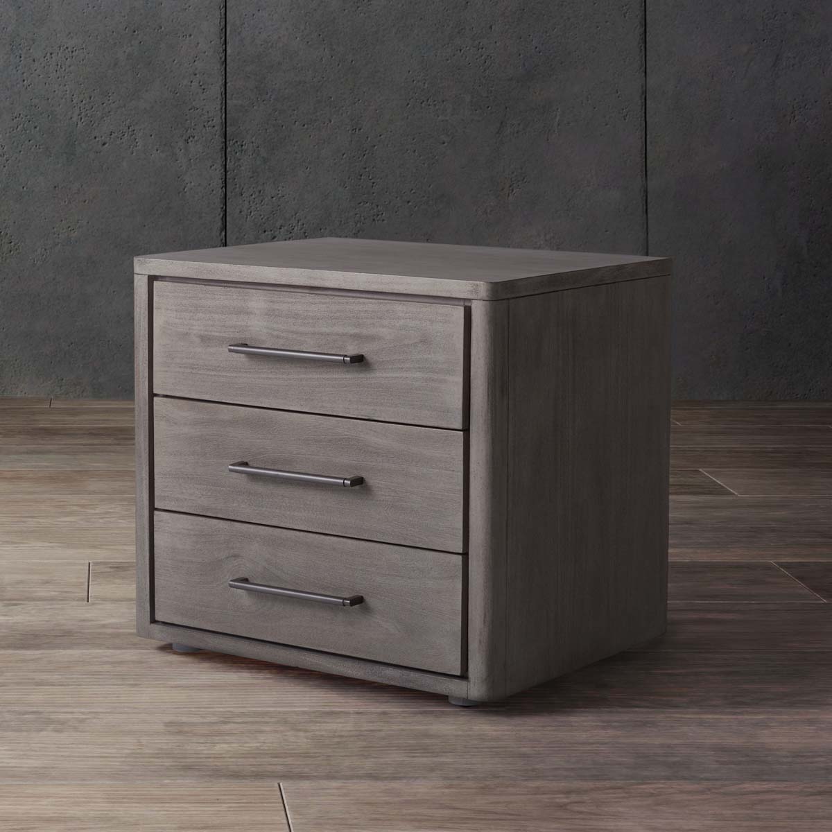 This outstanding Rosey Nightstand is at once elegant and discrete, making it ideal for today's classic-contemporary bedrooms. Rosey's three drawers in light grey mahogany provide ample bedside storage, and antiqued silver bar pulls add a couturier touch.
