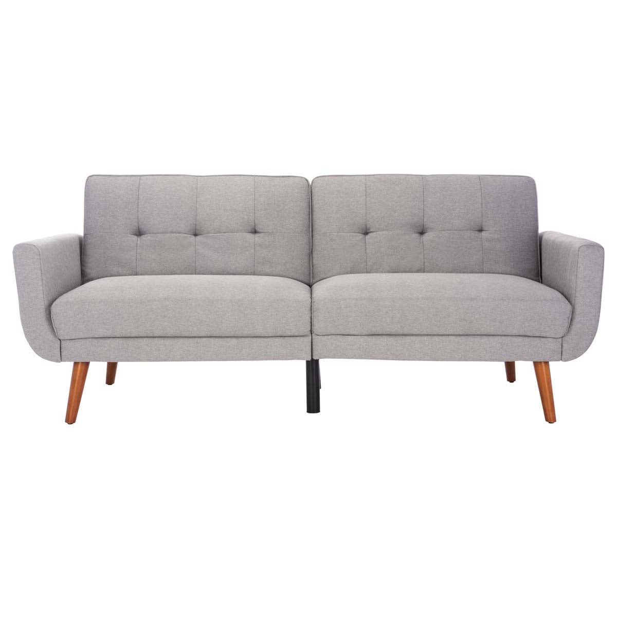 The cutting edge retro spin on this contemporary foldable futon bed delivers two stylish pieces in one. Designed with clean lines and gentle curves, its neutral grey polyester upholstery features charming tufts. Its natural wood legs make it a classic.