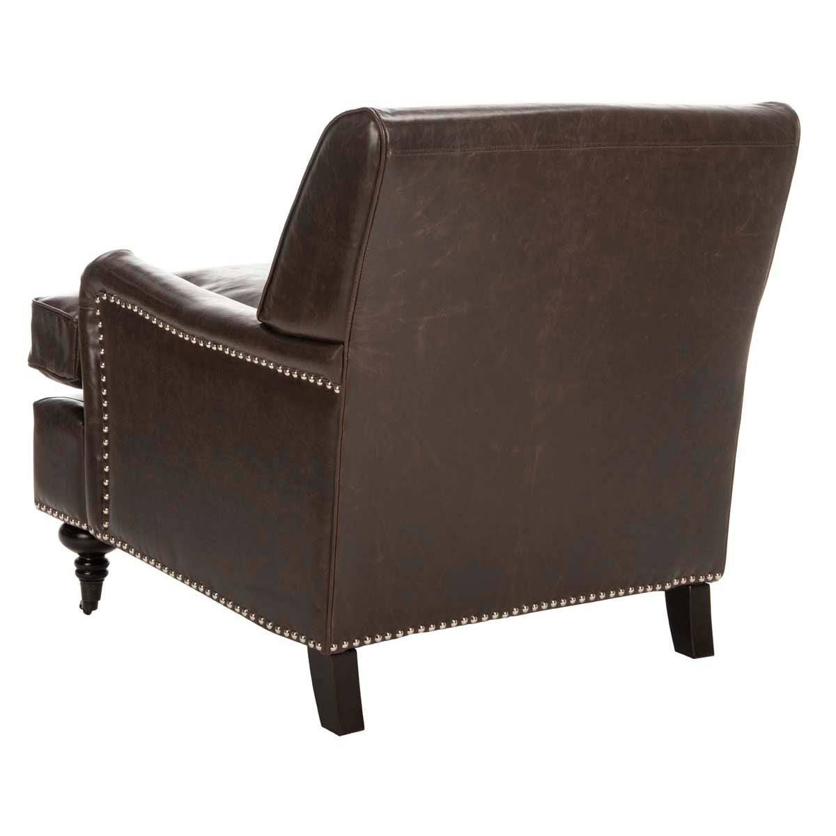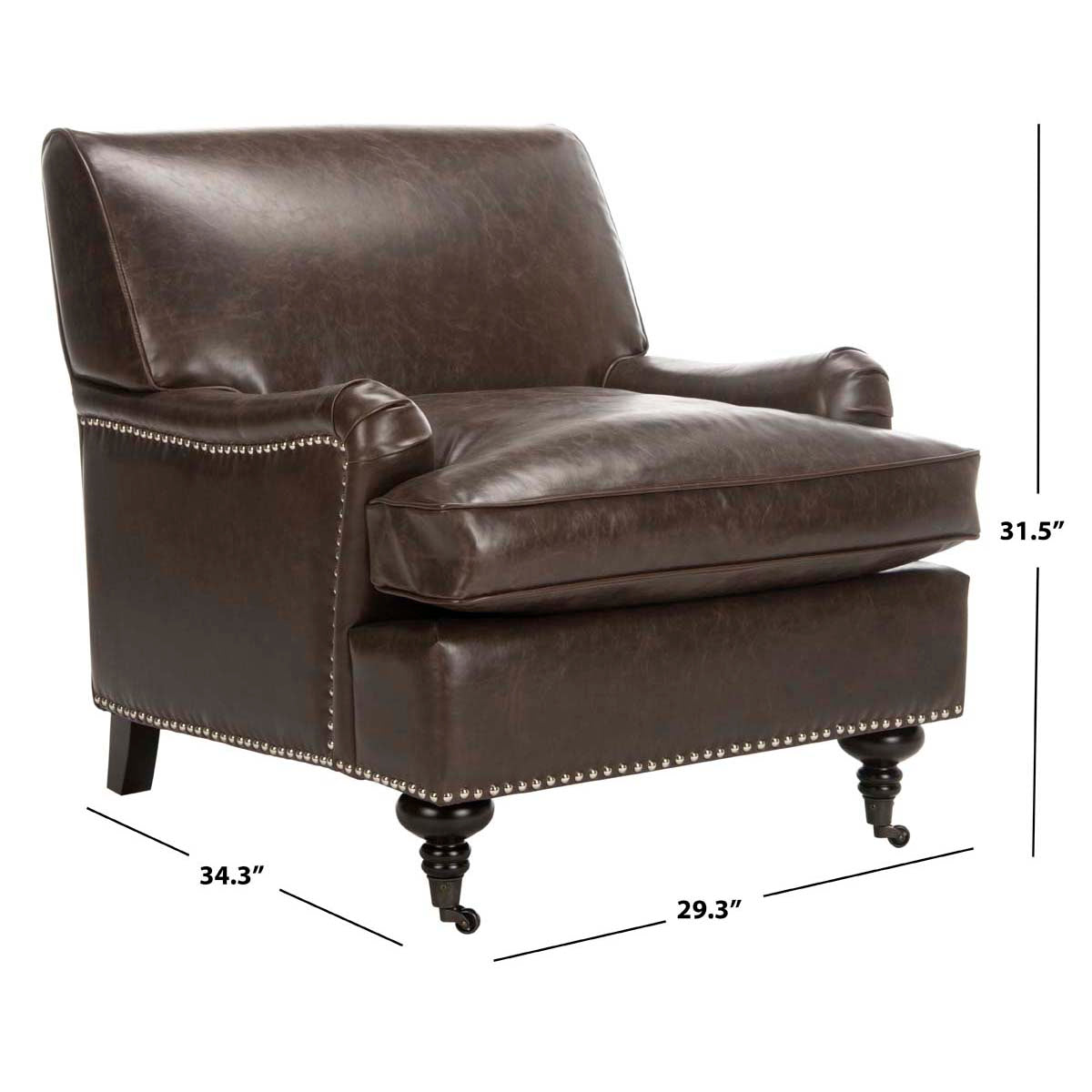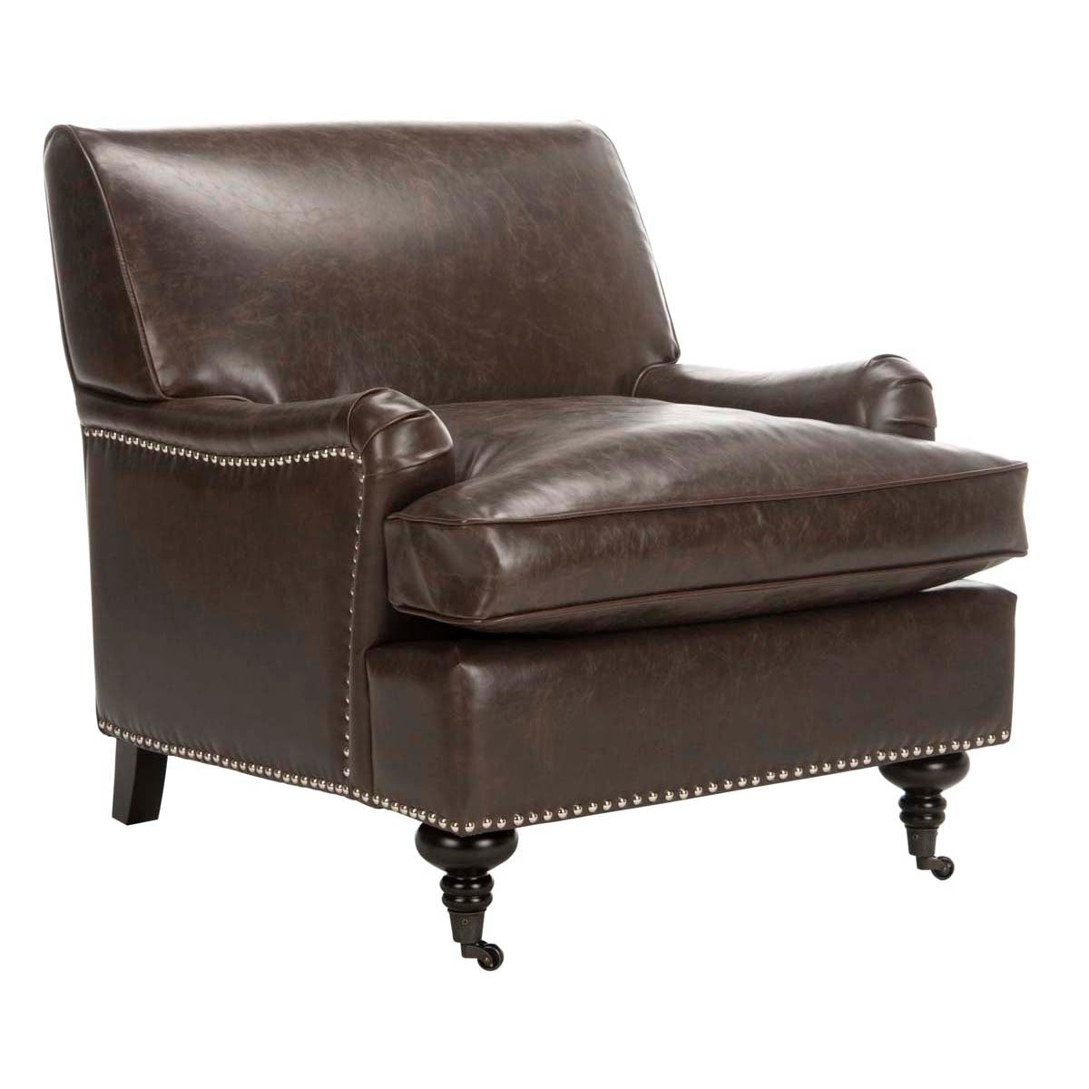 Sit back and relax in the sophisticated yet inviting Chloe Club Chair. With turned birch wood legs on casters in a striking espresso finish, this transitional design features low arms and antique brown PU leather cushions with silver nail head trim.