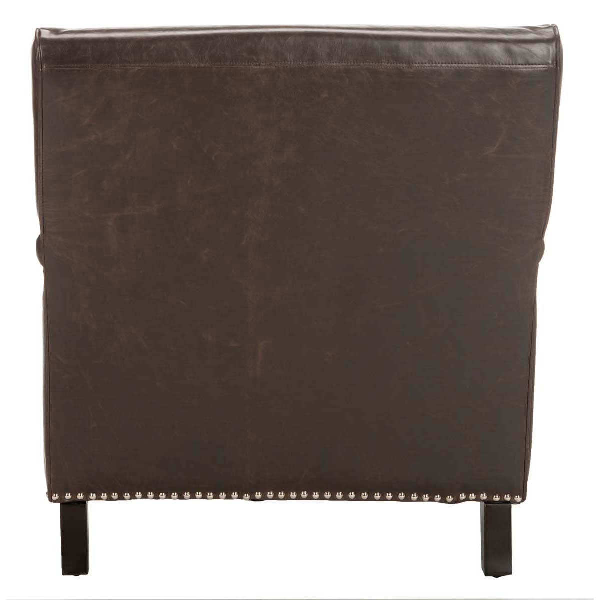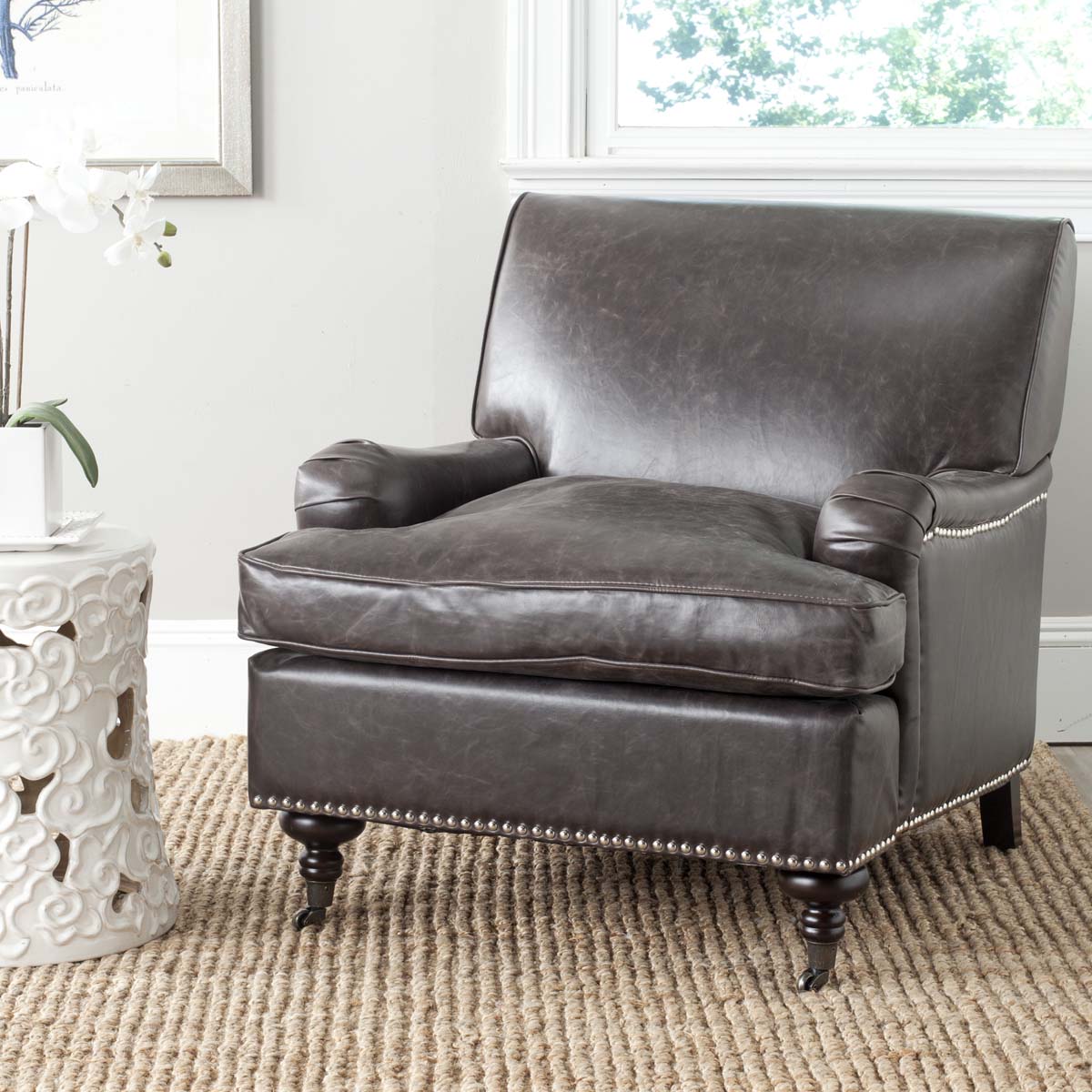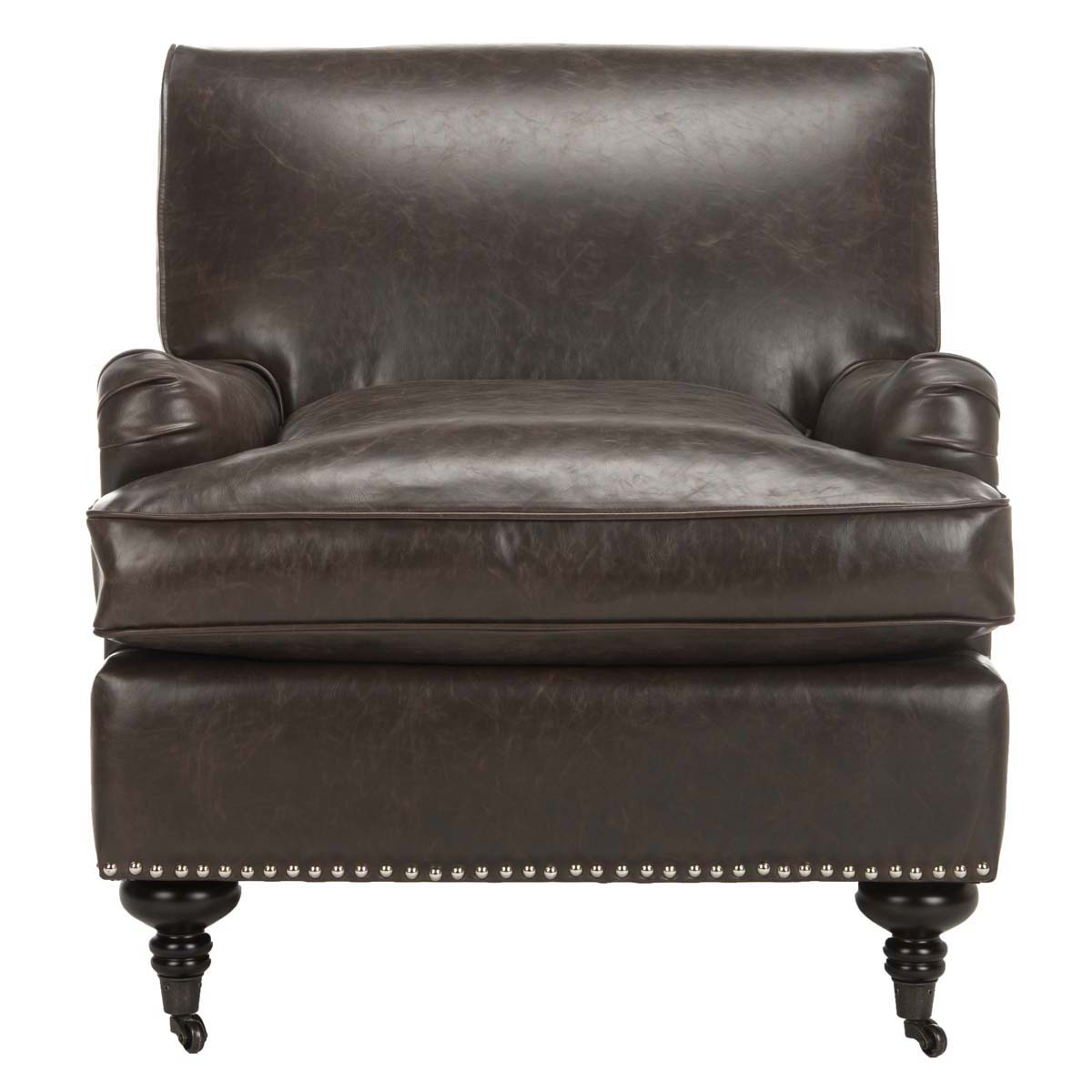Sit back and relax in the sophisticated yet inviting Chloe Club Chair. With turned birch wood legs on casters in a striking espresso finish, this transitional design features low arms and antique brown PU leather cushions with silver nail head trim.