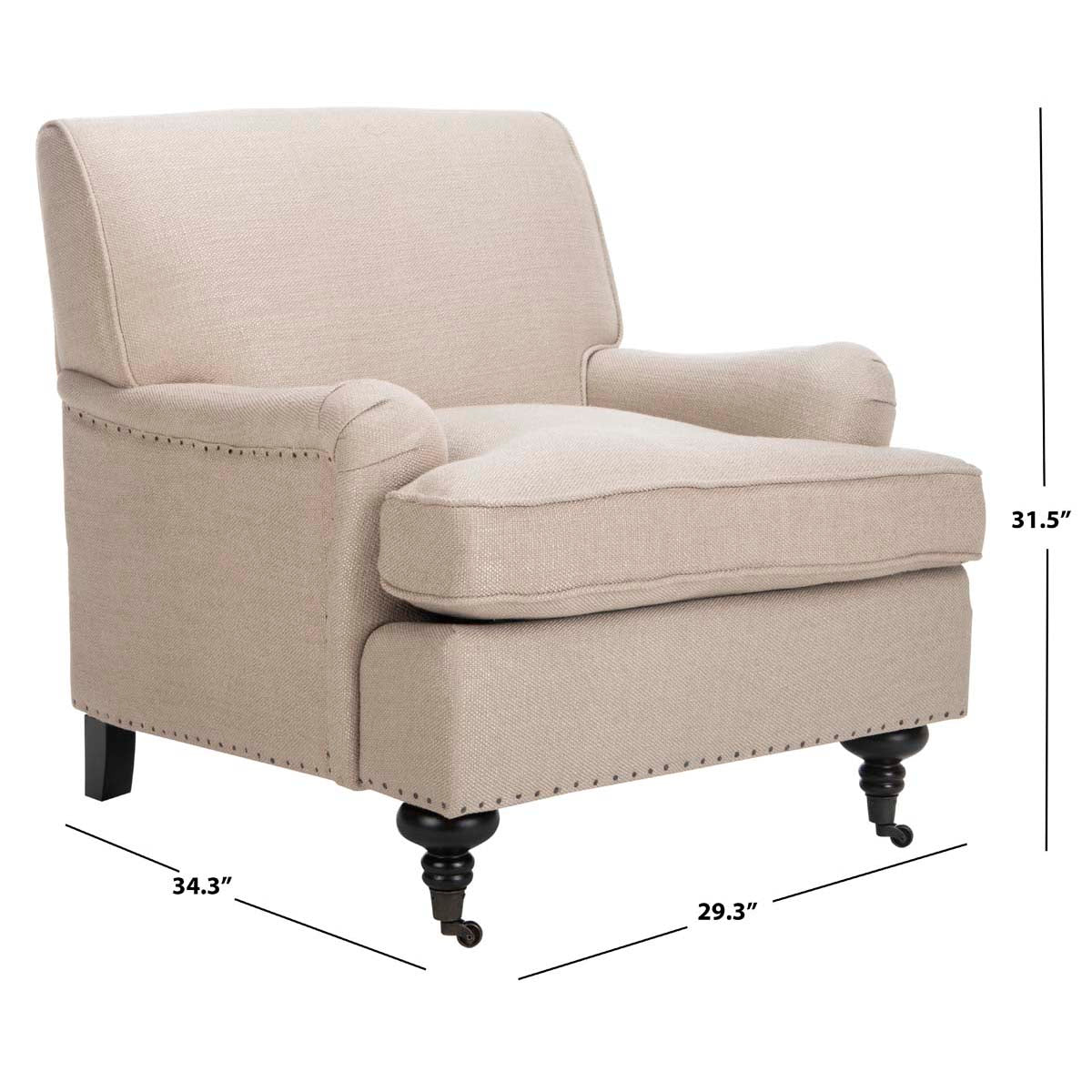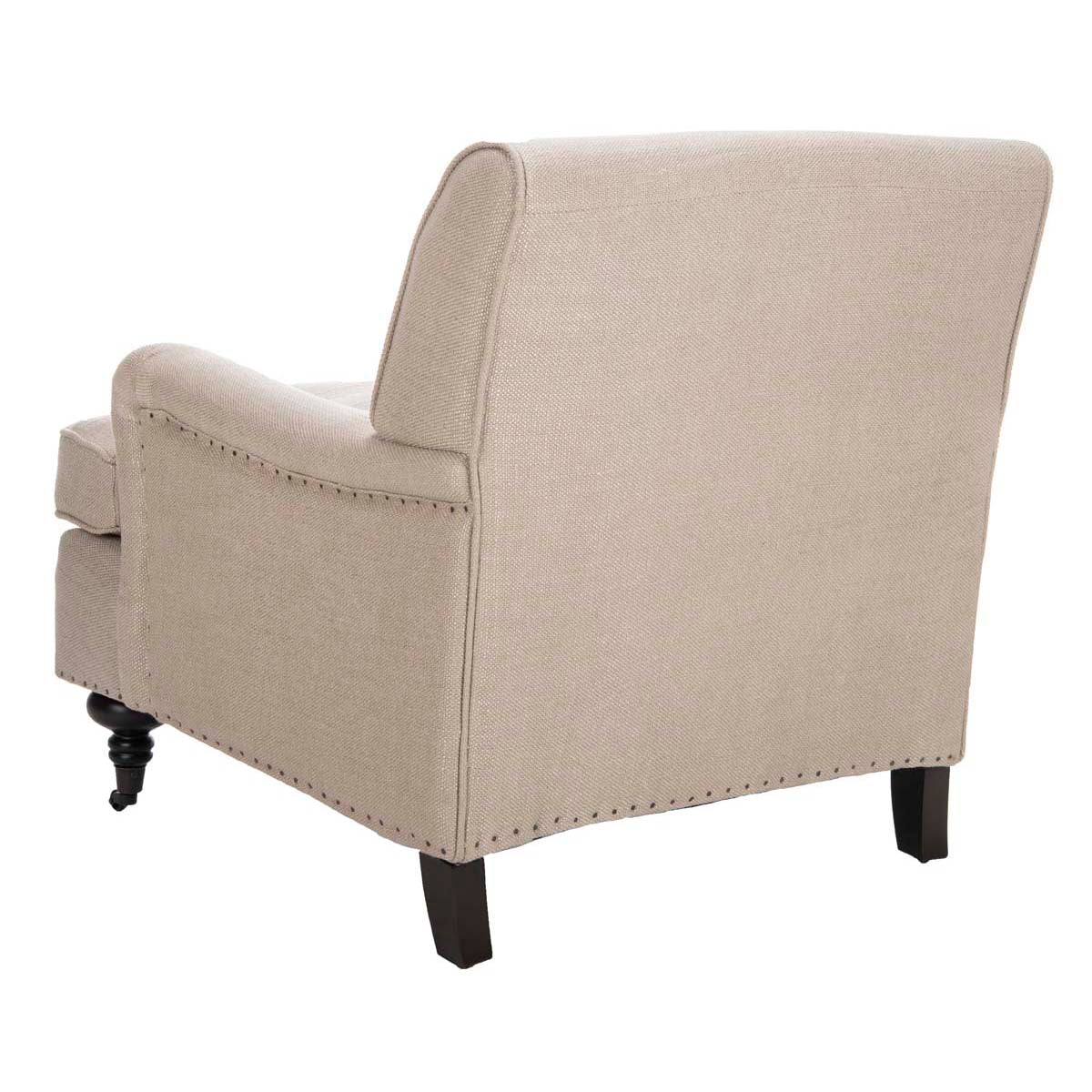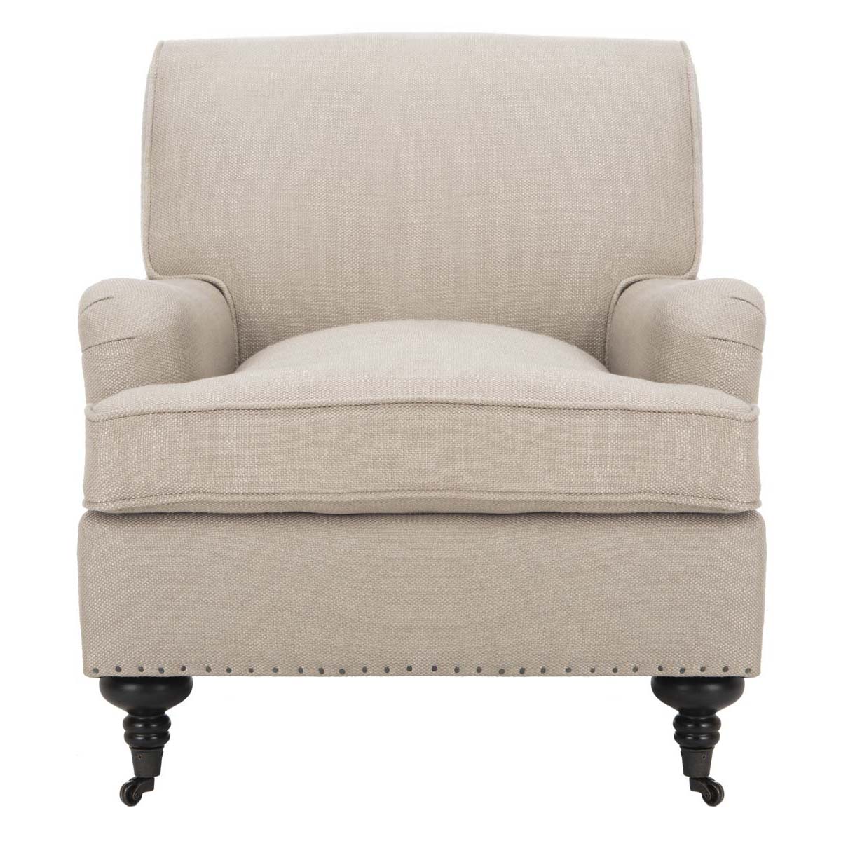 Sit back and relax in the sophisticated yet inviting Chloe Club Chair. With turned birch wood legs on casters in a striking espresso finish, this transitional design features low arms and viscose linen cushions in antique gold with black nail head trim.