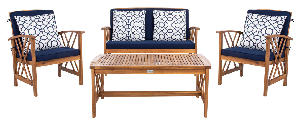 A distinctive double X motif adorns the sides of this Fontana 4 Piece Outdoor Living Set for a luxe transitional look. Masterfully crafted of sustainable acacia wood in a chic natural finish, this stylish set comes with navy all weather cushions and mosaic accent pillows.