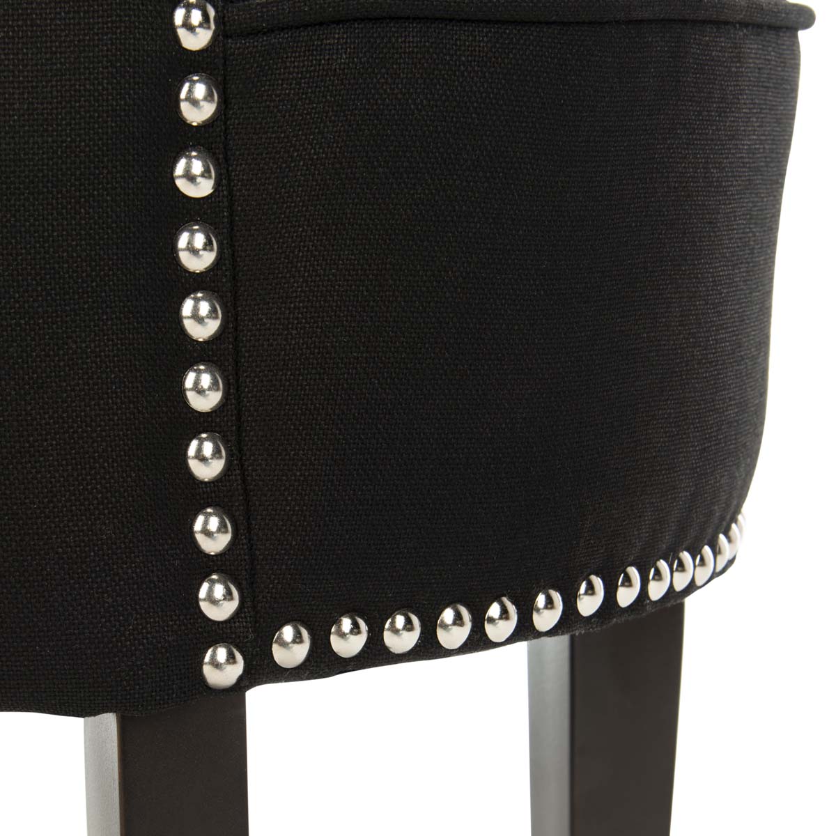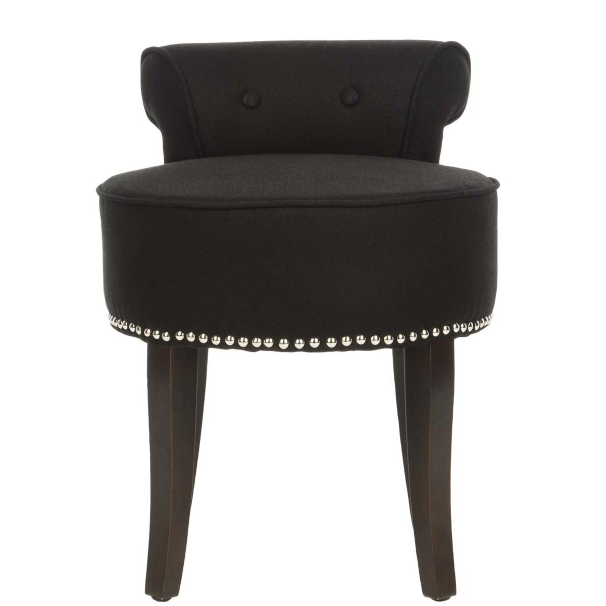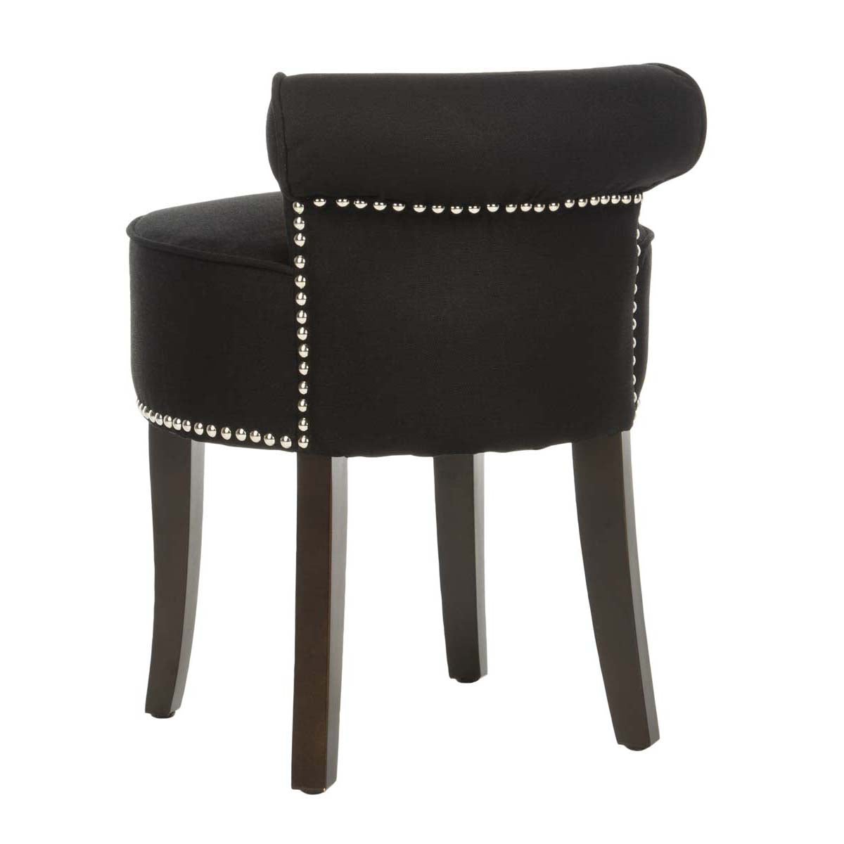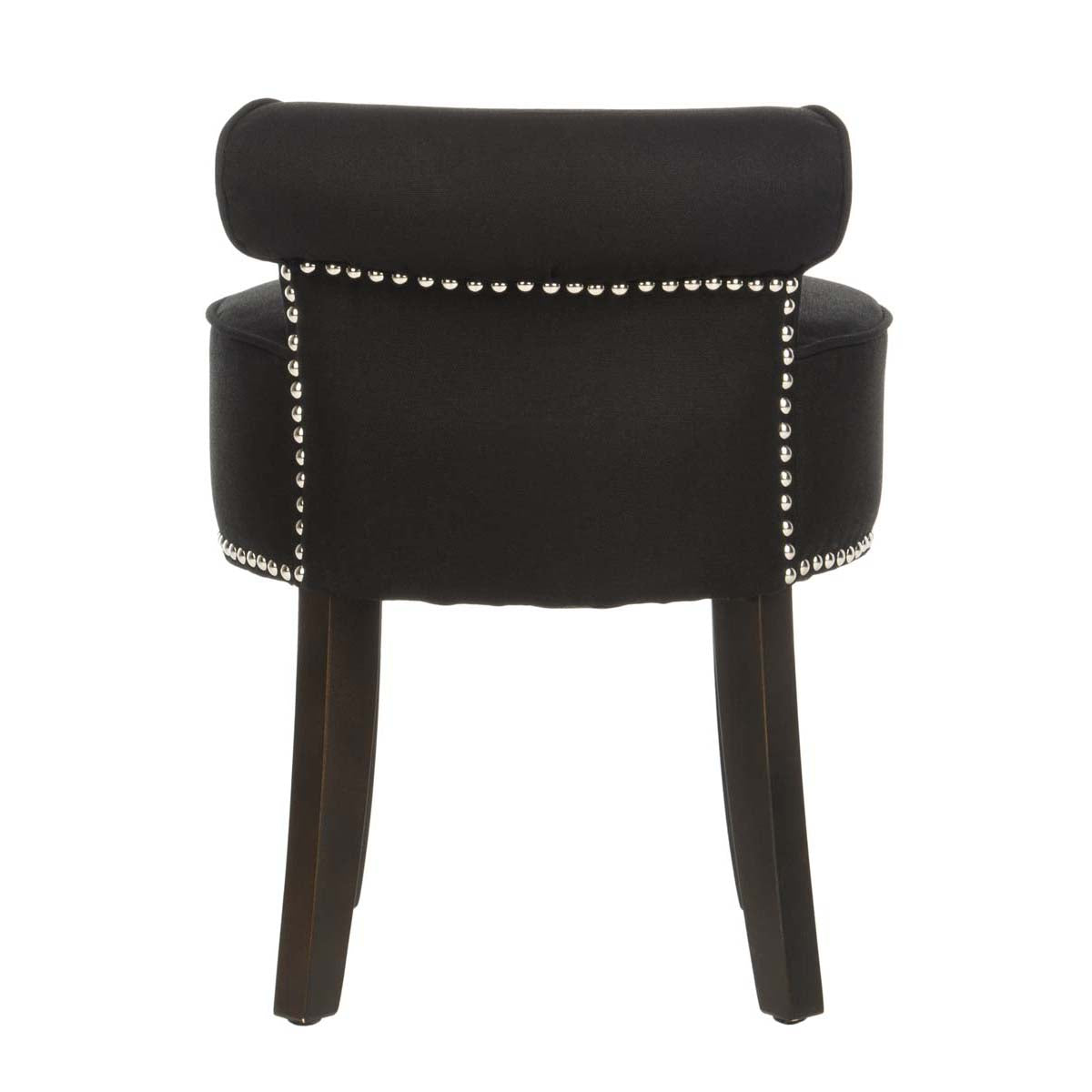 The adorable Georgia vanity chair is petite enough to tuck in a bathroom or bedroom, and brimming with feminine style. Graceful birch wood legs finished in espresso, deep seat and diminutive button tufted back are designed for indulgent comfort. Upholstered in black linen with self welting and silver nail head trim for a decorator touch.