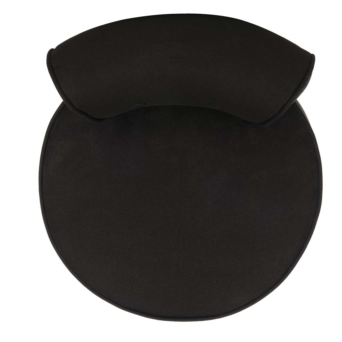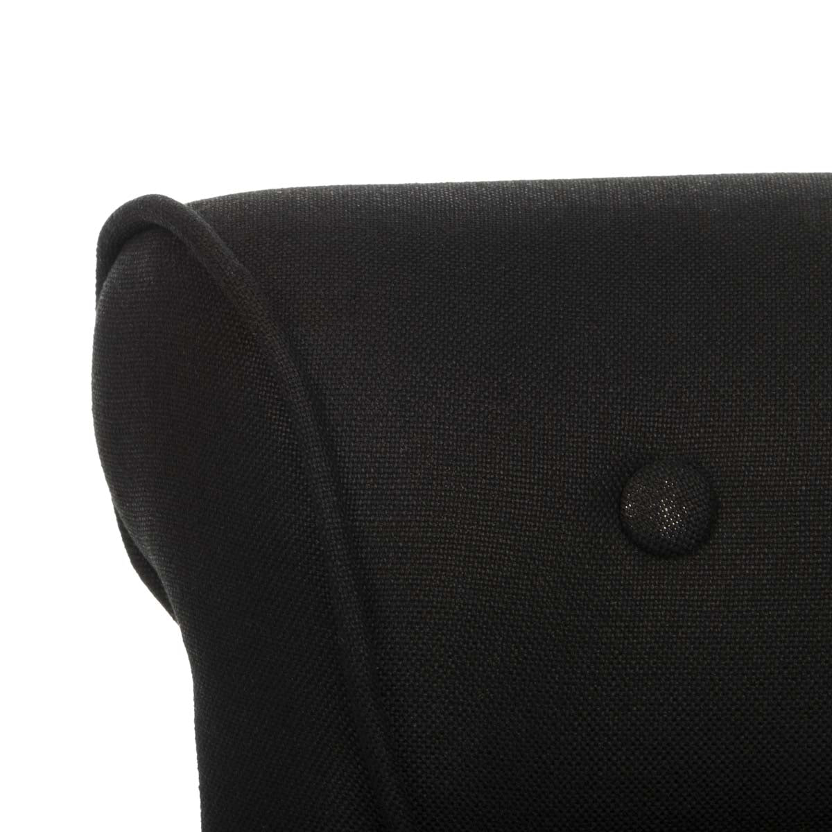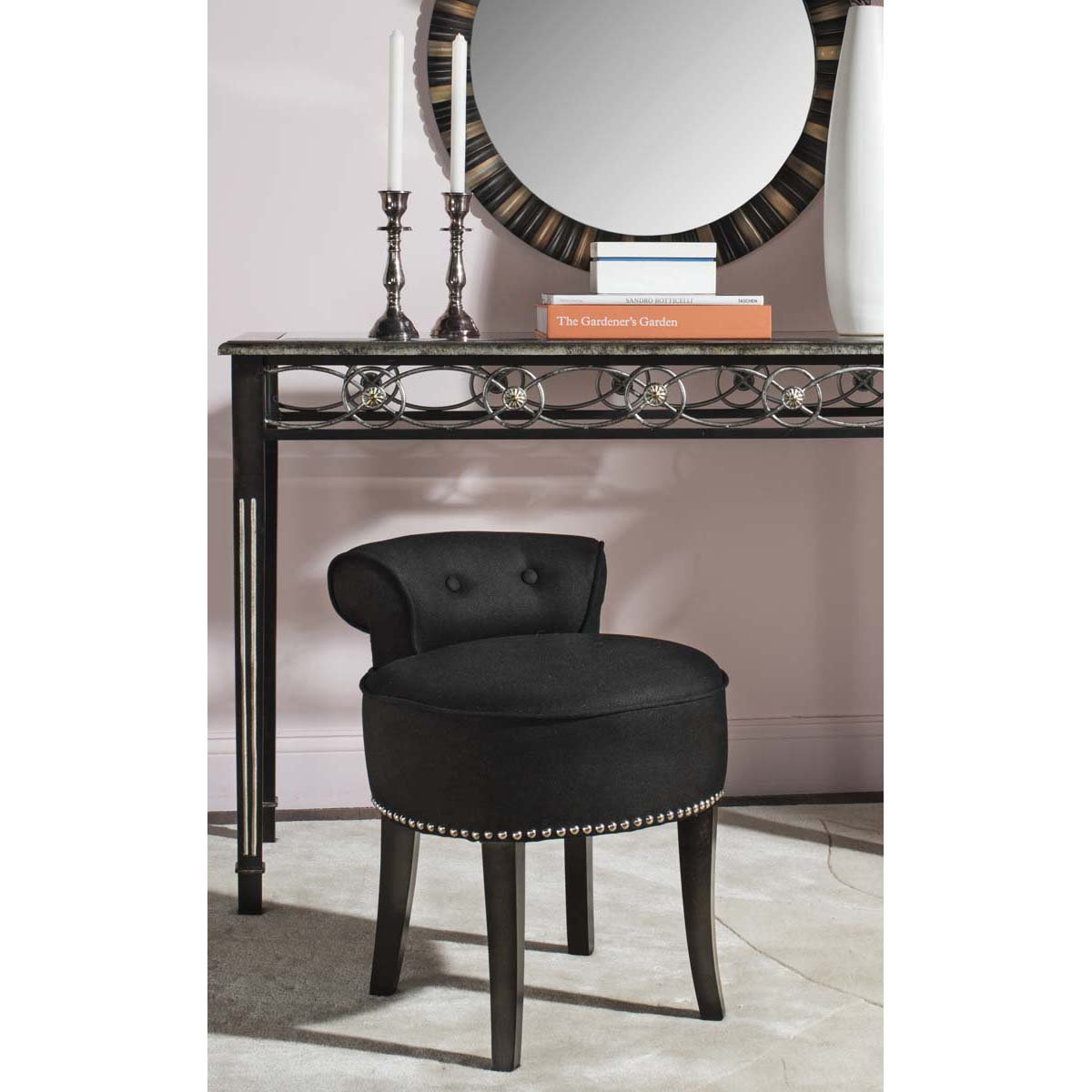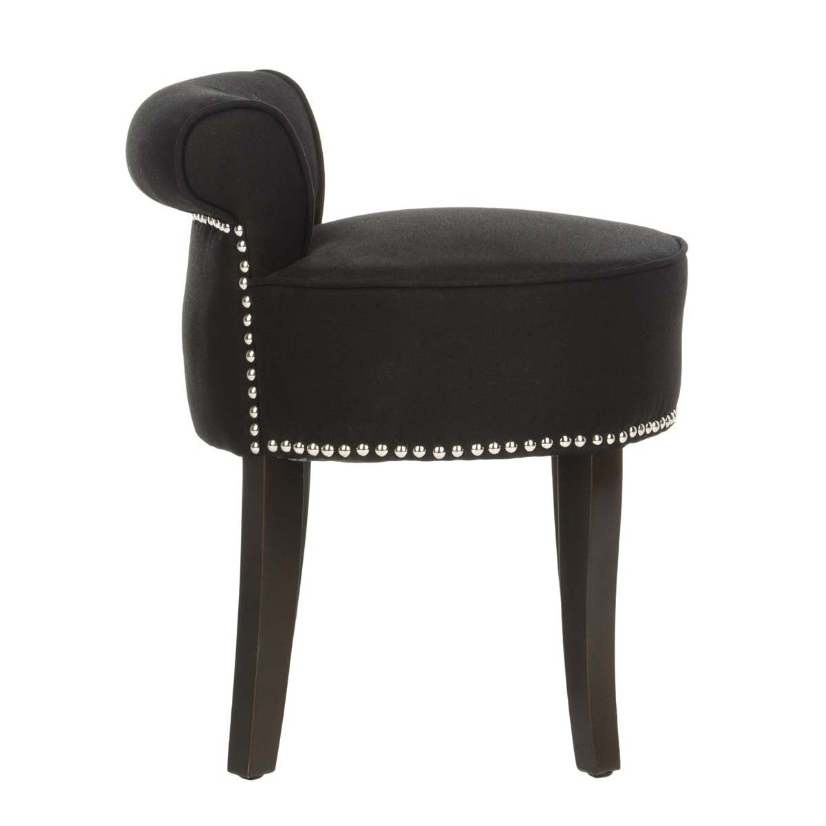 The adorable Georgia vanity chair is petite enough to tuck in a bathroom or bedroom, and brimming with feminine style. Graceful birch wood legs finished in espresso, deep seat and diminutive button tufted back are designed for indulgent comfort. Upholstered in black linen with self welting and silver nail head trim for a decorator touch.