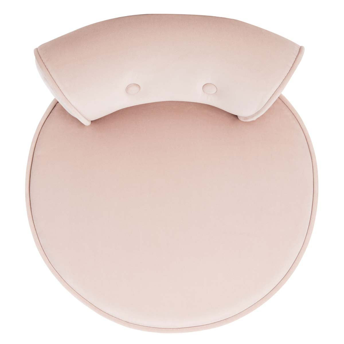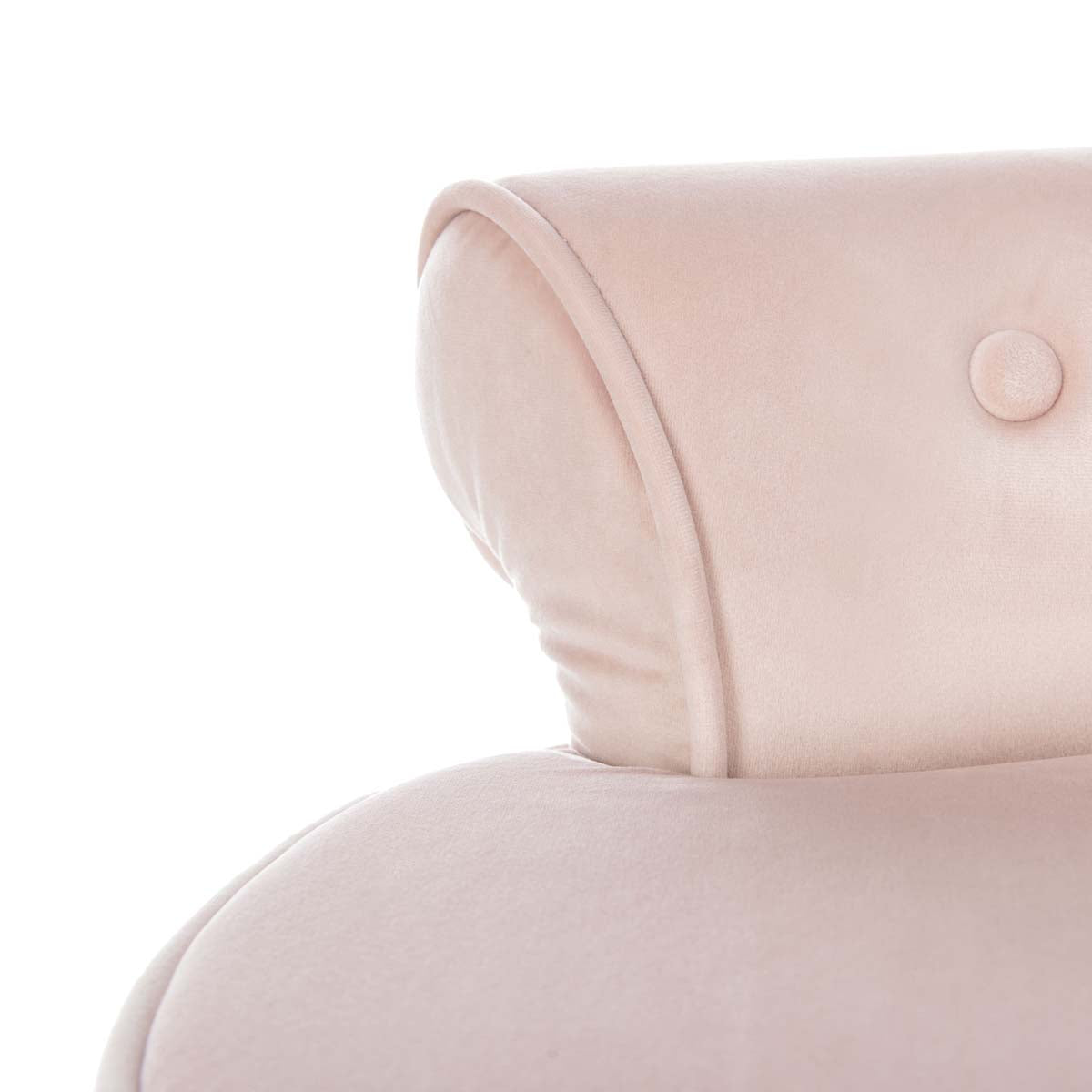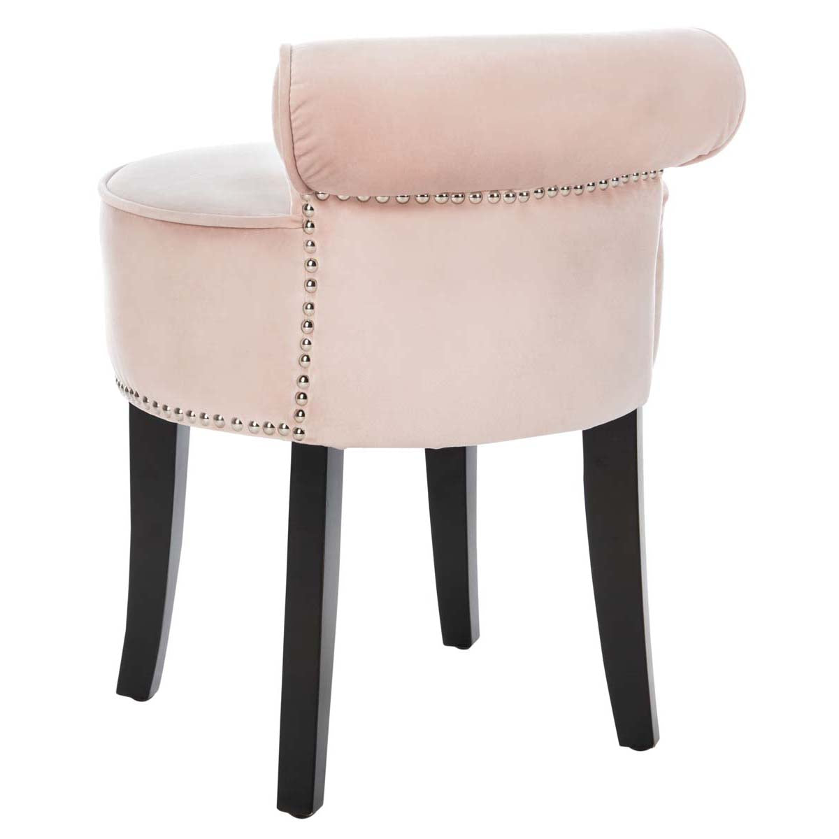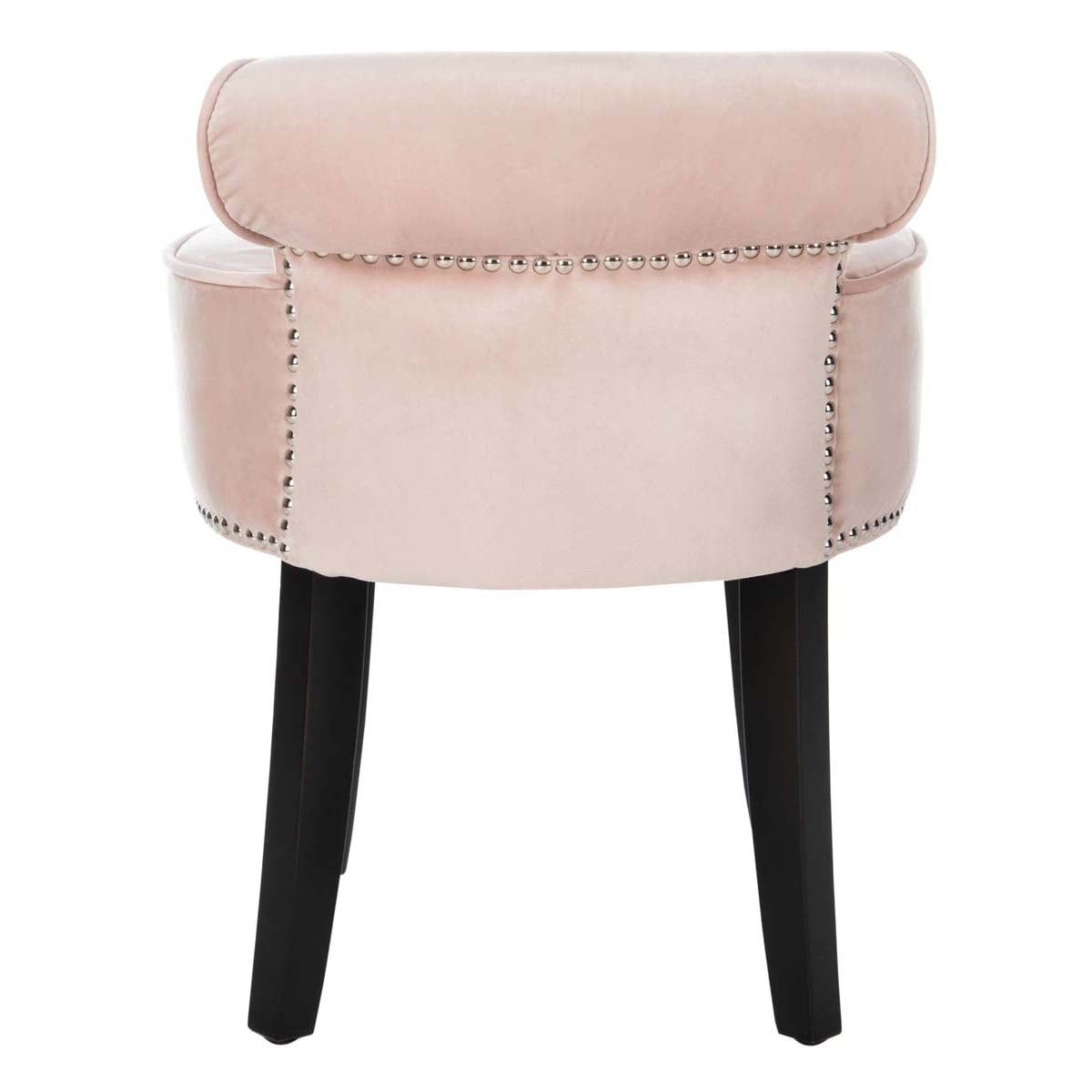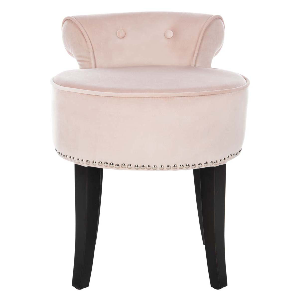 The adorable Georgia vanity chair is petite enough to tuck in a bathroom or bedroom, and brimming with feminine style. Graceful birch wood legs finished in espresso, deep seat and diminutive button tufted back are designed for indulgent comfort. Upholstered in blush pink velvet with self welting and silver nail head trim for a decorator touch.