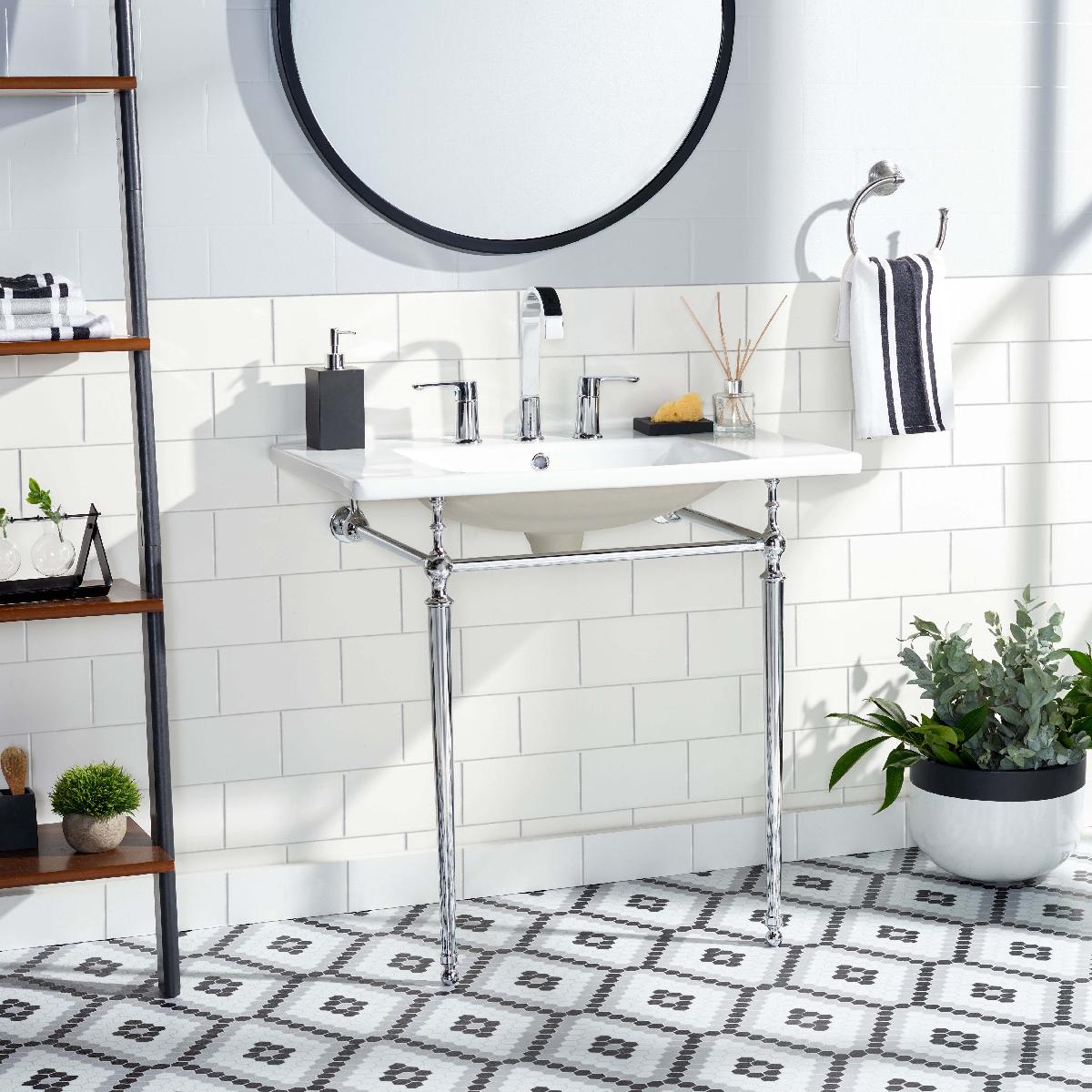 A sleek modern take on classic Edwardian designs, this Hamilton Sink Console is effortlessly elegant. Hamilton?? polished chrome frame beautifully updates its timeless ball feet and gently turned accents, making it a must-have for today?? high-style bathrooms.