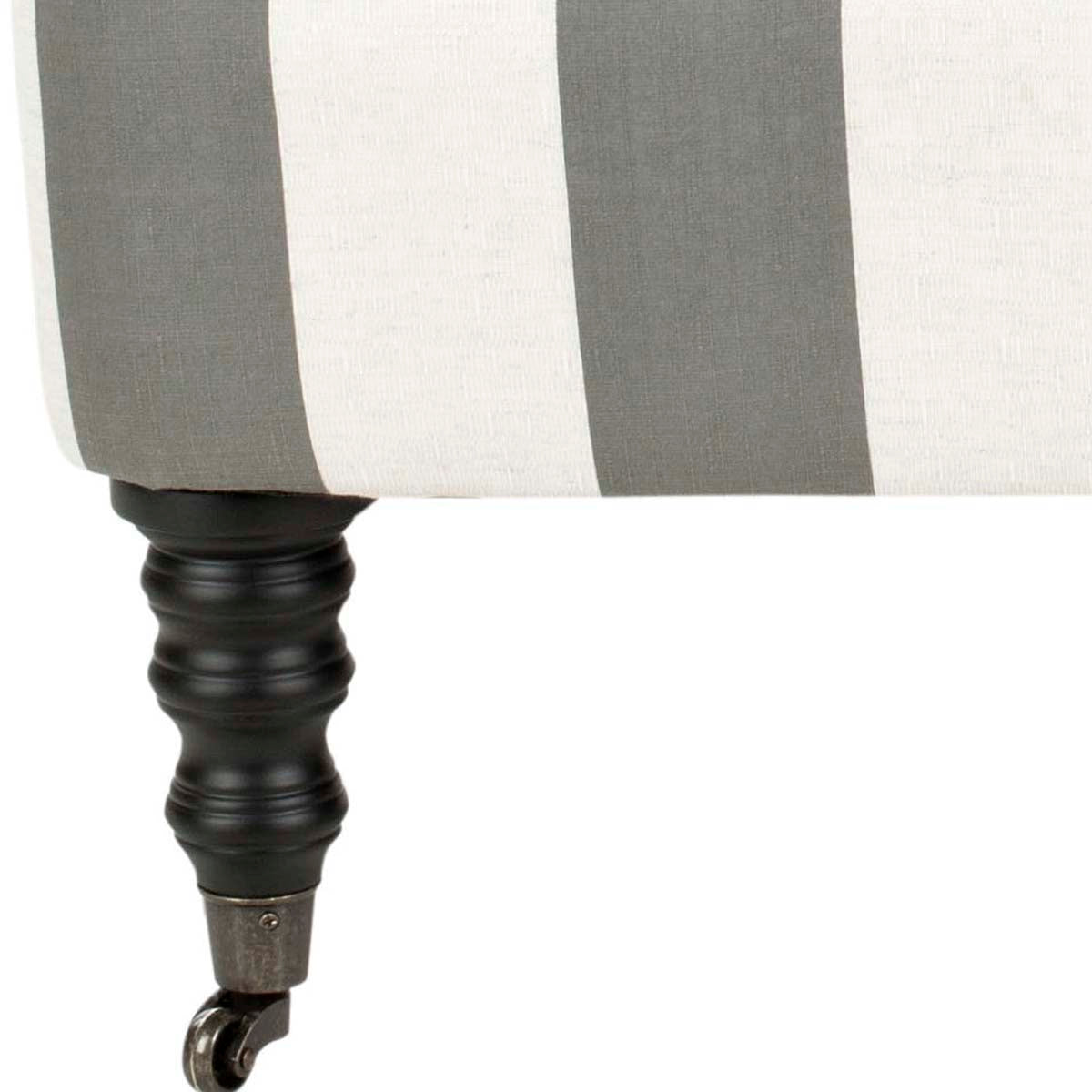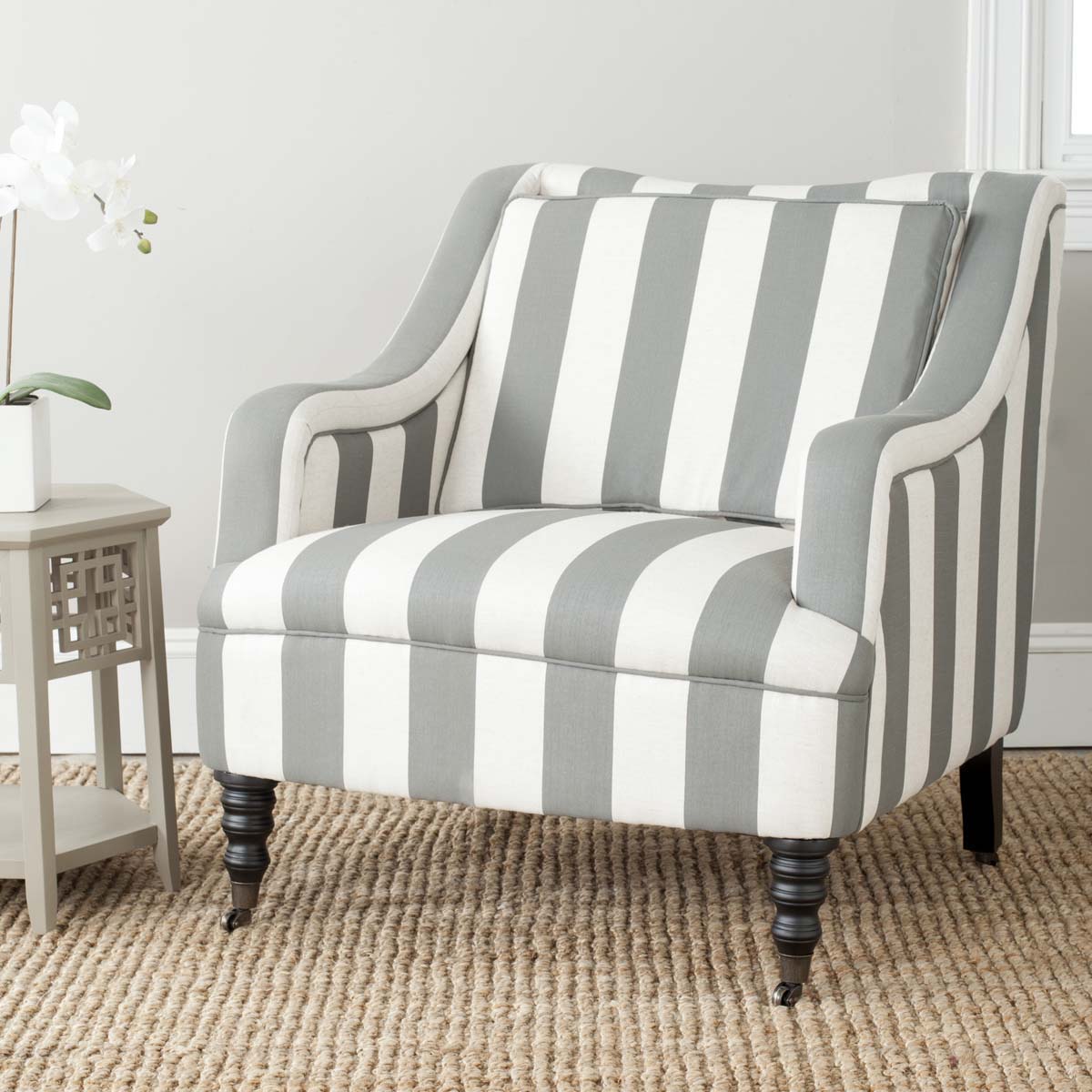 Sloping arm rests, pillow backrest, and plush seat cushion make the Homer Arm Chair a go to classic. A chic grey and white awning stripe is a fresh, fun look; gracefully turned birch wood legs on casters give Homer a contemporary spin.