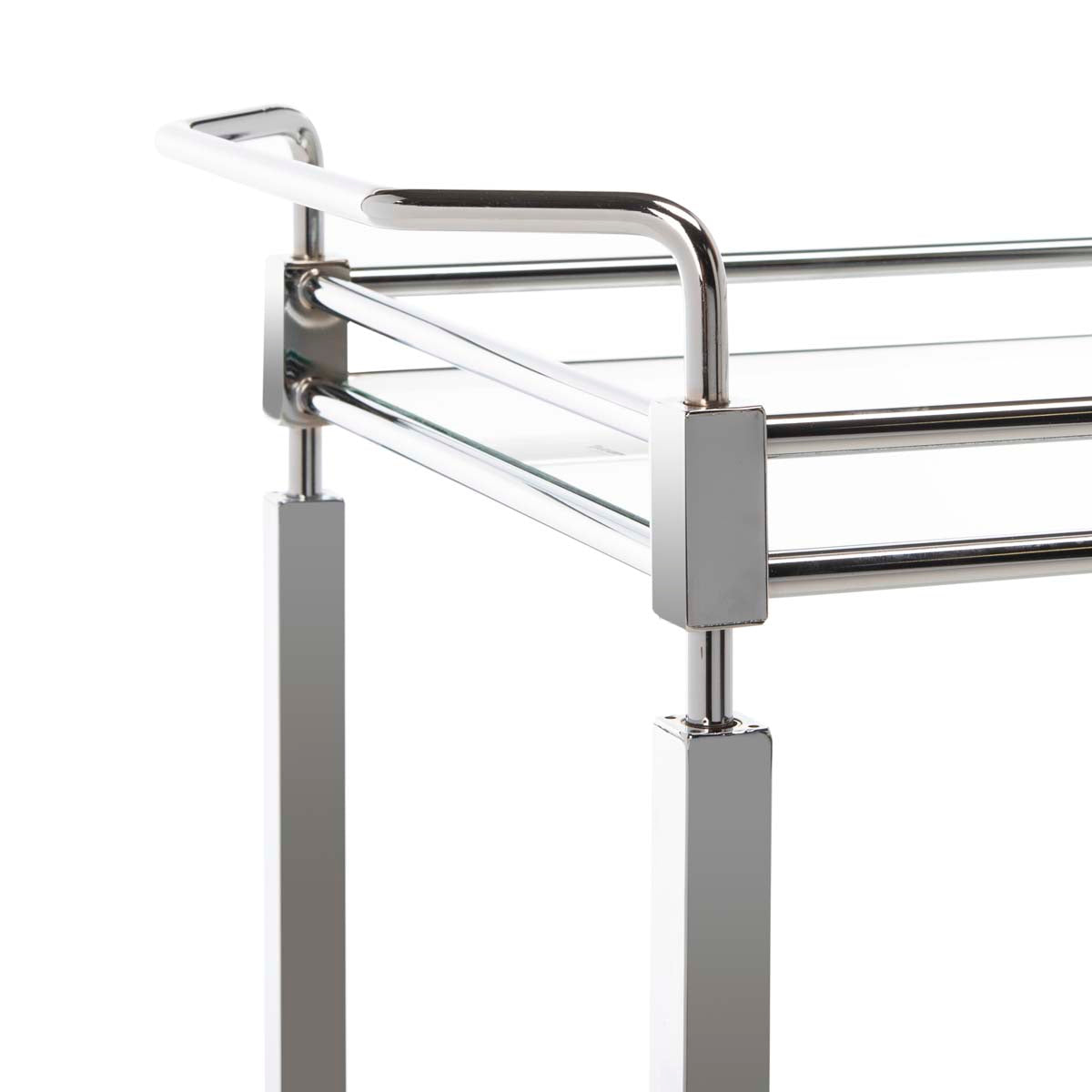 Imbibe in style with this sleek 2 tier rectangle bar cart. Inspired by the decadence of Art Deco design, its luxurious layers of glass and chrome are perfect for displaying drinkware, beverages and accessories. It brings a sophisticated touch to any room.