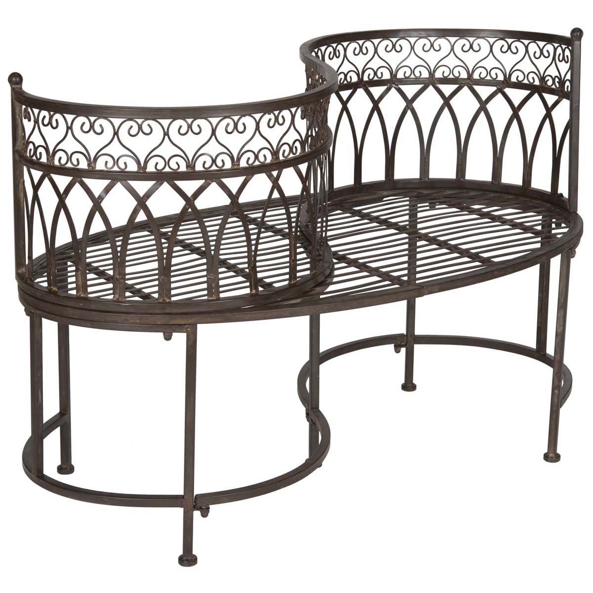 Designed after a Victorian garden staple, this Lara Kissing Bench overflows with vintage charm. Lara's romantic heart shaped details and flourishing scrolls in rustic brown iron lend any outdoor space an enchanting ambiance.