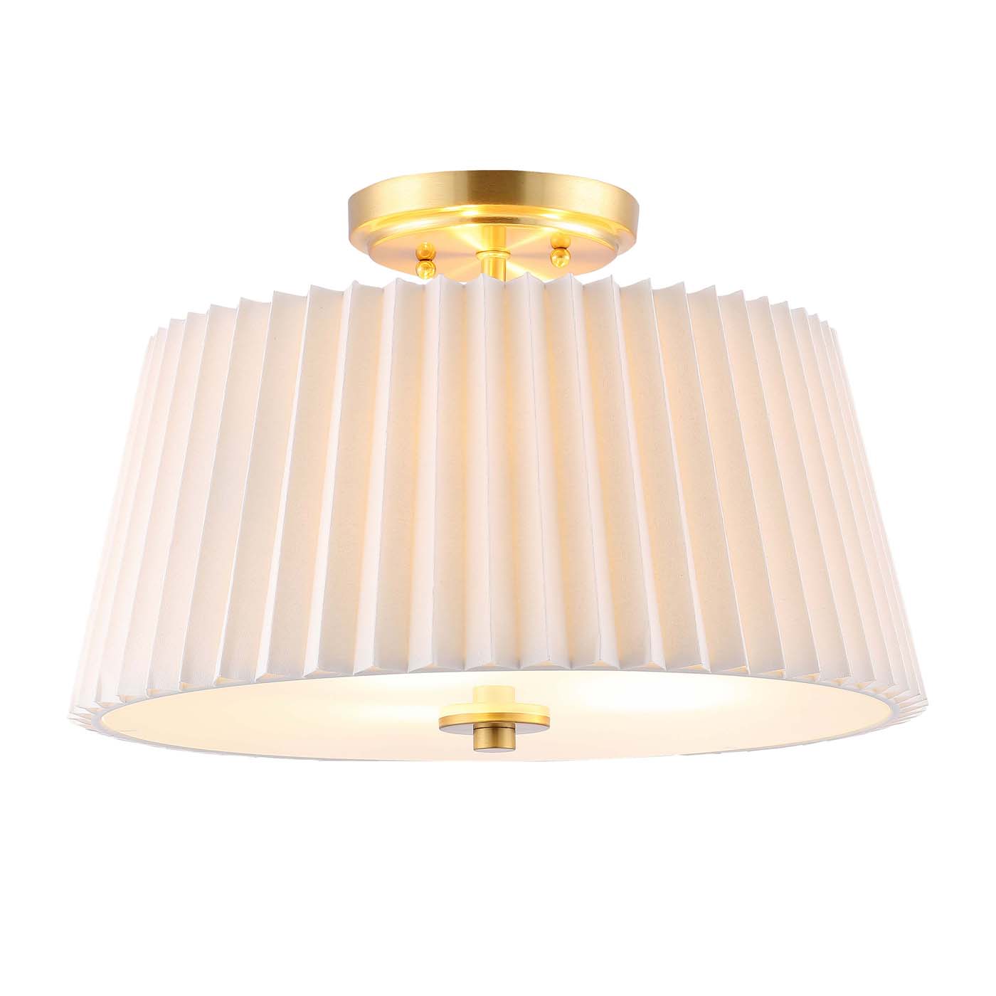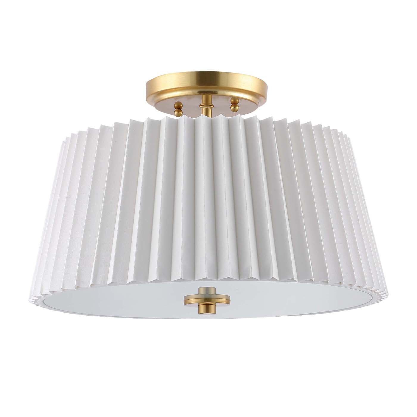 Give your d?cor a touch of tradition with this Larlon Flush Mount. Brass gold accents add a hint of modern glamour to Larlon?? pleated white fabric shade, making it ideal for the classic-contemporary interior.