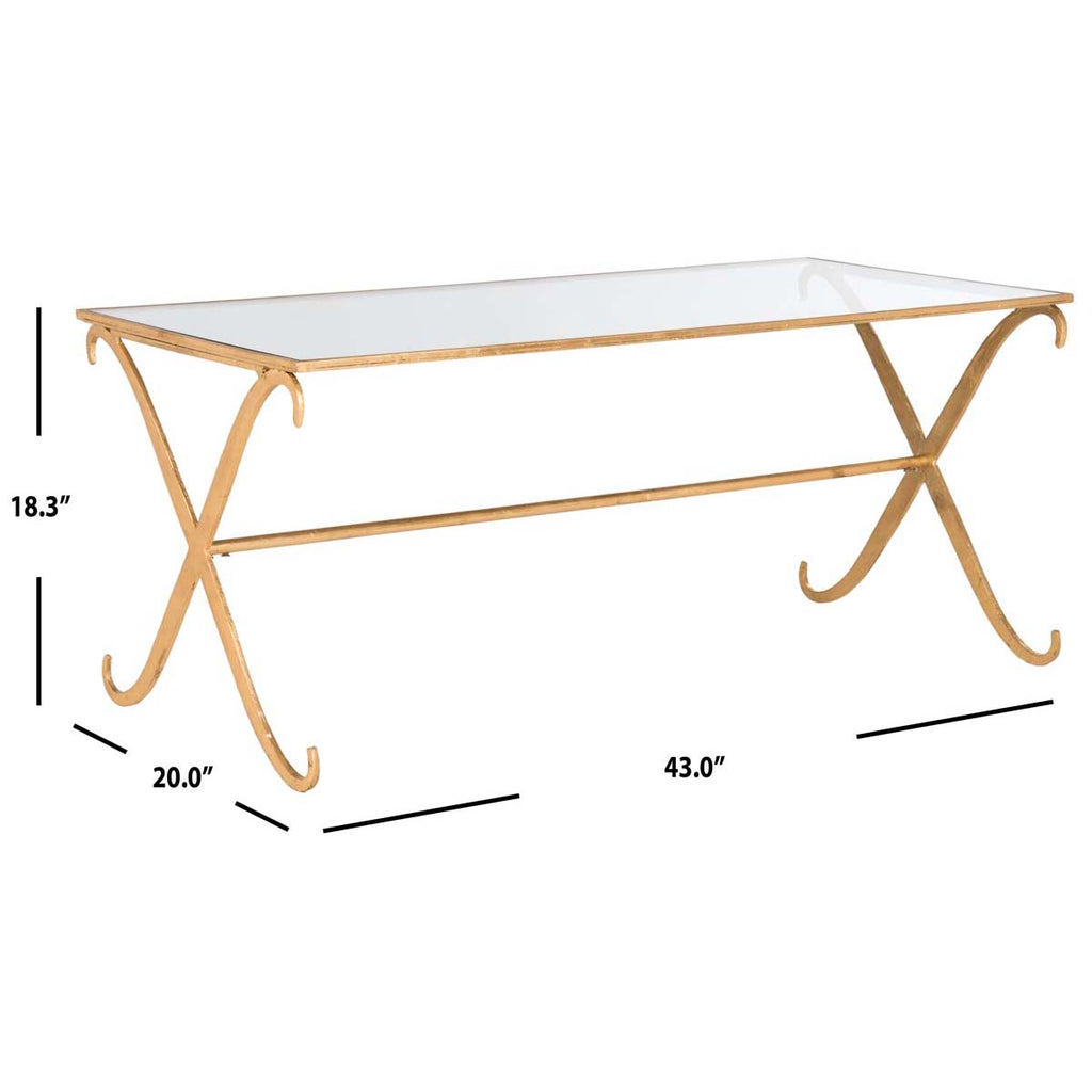 A classic beauty with a touch of whimsy, the Lavar coffee table features crossed legs finished with Venetian inspired curlicues. Crafted of solid iron with gold leafing protected with lacquer, this striking piece is topped with clear tempered glass.