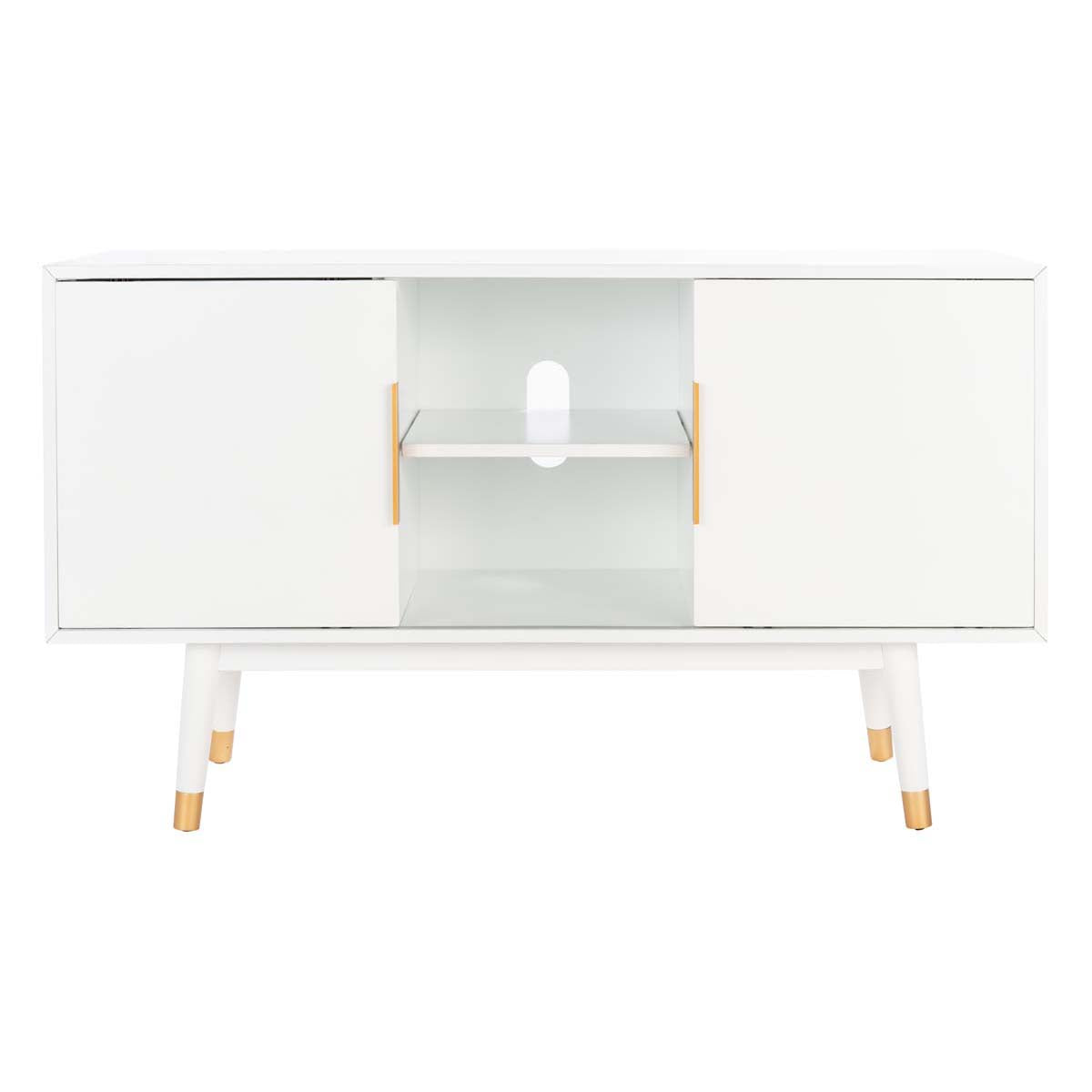 Intelligently designed for the media enthusiast, this Ligia Media Stand boasts fabulous contemporary style and practical design. The brass caps and handles beautifully accent Ligia???s clean white wooden frame with two shelves providing ample space for cable boxes or gaming consoles. A small cut out in the back ensures unsightly wires are kept out of sight.