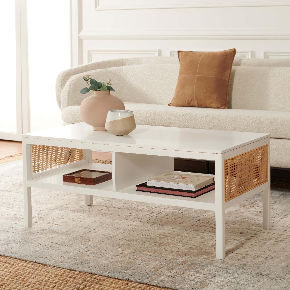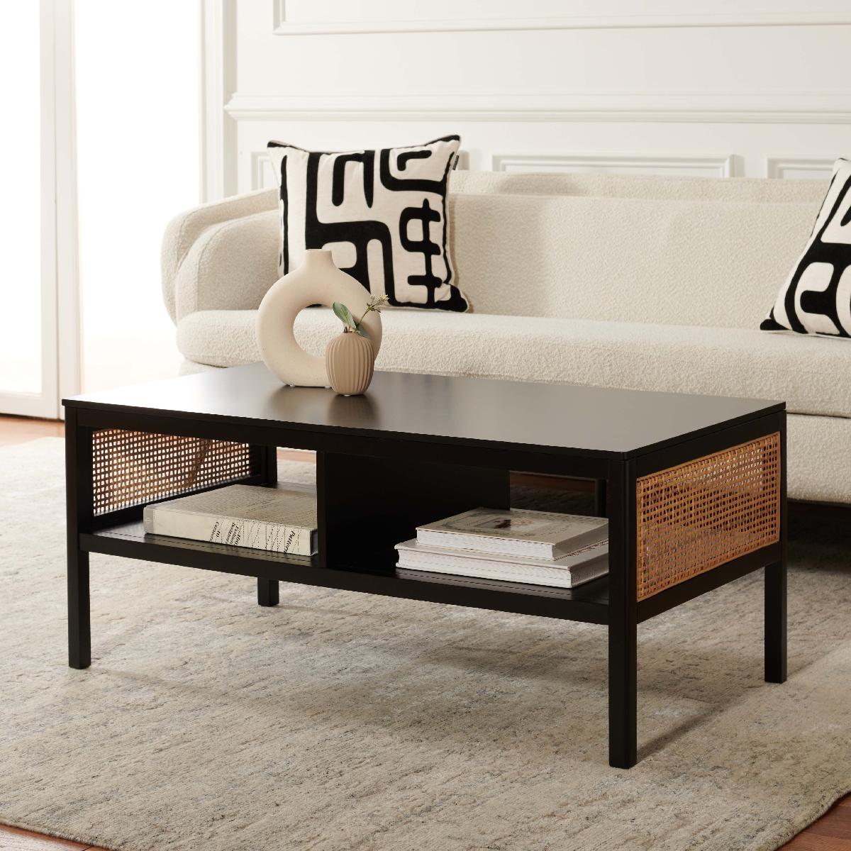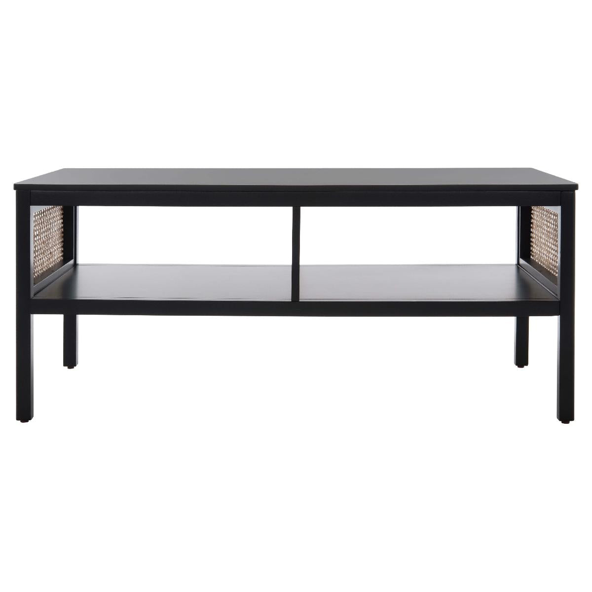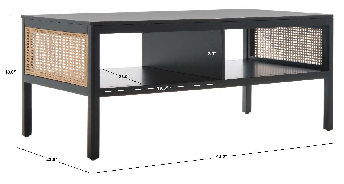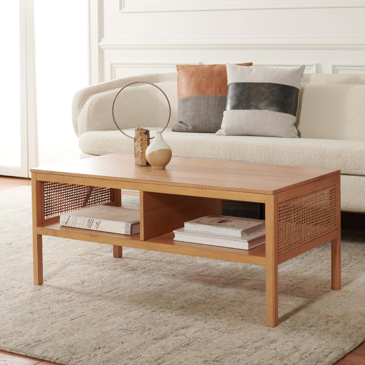 Make a warm and refined statement with our stylish Miya coffee table. Our sleek and streamlined coffee table stands out with a rich textural appeal. A beautiful rattan mesh is juxtaposed against a natural veneer to serve as a warm and inviting centerpiece. Its minimalistic profile evokes relaxed refinement to sit easily in your casual living space, family dens, and bedroom. Our coffee table features two large open shelves to keep your remotes, coasters, and other essentials within easy reach.