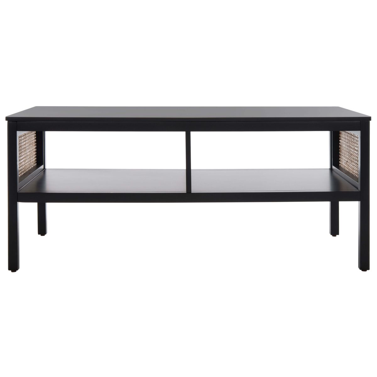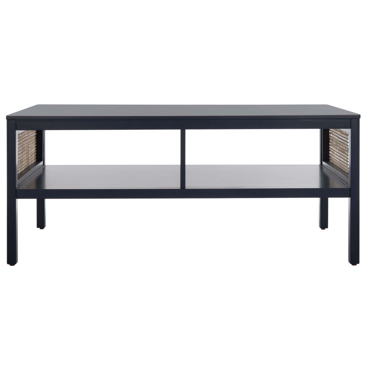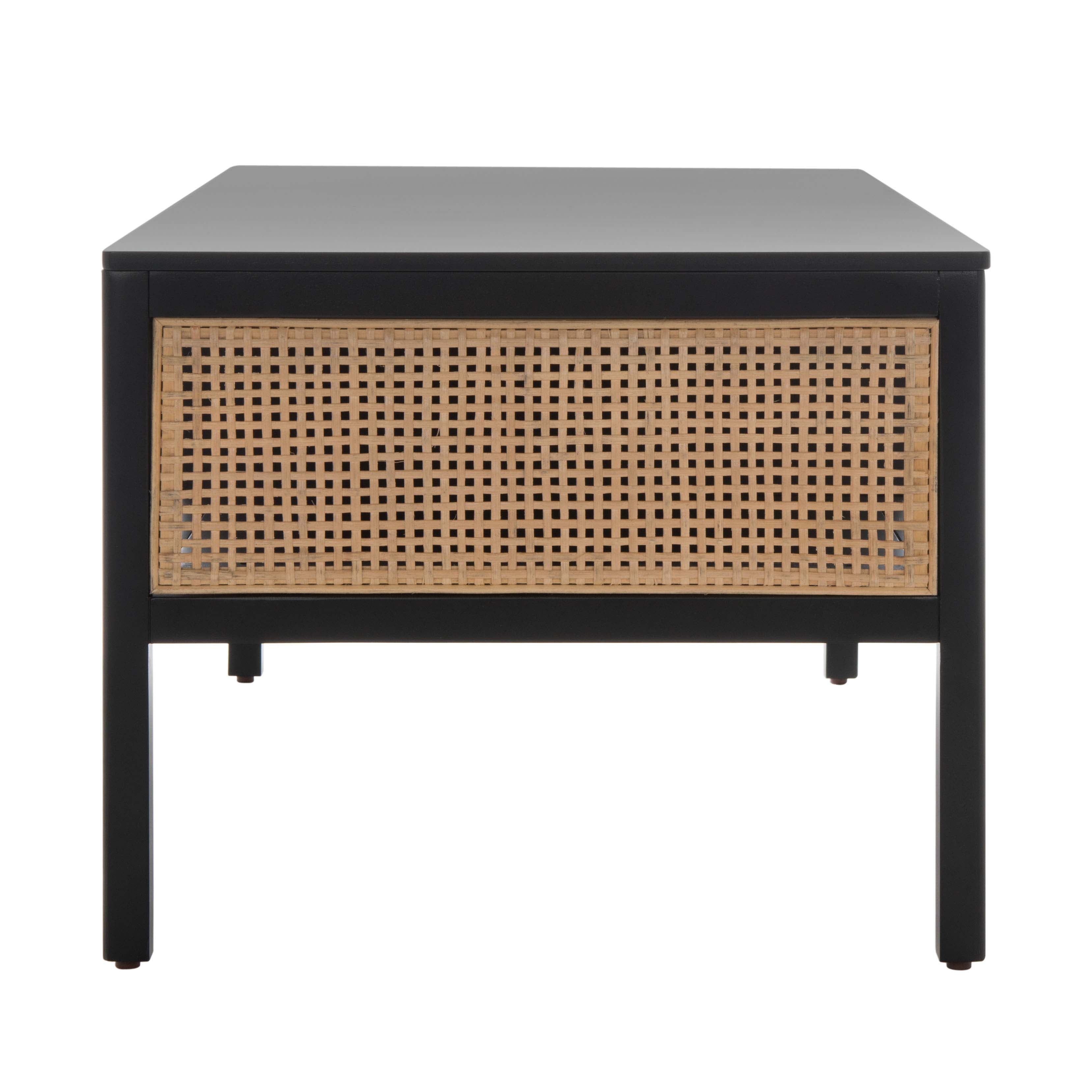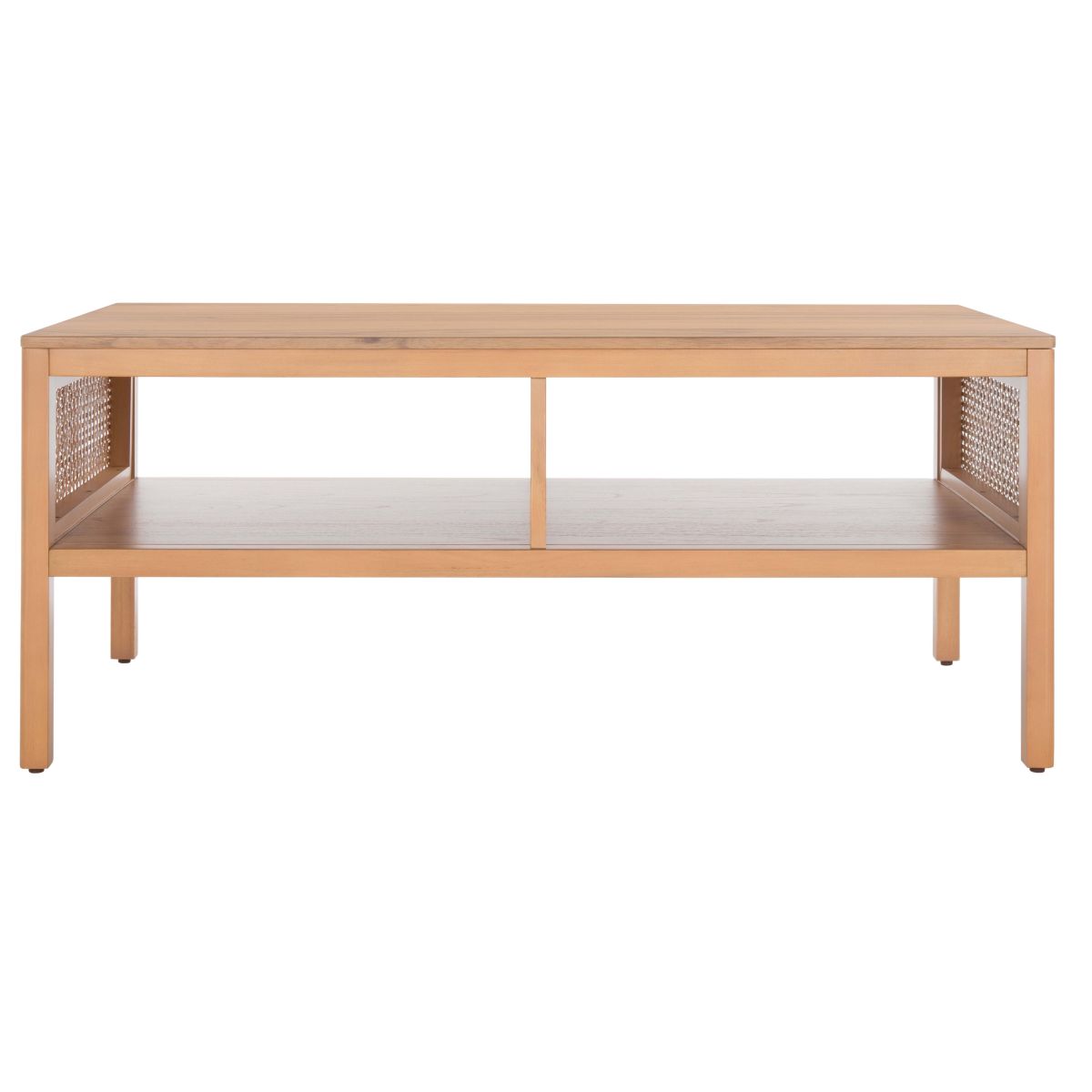 Make a warm and refined statement with our stylish Miya coffee table. Our sleek and streamlined coffee table stands out with a rich textural appeal. A beautiful rattan mesh is juxtaposed against a natural veneer to serve as a warm and inviting centerpiece. Its minimalistic profile evokes relaxed refinement to sit easily in your casual living space, family dens, and bedroom. Our coffee table features two large open shelves to keep your remotes, coasters, and other essentials within easy reach.
