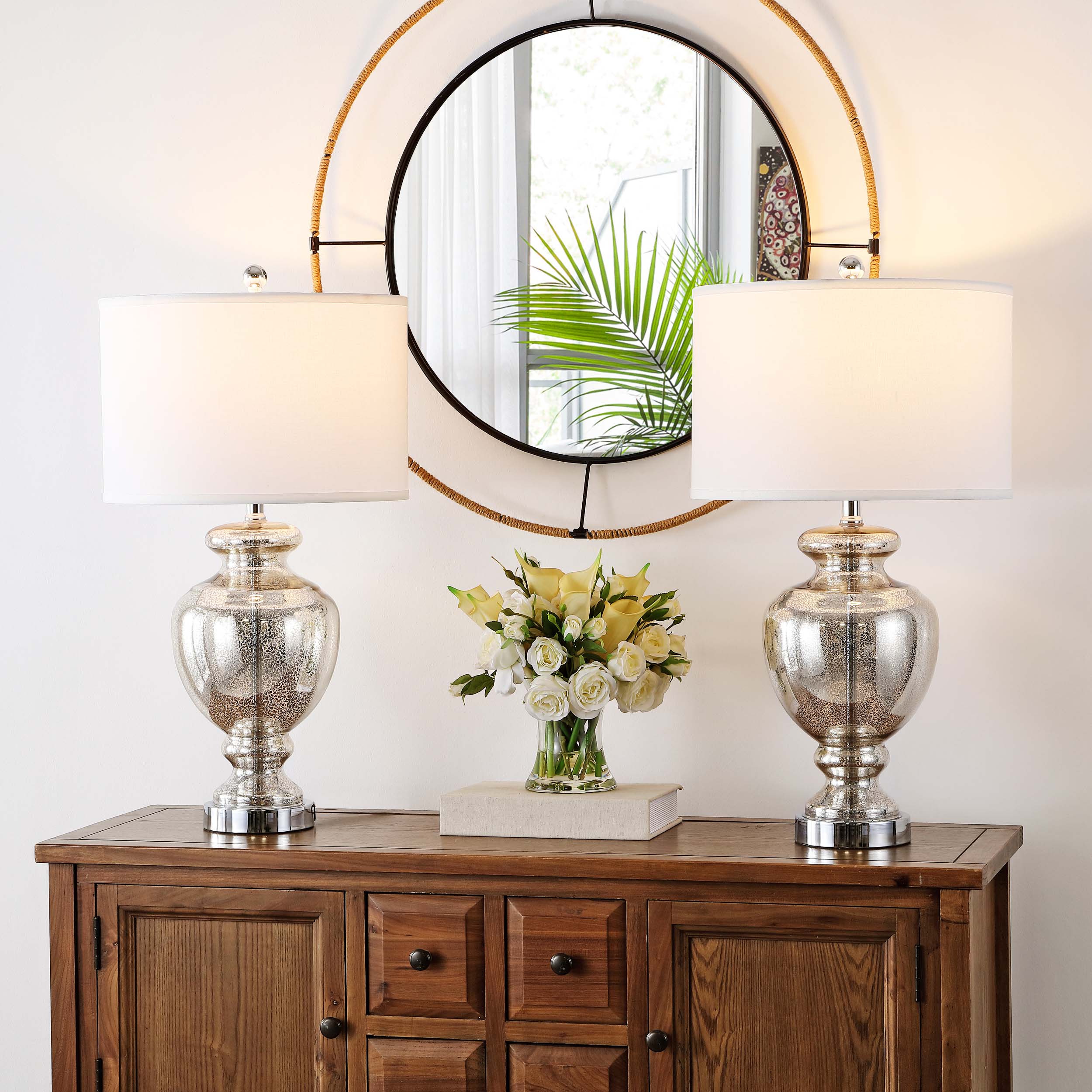 Inspired by collectible colored glass vases and bottles, this Morocco Table Lamp gives any d?cor a glimpse of glamour. Shimmering mercury glass updates the romantic vintage look with unapologetic star quality, while an off-white drum shade completes the look. A built-in USB port makes it a designer favorite. Sold in sets of two.