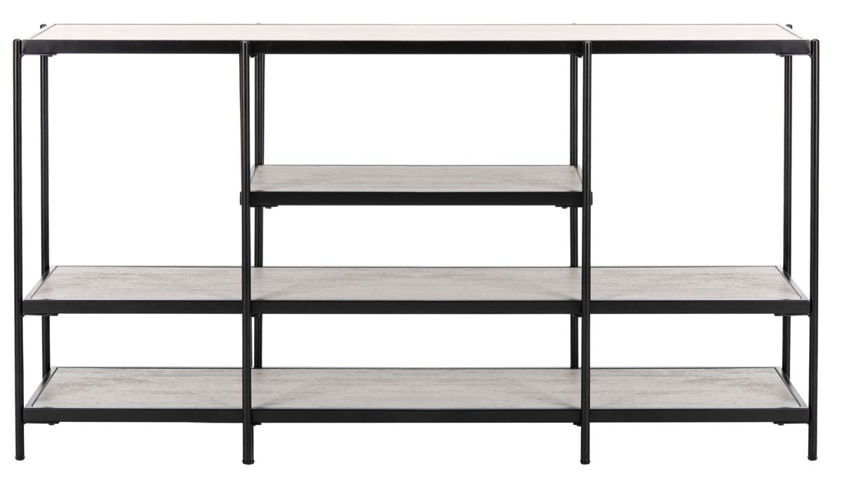 Designed to showcase its generous open storage, this modern Petra Three Tier Console Table brings high style to the living room. Crafted with beige wood and a matte black frame, it?? the perfect place to showcase books, photos, and everyday treasures.