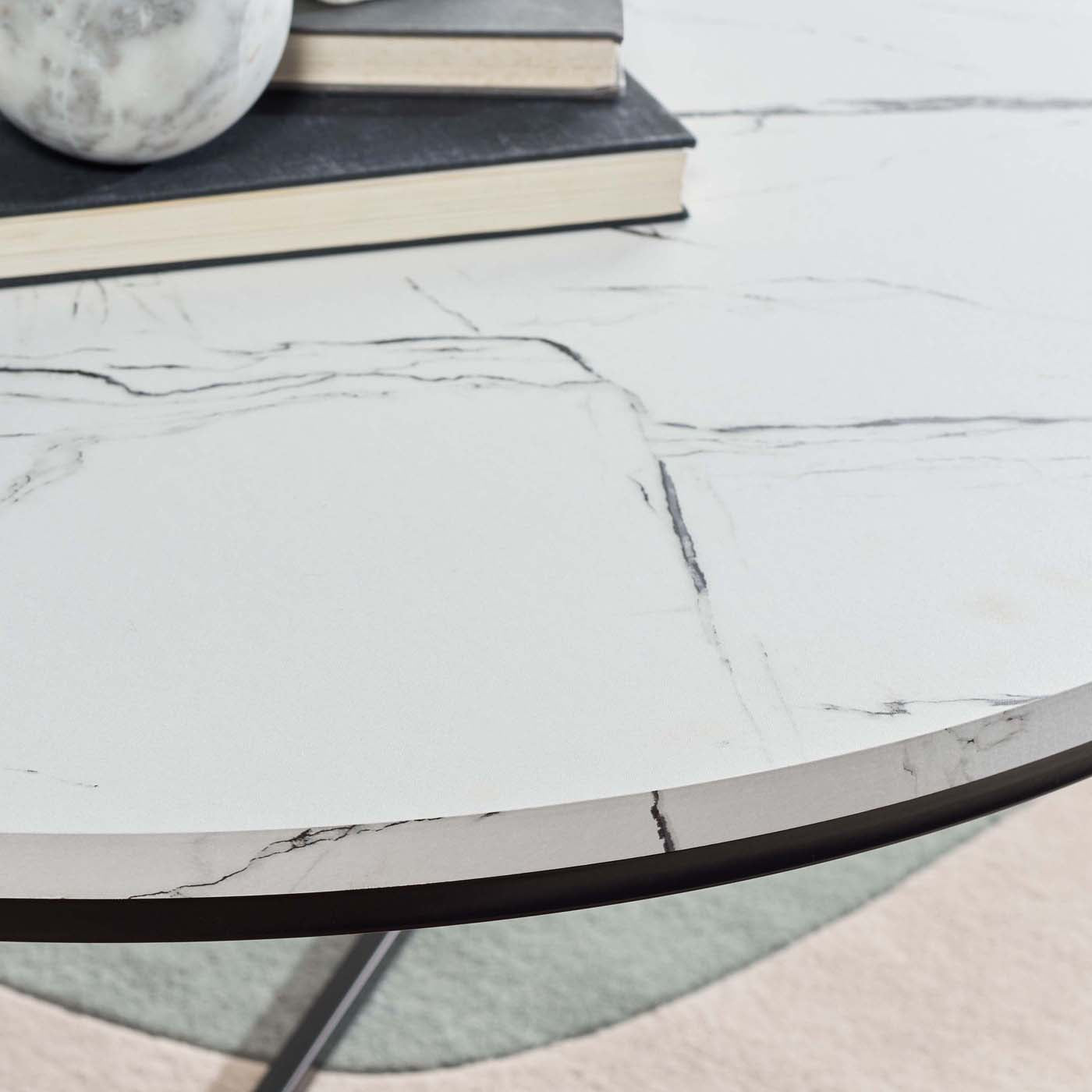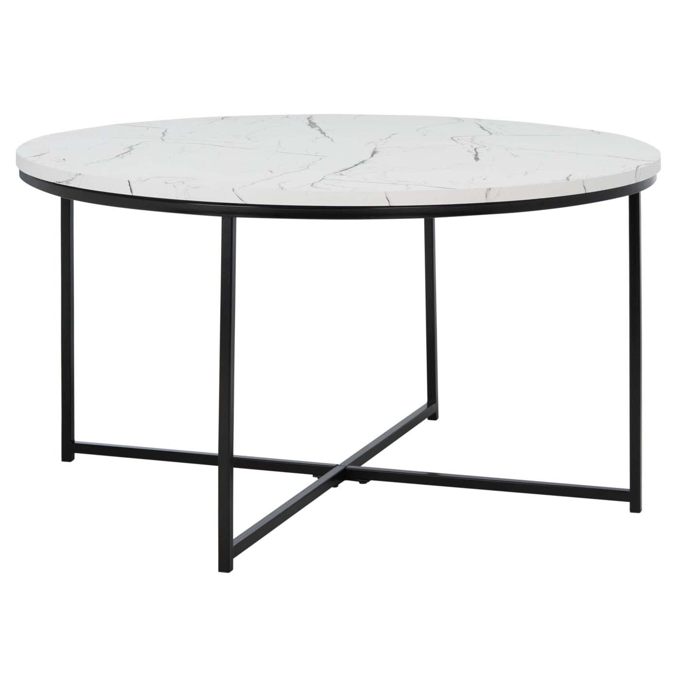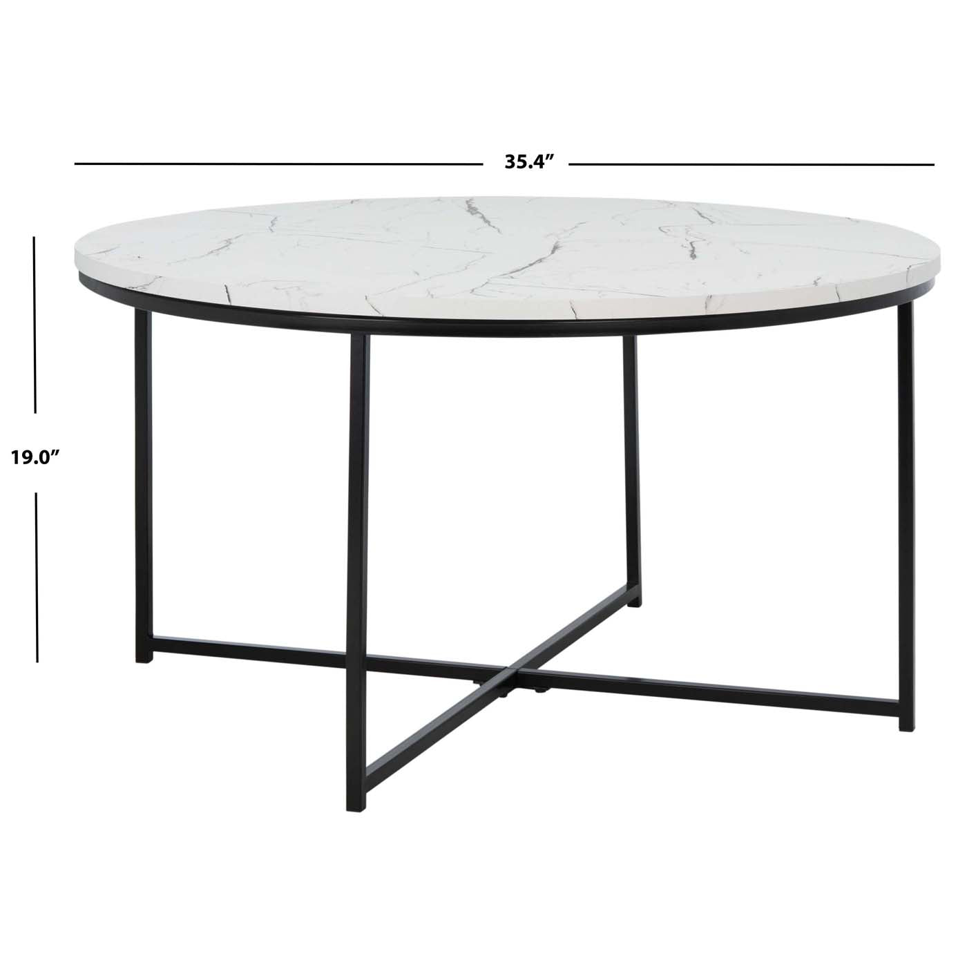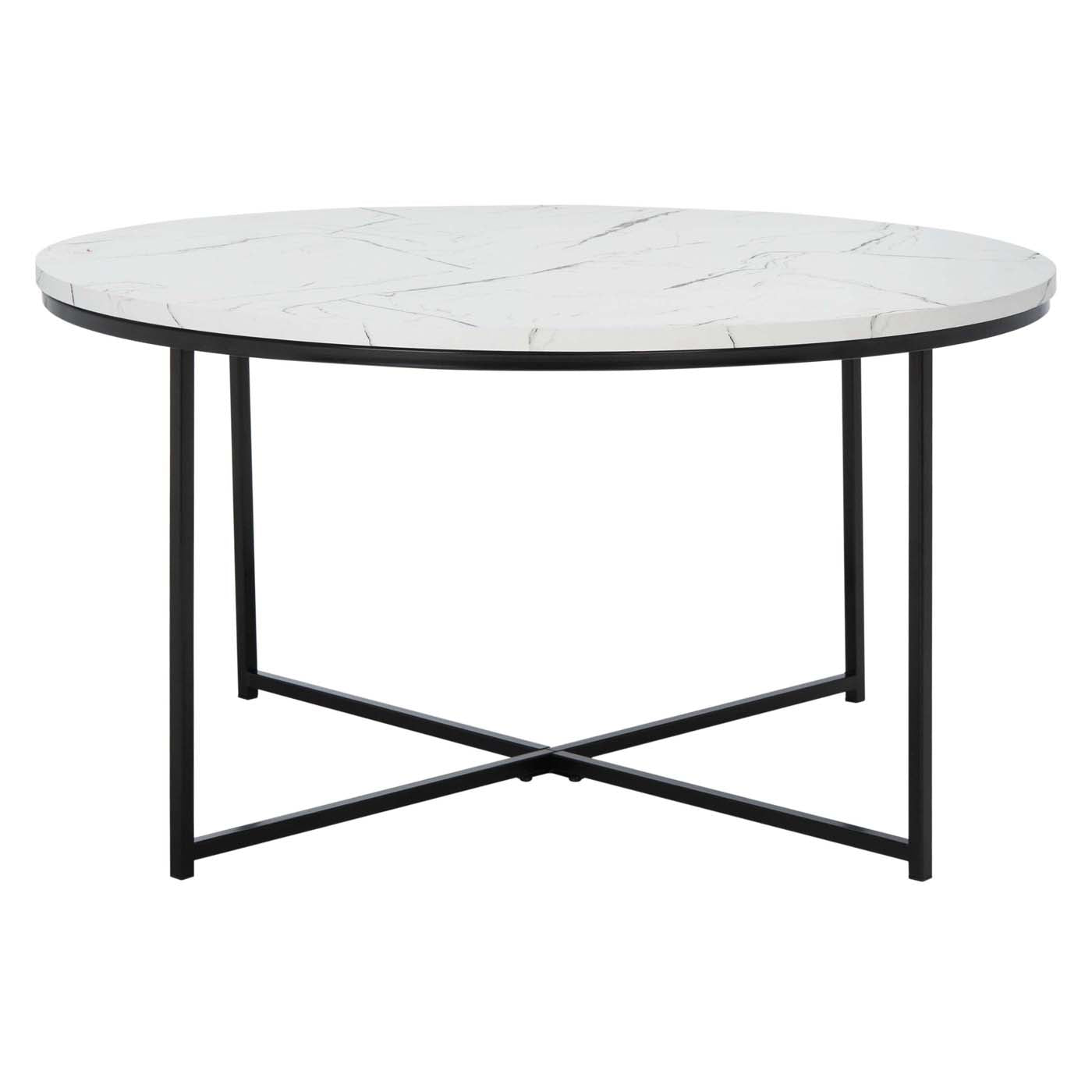 Utterly modern with a touch of Mid-Century charm, this Pia Coffee Table was perfectly designed for today?? contemporary-chic interiors. Pia?? black cross base provides elegant visual intrigue to its circular faux white marble top, making it a glamorous centerpiece in any living room.