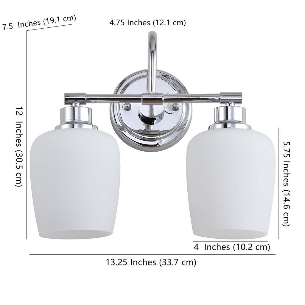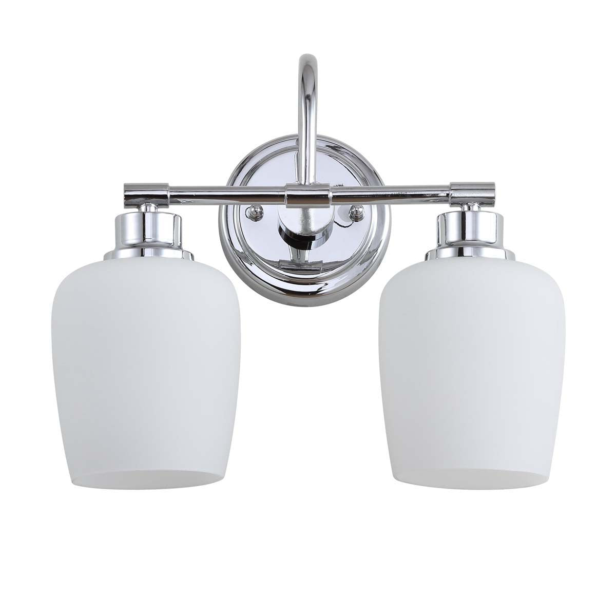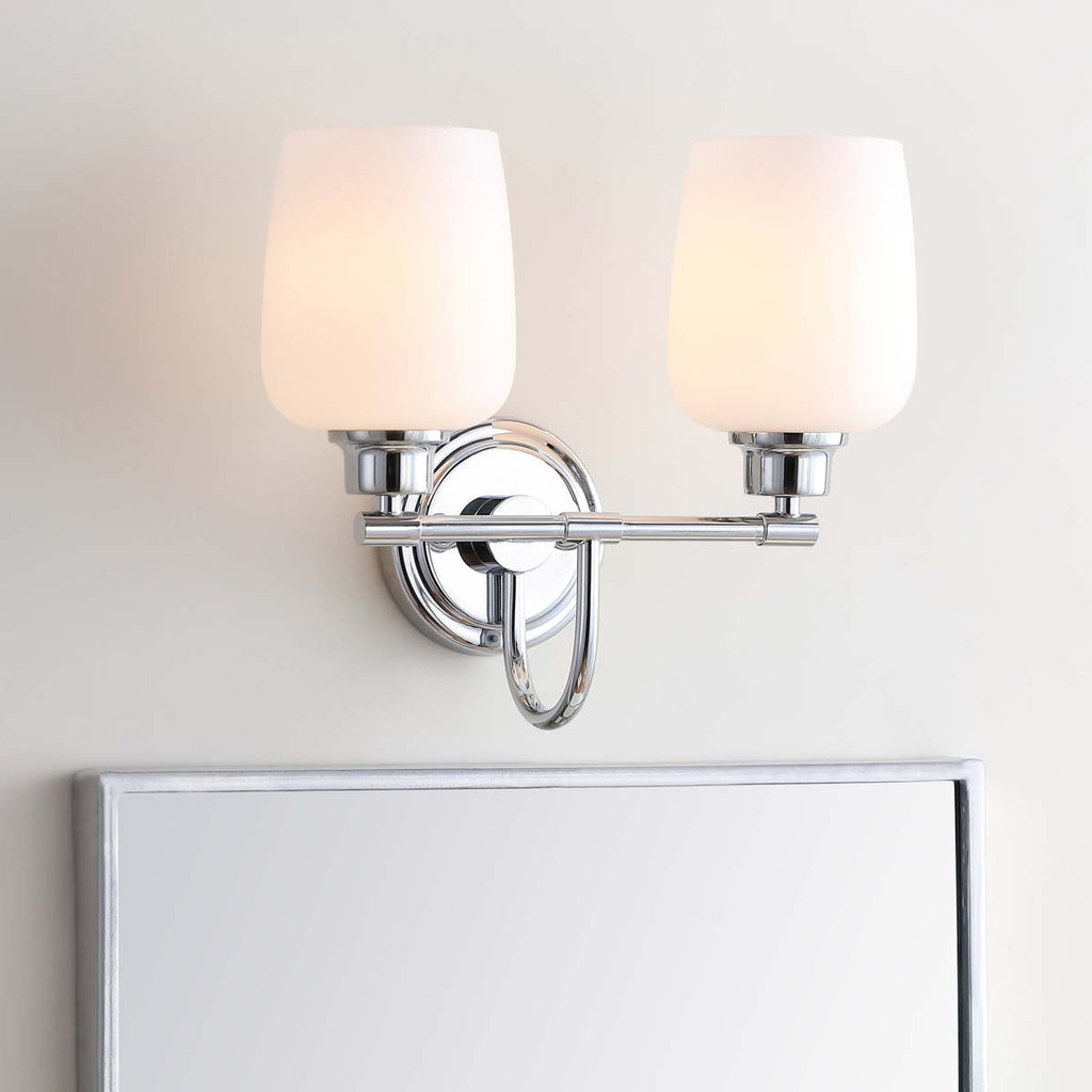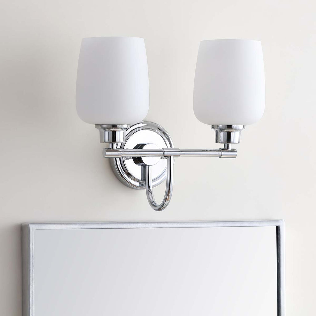 Refresh and renew any bathroom with this two light bathroom sconce. A new classic, a brilliant polished chrome finish features luxurious curves illuminated by the glow of white glass shades.