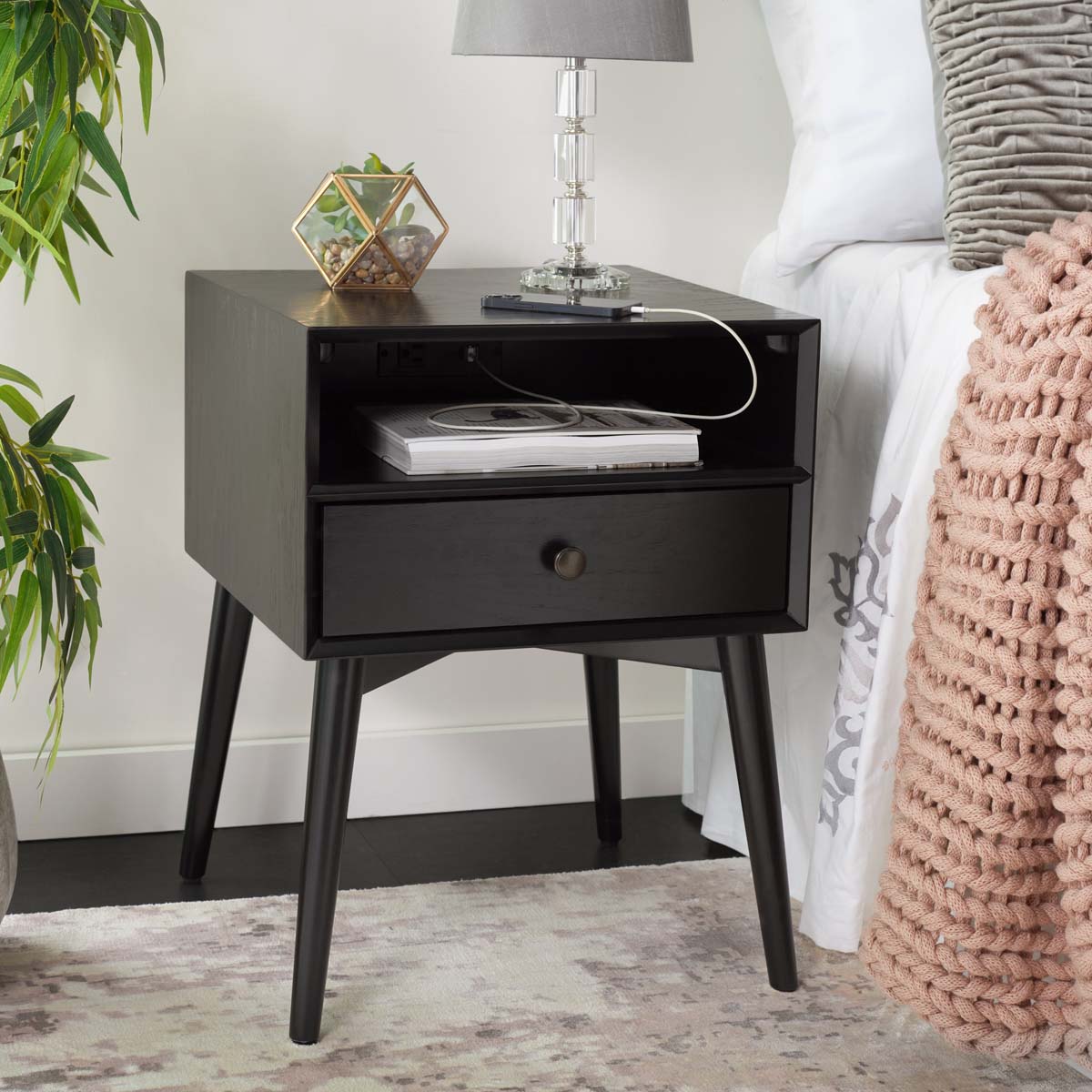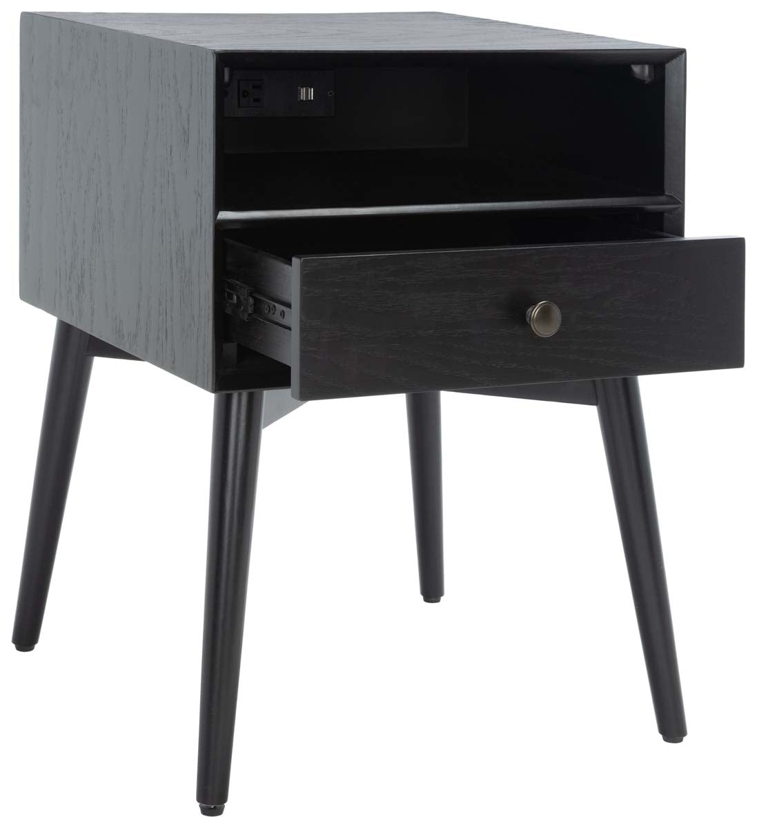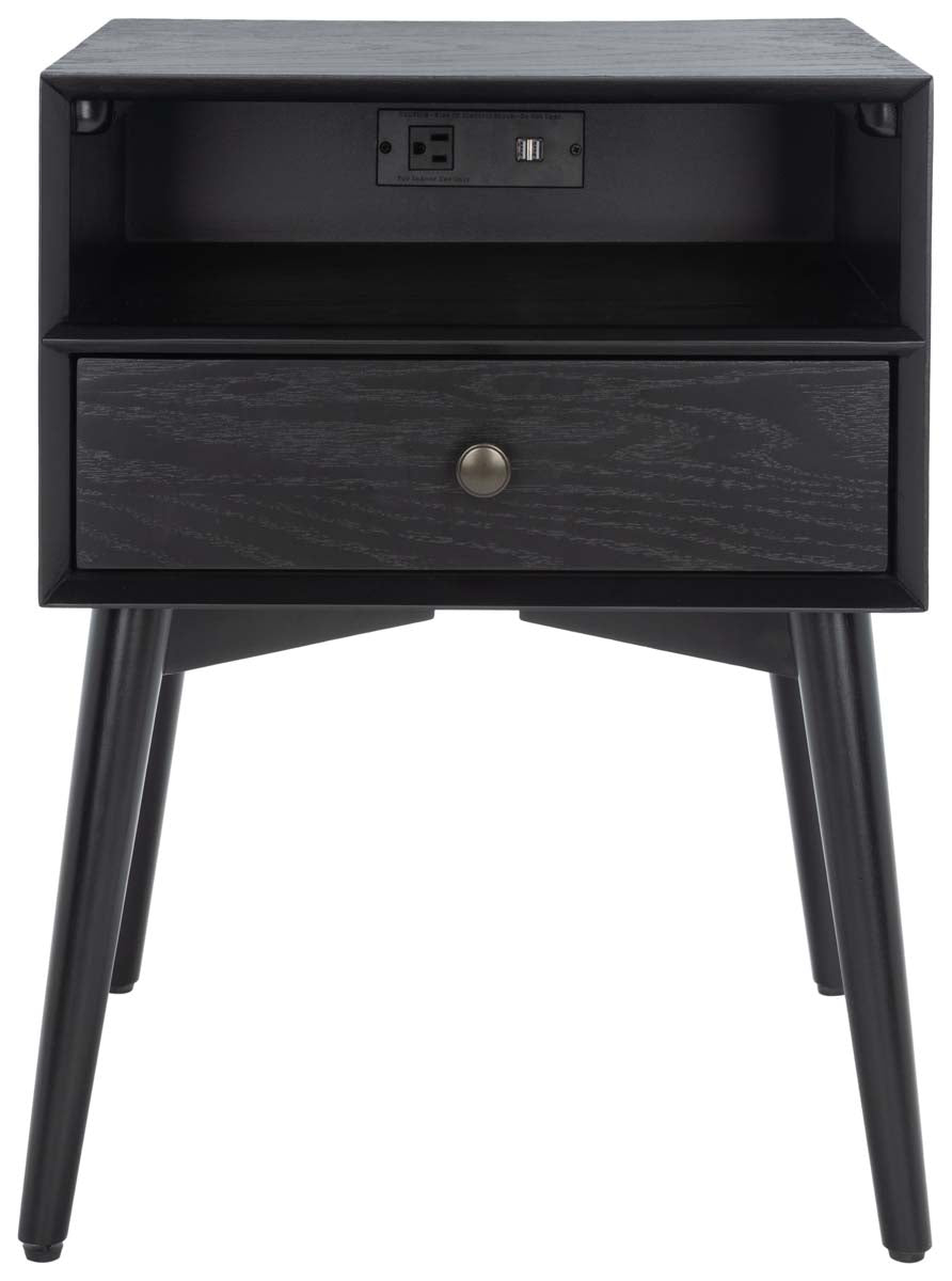 A staple in any classic-contemporary bedroom, this Scully Nightstand takes its inspiration from timeless Mid-Century designs. Splayed legs lend a touch of retro charm, while a velvet-lined drawer provides easy-access bedside storage. Scully?? jet black finish beautifully upgrades the look, and a built-in USB port makes it a must-have.