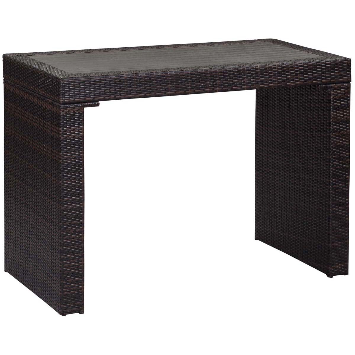 Architectural lines create a beautiful but hardworking outdoor bar set with six stools and a Parson?? style table for happy hour or meals. Crafted of all weather PE woven rattan in rich brown with tie back cushions in sand, this set is truly easy care.