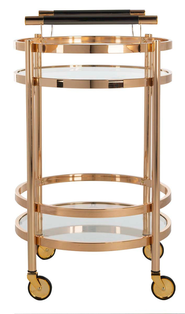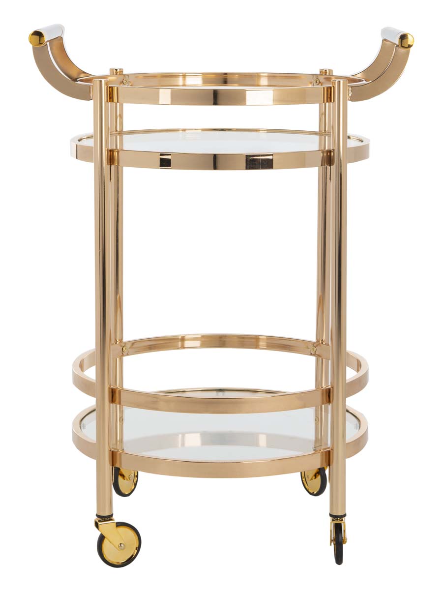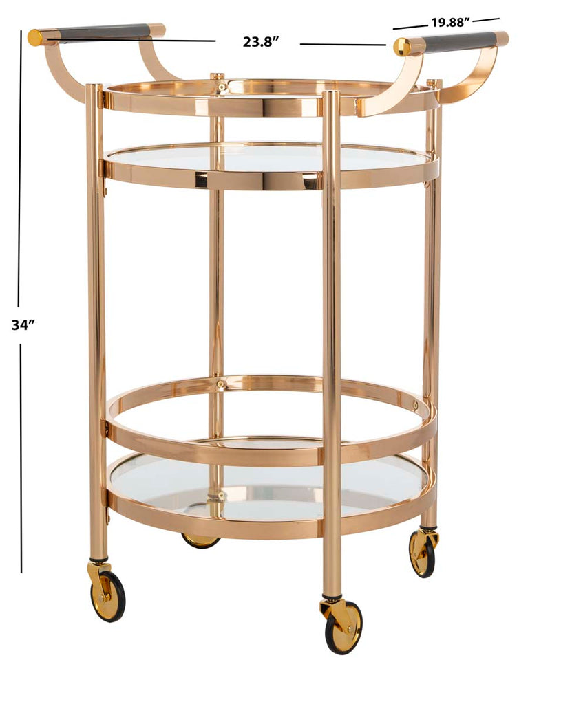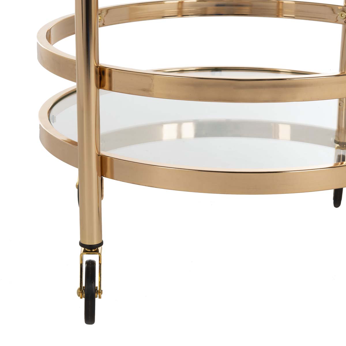 Designed with sleek, stylish curves, this contemporary 2 tier round bar cart ensures easy entertaining in any room. Its two glass layers and shimmering gold finish create a stunning showcase for glasses and barware. It?? must have for the modern host.
