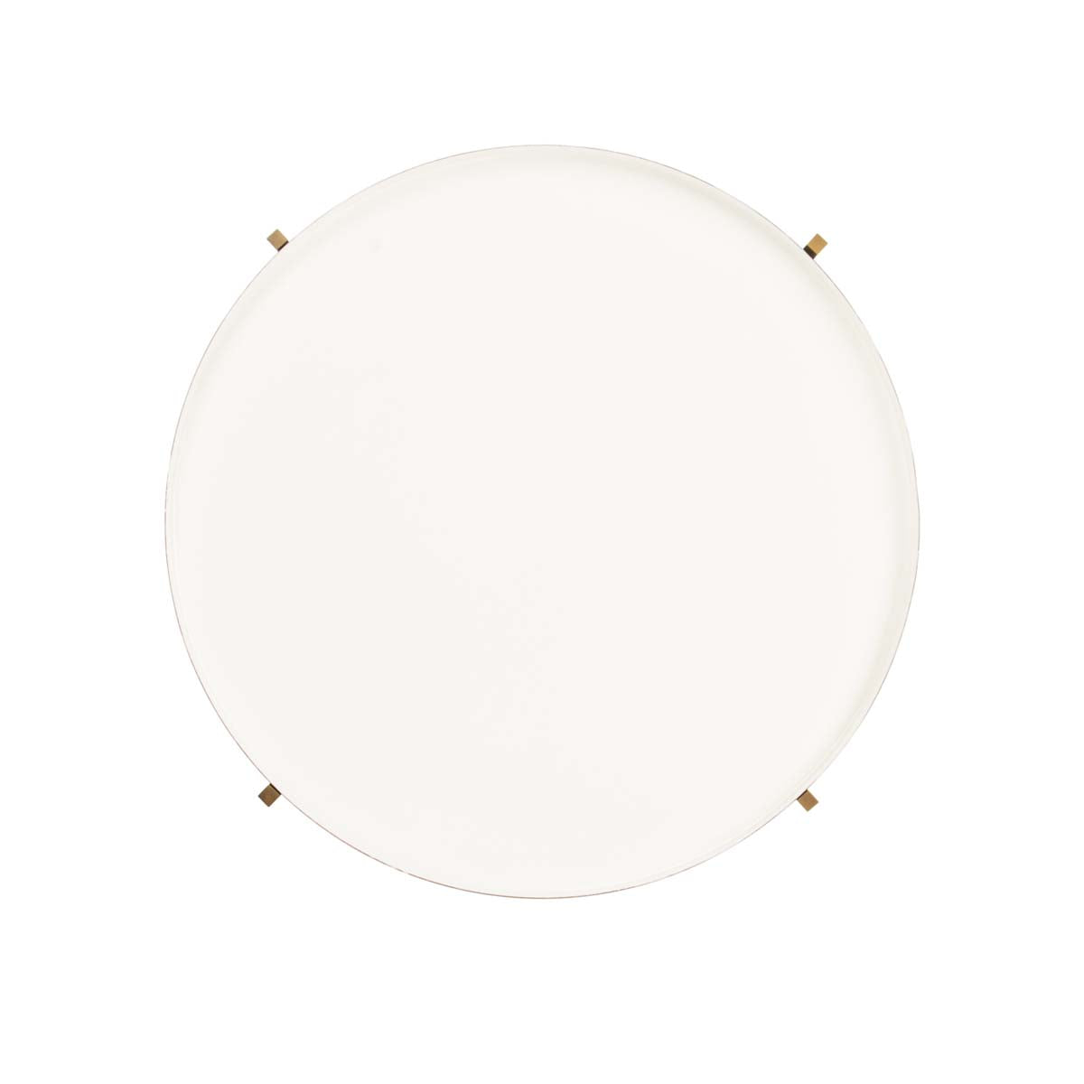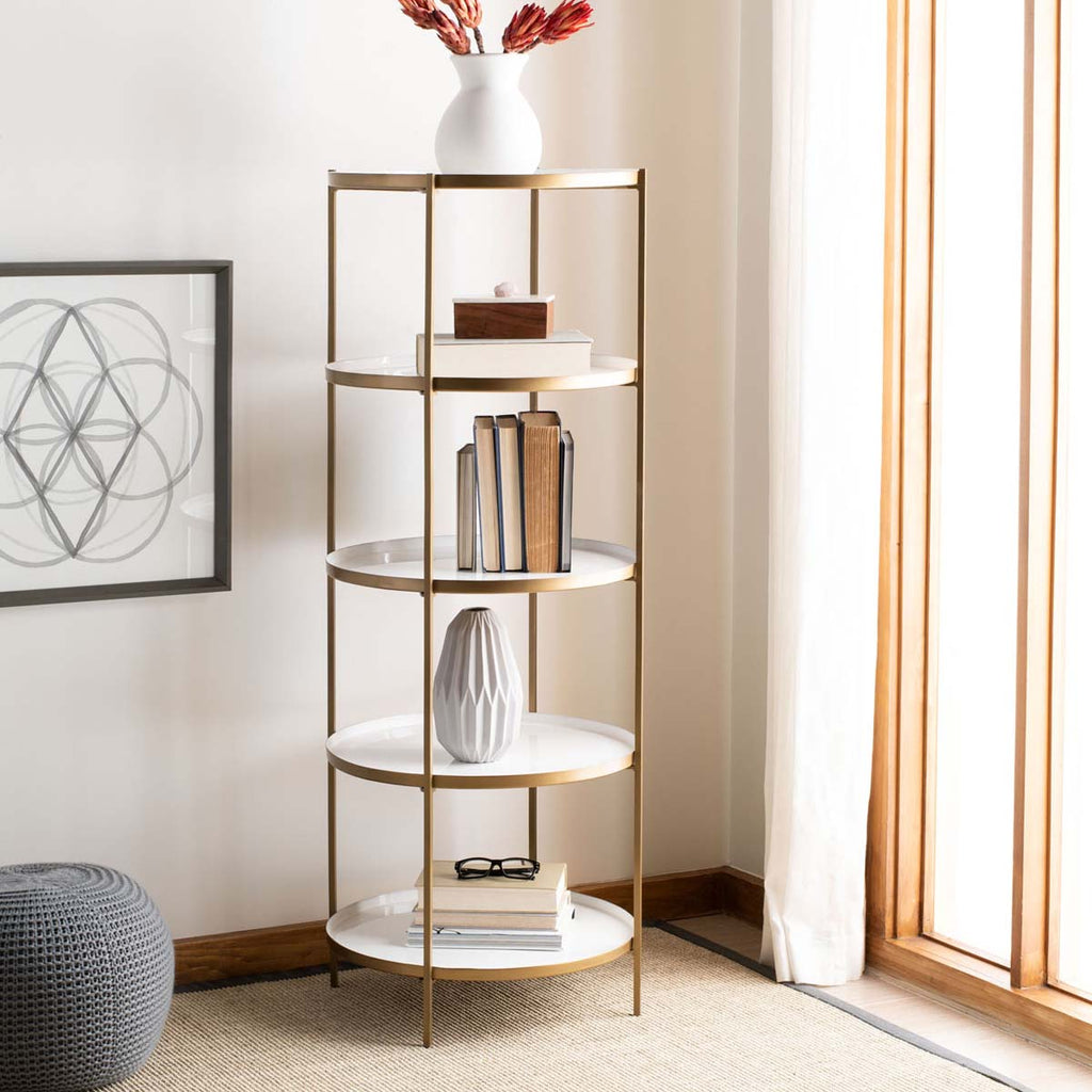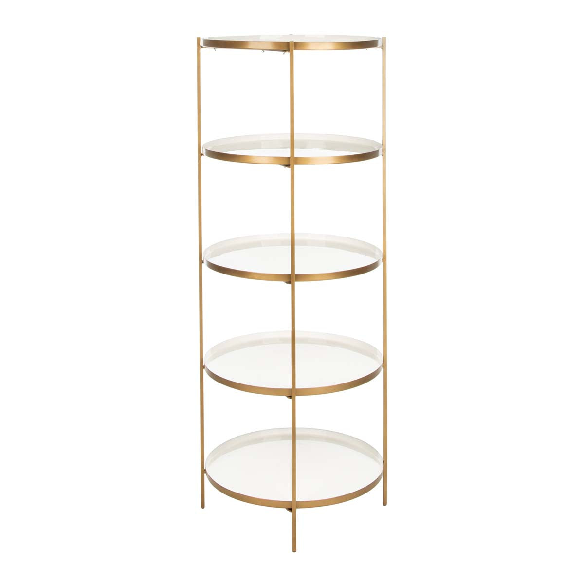 Brighten up any space with this contemporary round 5 tier ?tag?re. Poised and polished, its durable iron frame features a chic brass finish that frames its white circular shelves. Designer love to use one on either side of a sofa for instant glamour.