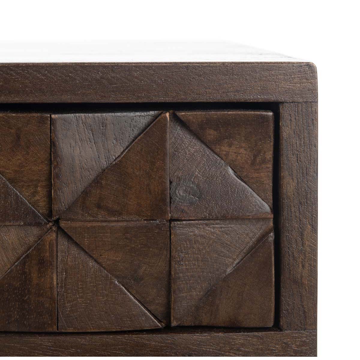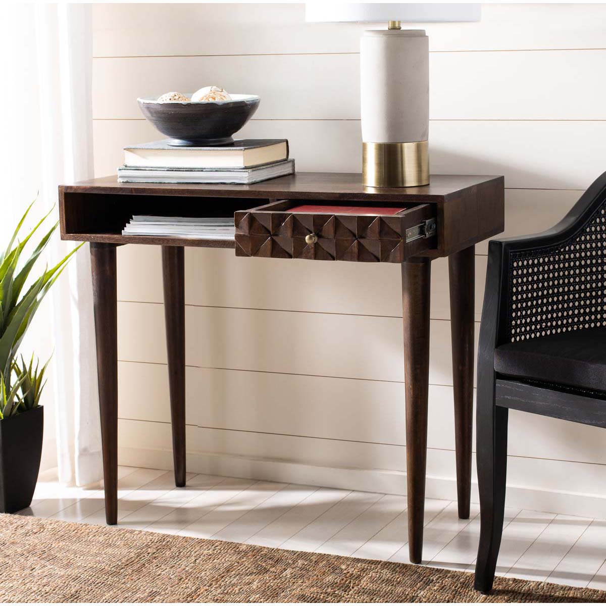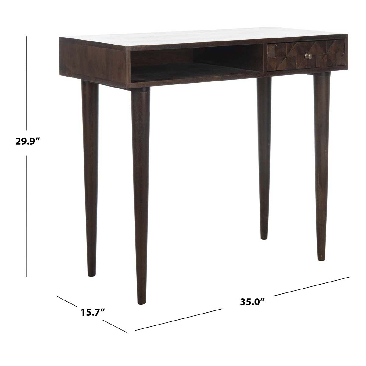 This Zinnia Desk flaunts a distinct couturier look with its finely carved geometric details and artful asymmetry. Ideal for the living room or home office, Zinnia's mango wood frame is finished in a rich walnut tone that highlights its open shelf and tapered legs.