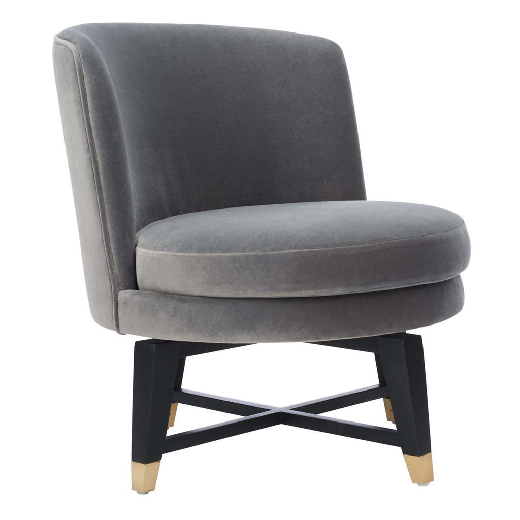 A stylish gathering of glamour and whimsy, the Trinity Swivel Accent Chair invites you to take a spin in the lap of luxury. Trinitys charcoal velvet is plush and enticing, and its antique black mahogany legs with brass cap accents give it the air of a lavish boutique. An absolute necessity in high fashion interiors.