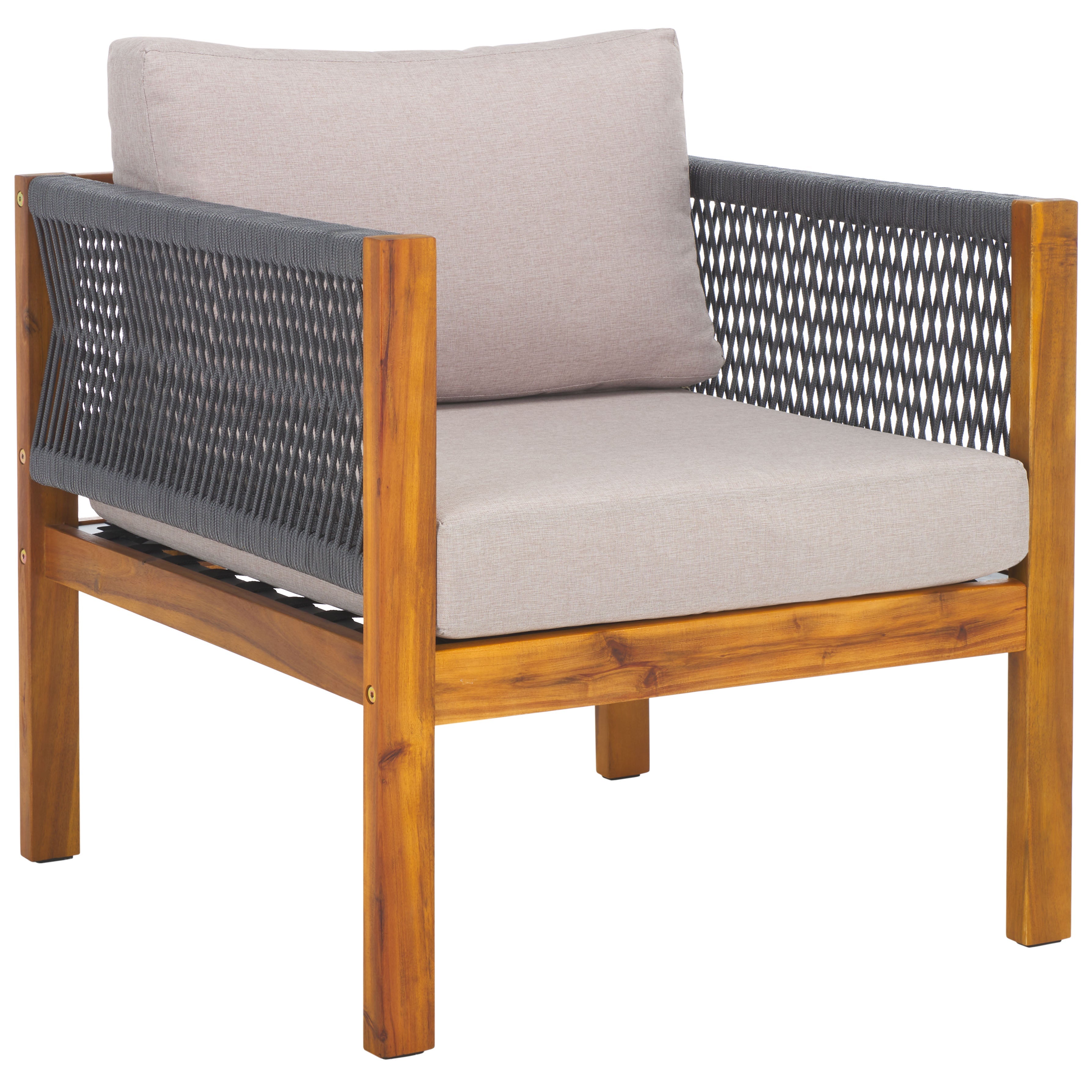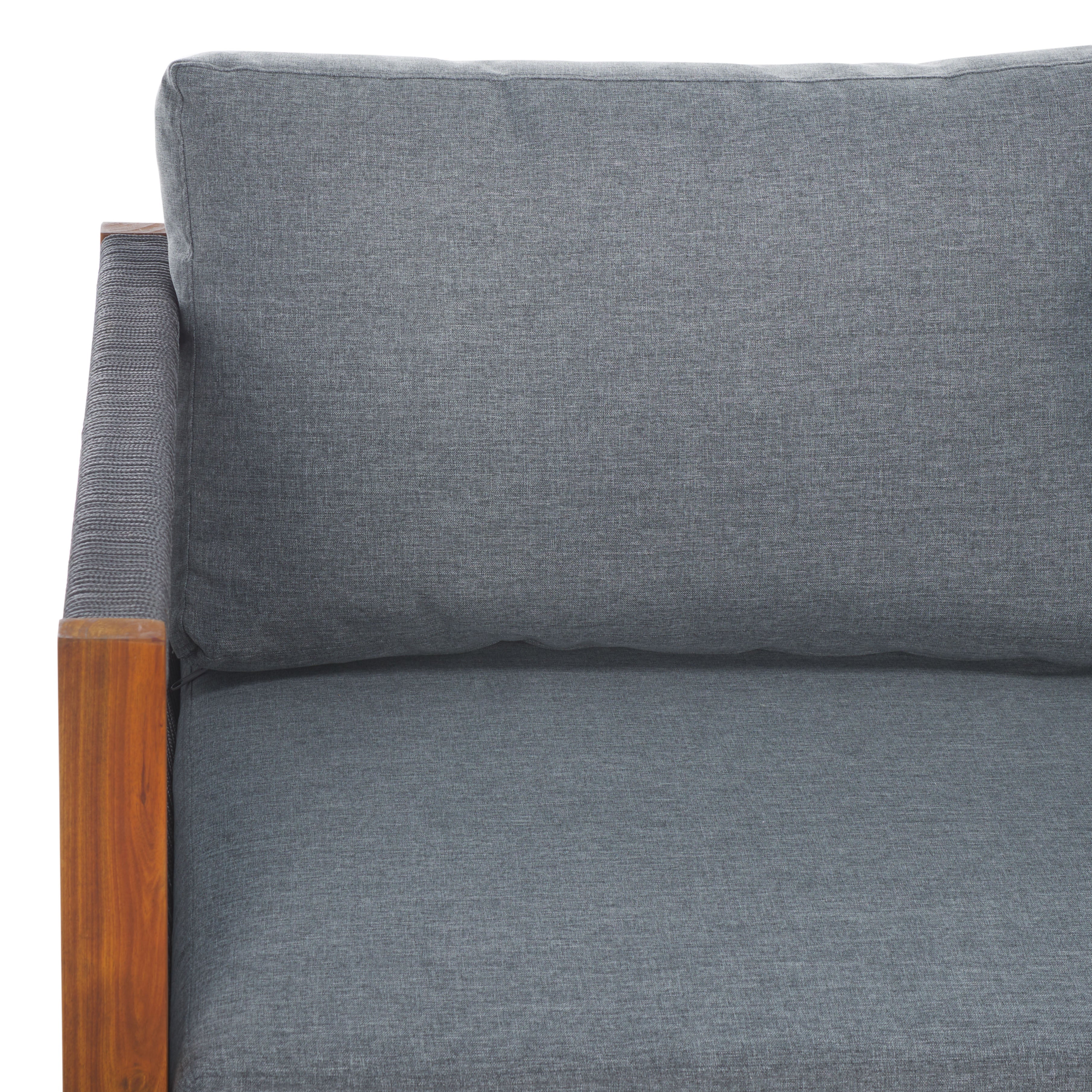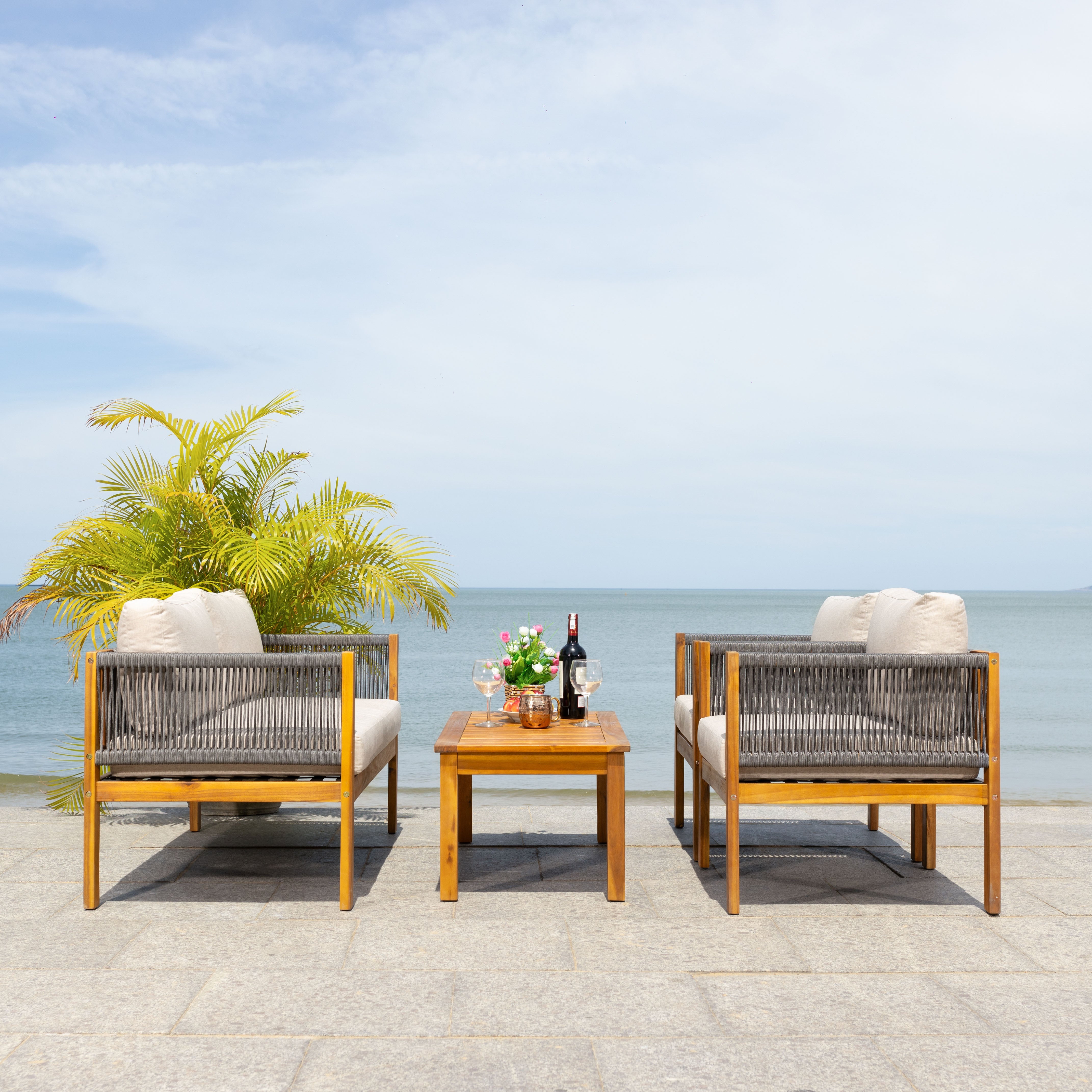 Bring modern and breezy charm to your outdoor living space with our Wilson 4 piece living set. Including a two-seater sofa, two accent chairs, and a table, our outdoor living offers casual elegance and comfort. It is crafted from acacia wood to lend warmth and rich textural appeal to our modern and clean lined living set. The sheltered silhouette of the sofa and chair is covered with Allweather rope to attain a breezy appeal. It is complemented with light grey plump back cushions and a boxy seat to promise a comfortable stay. Our modern and breezy outdoor living set allows fresh air lounging all year round.