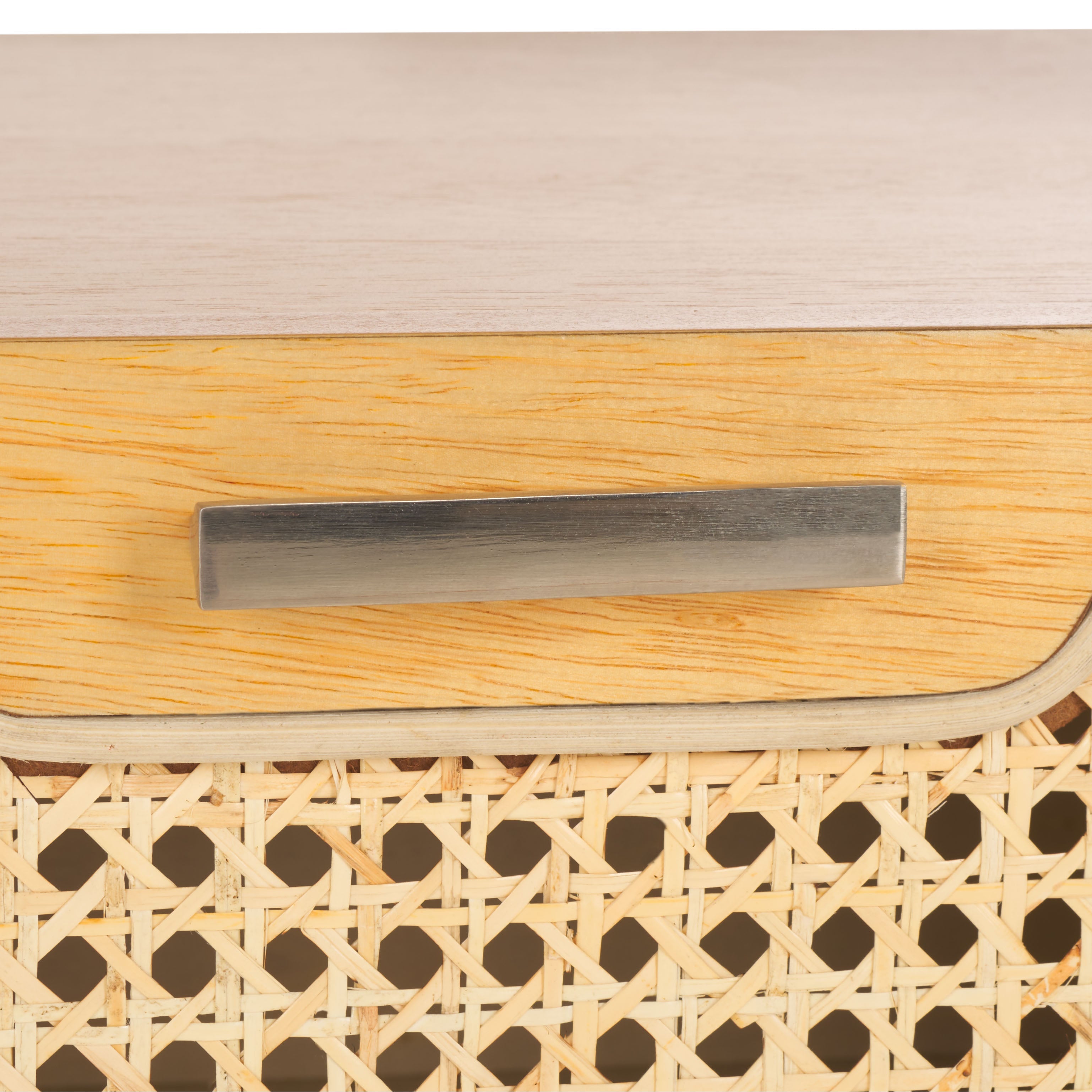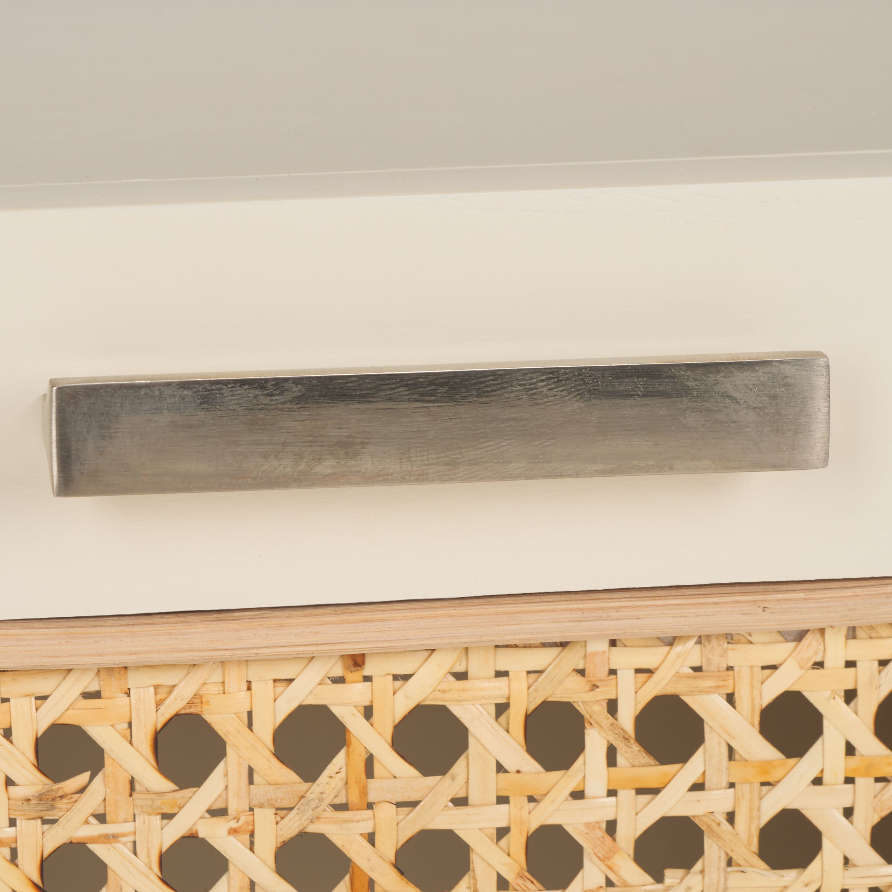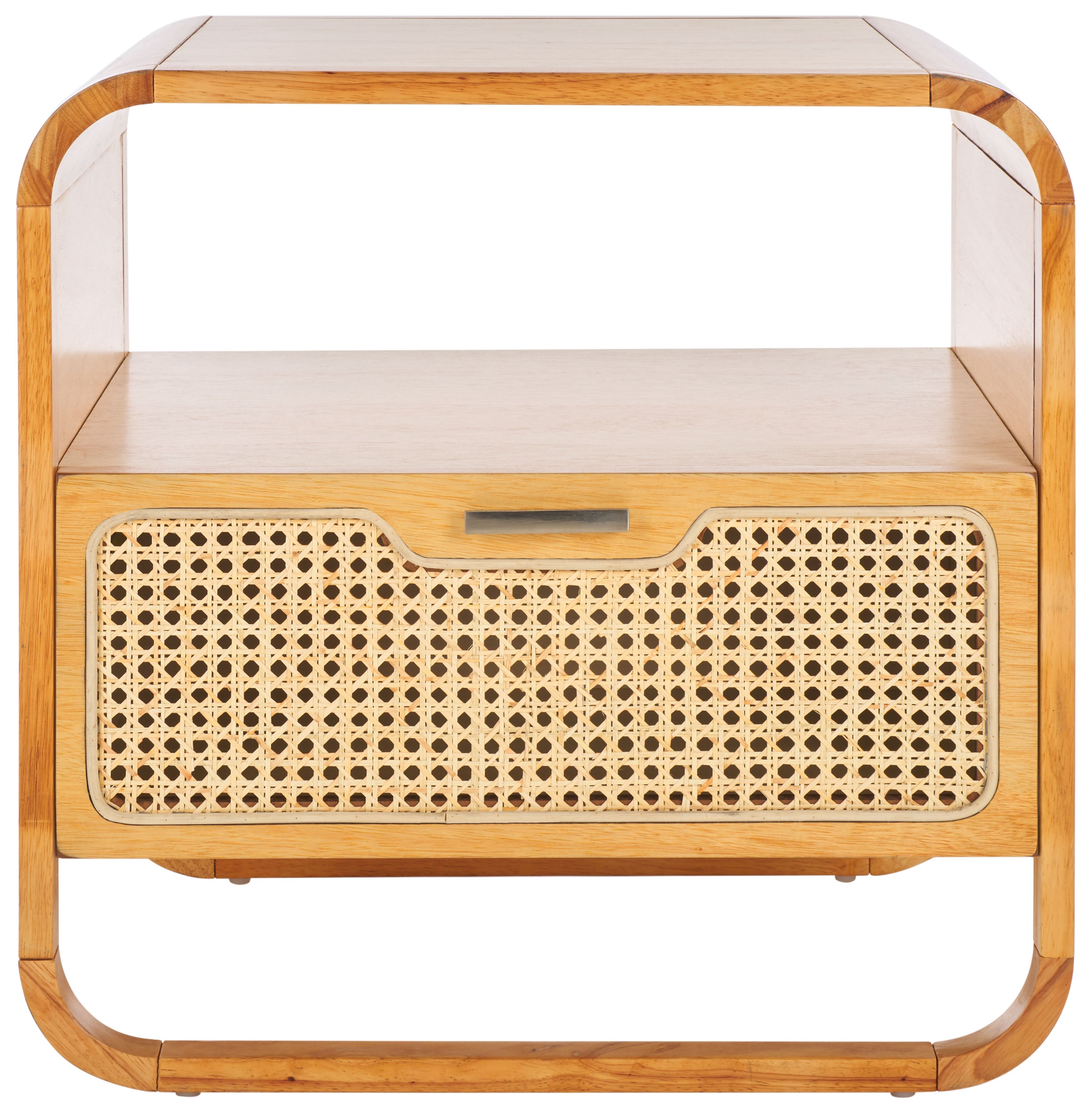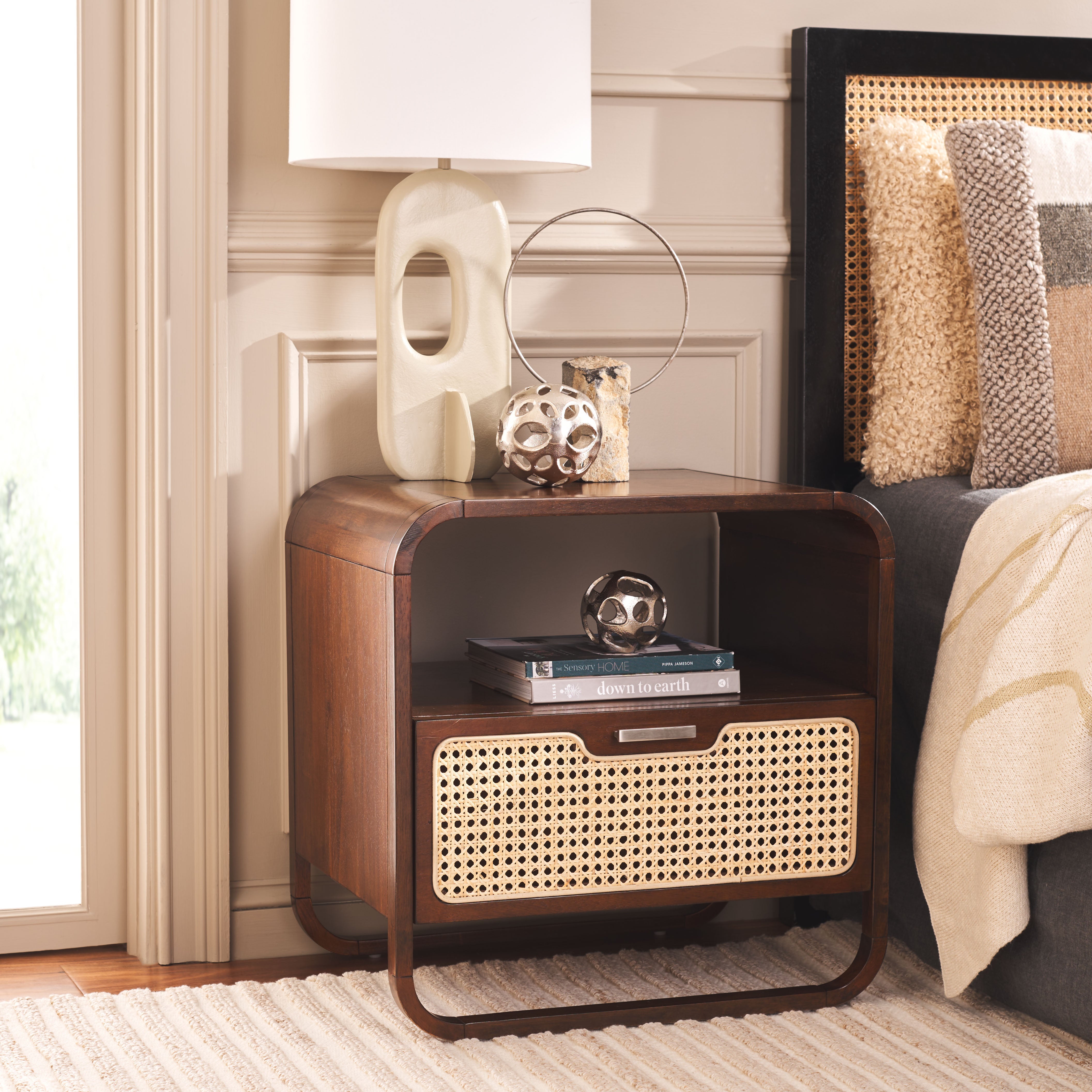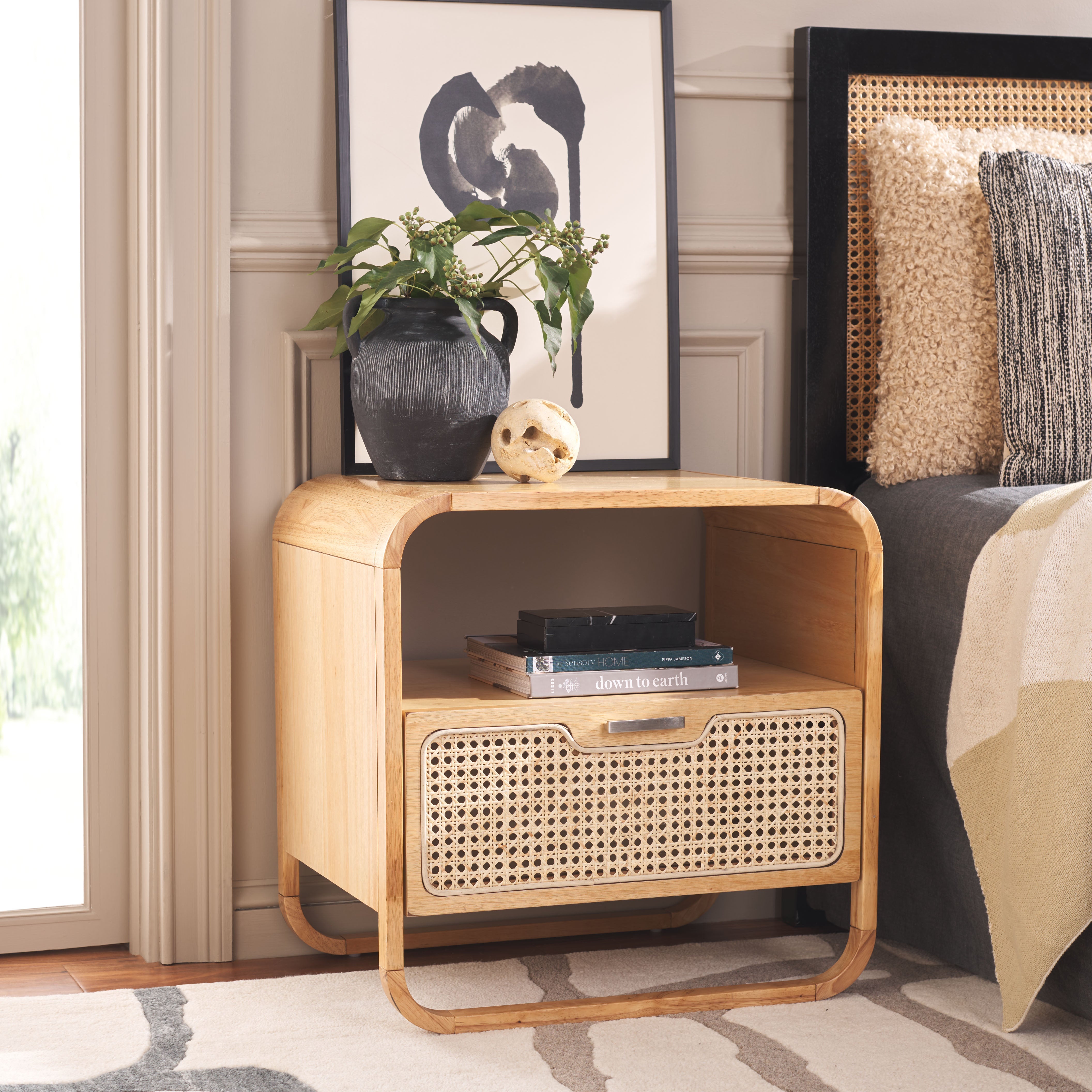 Enliven your home with the breezy and inviting presence of our Yates nightstand. The nightstand beautifully celebrates contrasting materials and textures in an airy profile. Woven rattan panels upon the drawer add a dose of warmth and textures, creating a beautiful contrast with its sleek finish. Crafted in rubber wood, our nightstand is finished off with sleek curves and tailored pulls for a chic and inviting appeal. It includes a roomy drawer and an open shelf to keep all your nighttime essentials organized.