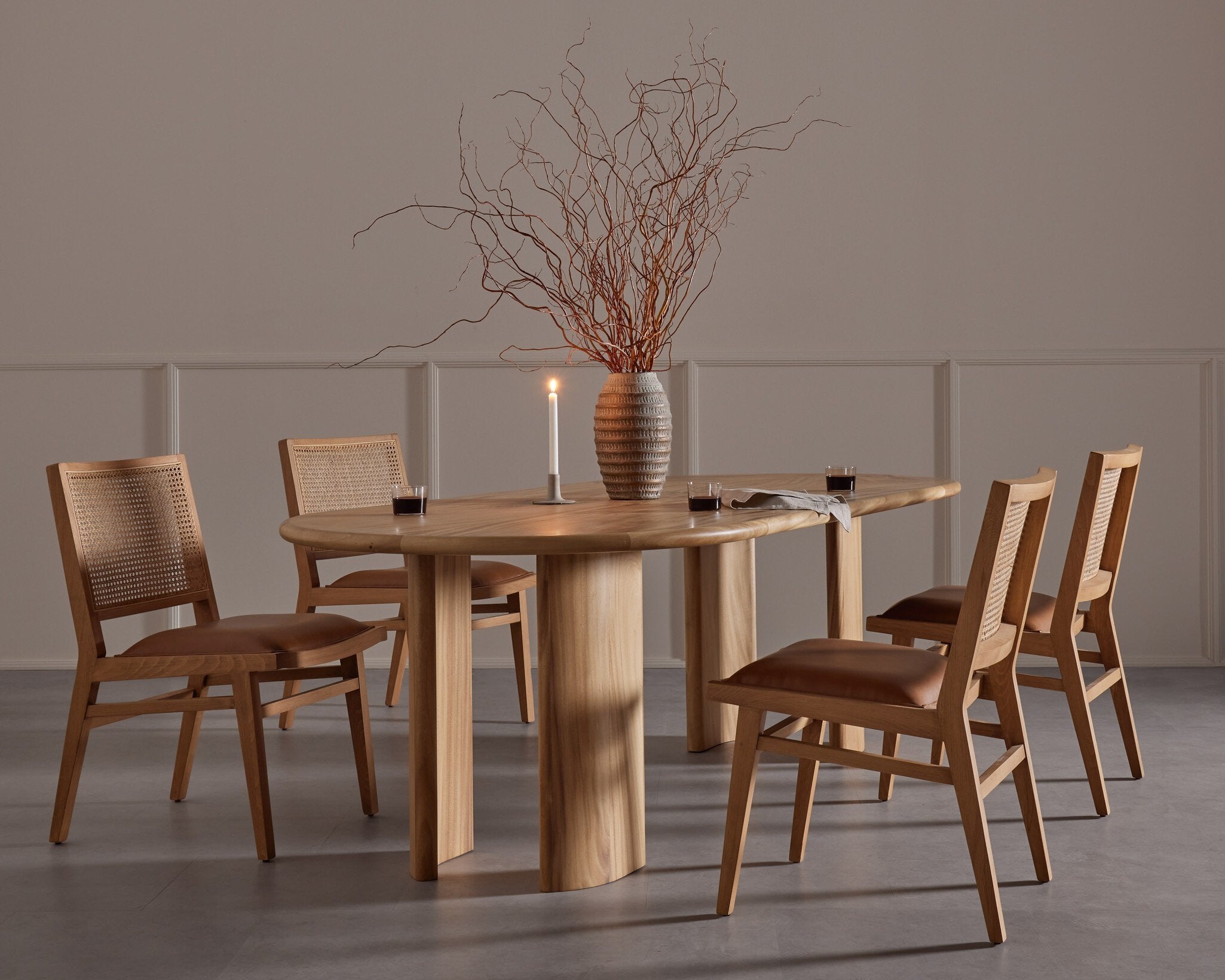 Mixed materials make the chair. Solid, sand-colored beech wood features a natural cane back for extra texture, while a butterscotch-finished leather seat serves total comfort.
