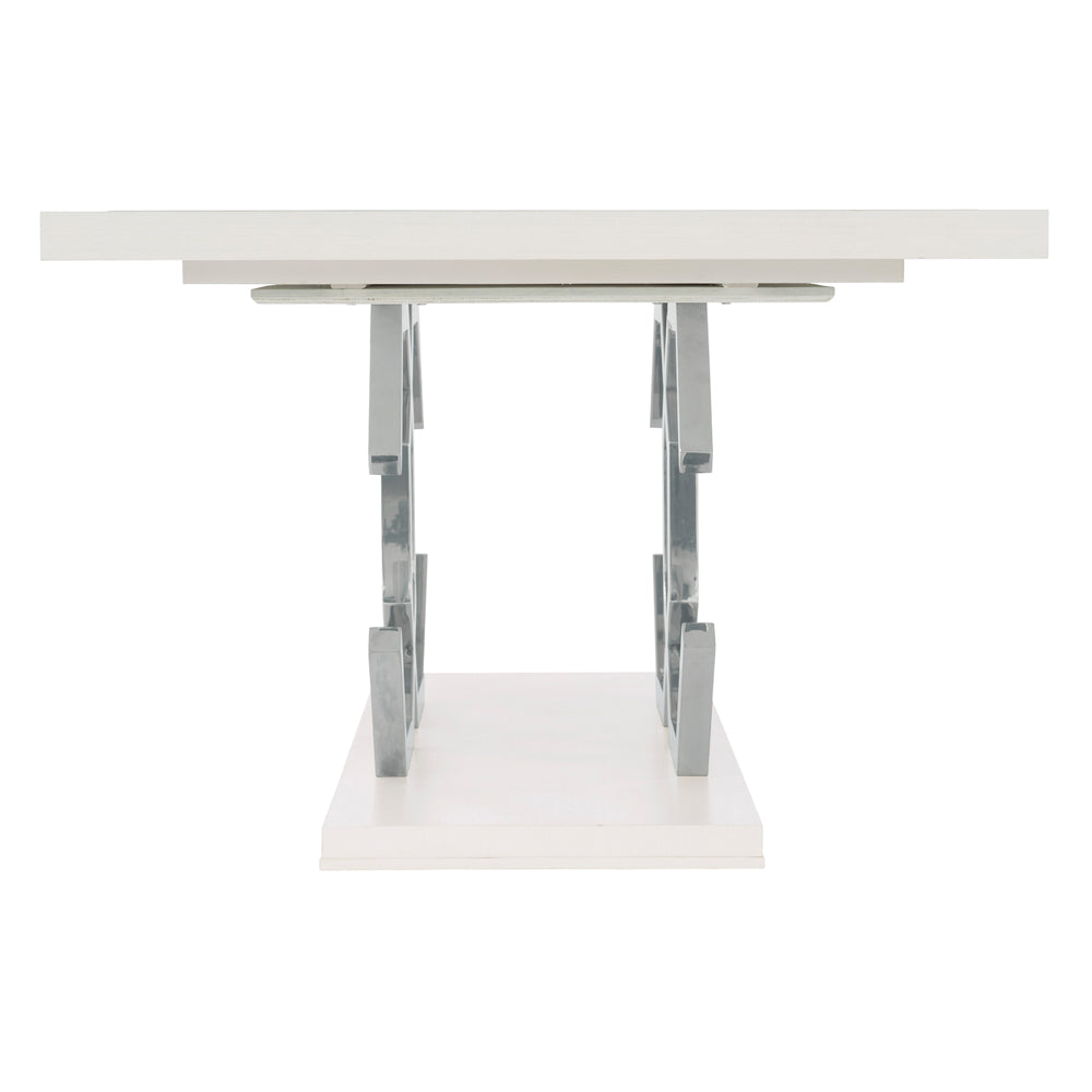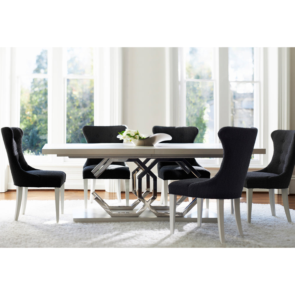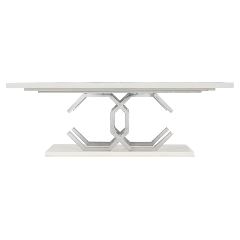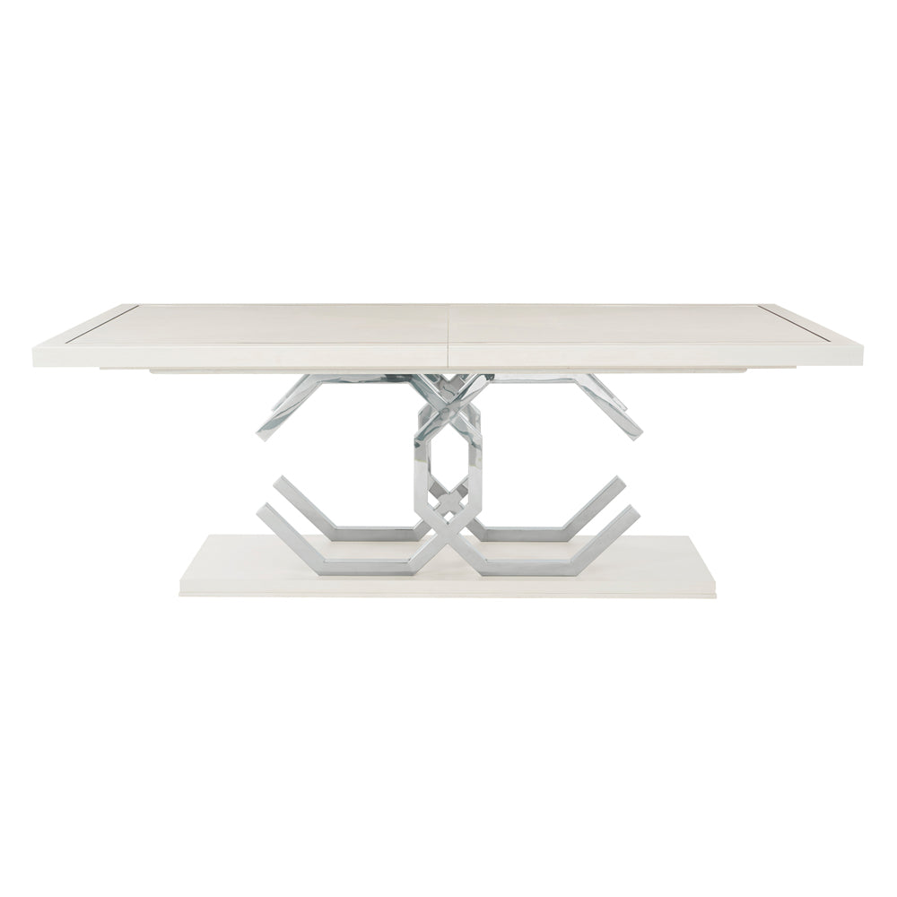 This dramatic and sculptural dining table features a brilliant stainless steel base with bold geometric appeal. Silhouette is defined by bold contrasts, clean lines and a hint of Hollywood Regency glamour. The rectangular Silhouette dining table is sculptural and unique. Finished in Eggshell, the fancy face top features a stainless steel inlay border. The two pedestals bring geometric appeal as interlocking open octagons. Throughout the piece, polished stainless steel adds a luxe, mirror-like shine.