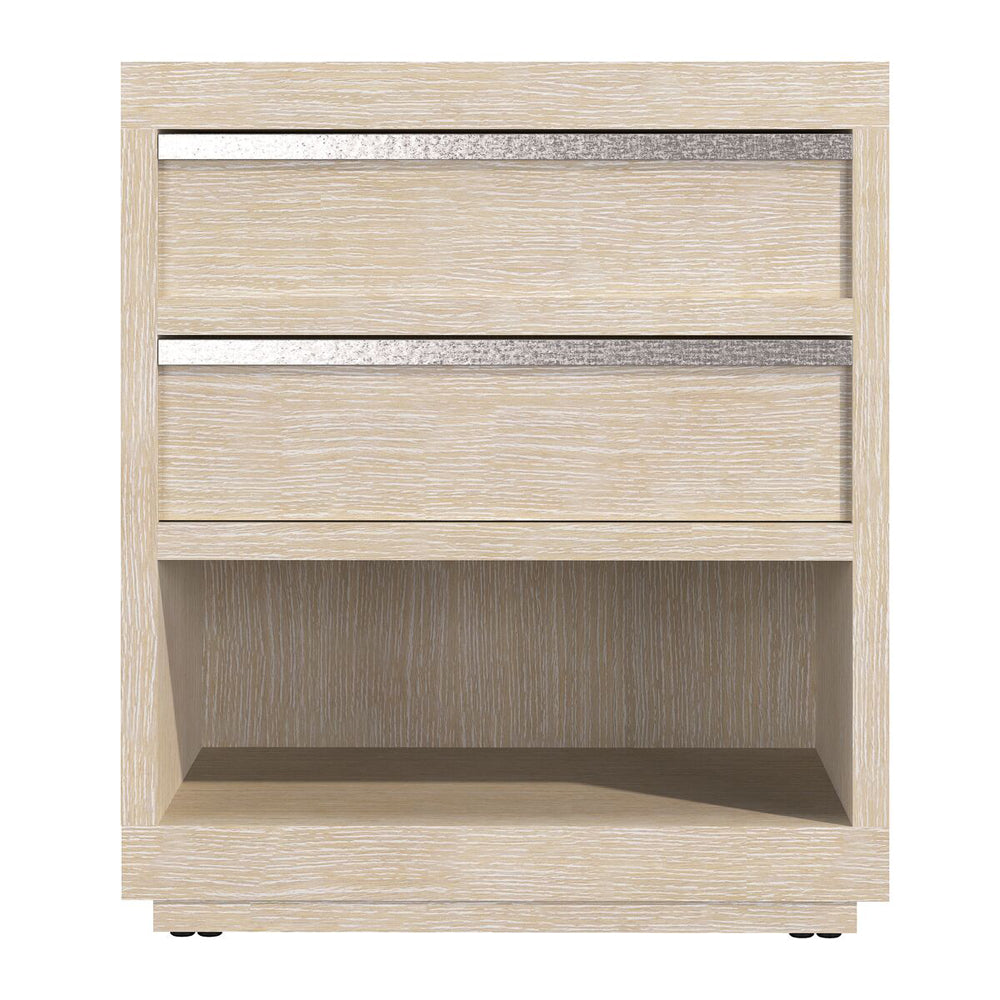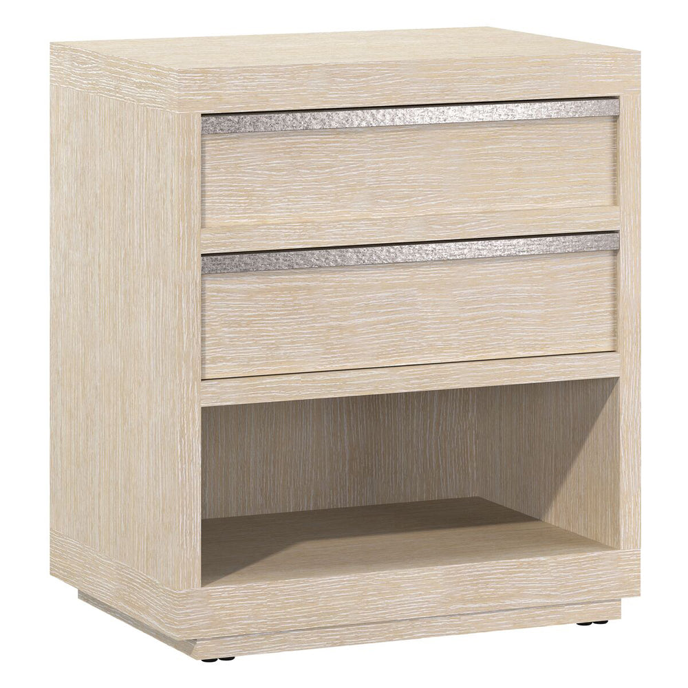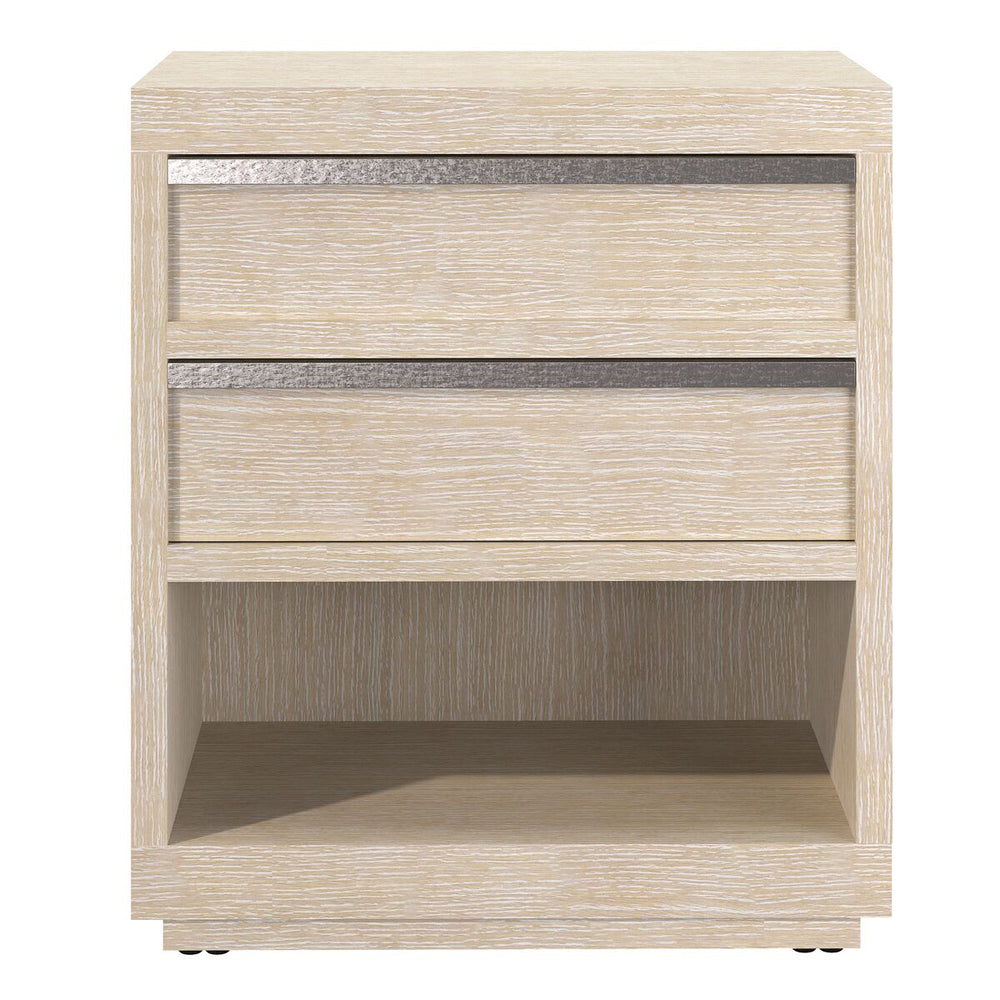 Sleek shaping and subtle detailing create a simply stunning nightstand. Subtlety defines the Solaria nightstand, crafted from ash solids and quartered white oak veneers in a Dune finish. At first glance, it appears to be an all-wood design, but the quiet sheen of the metal finger pulls draws the eye and defines the form. Two drawers and an open compartment create essential storage, and a two-port USB charger is found on the back panel of the case.
