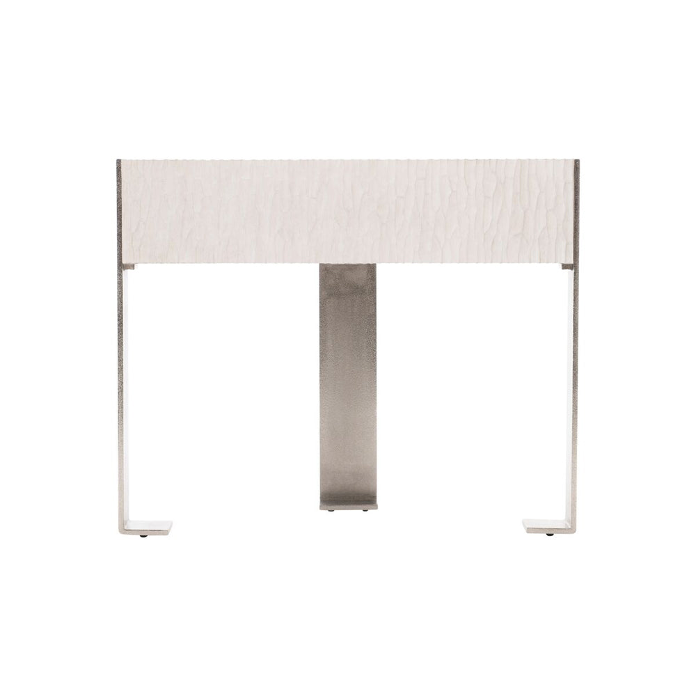 Mixed materials and stunning lines create a unique nightstand. Three cast aluminum supports create a structural tripod, curving to the floor to define the legs of the Solaria nightstand. They encompass a drawer box with a chiseled cast resin front and a Weathered bone finish. A two-port USB charger is located on the upper back of the case.