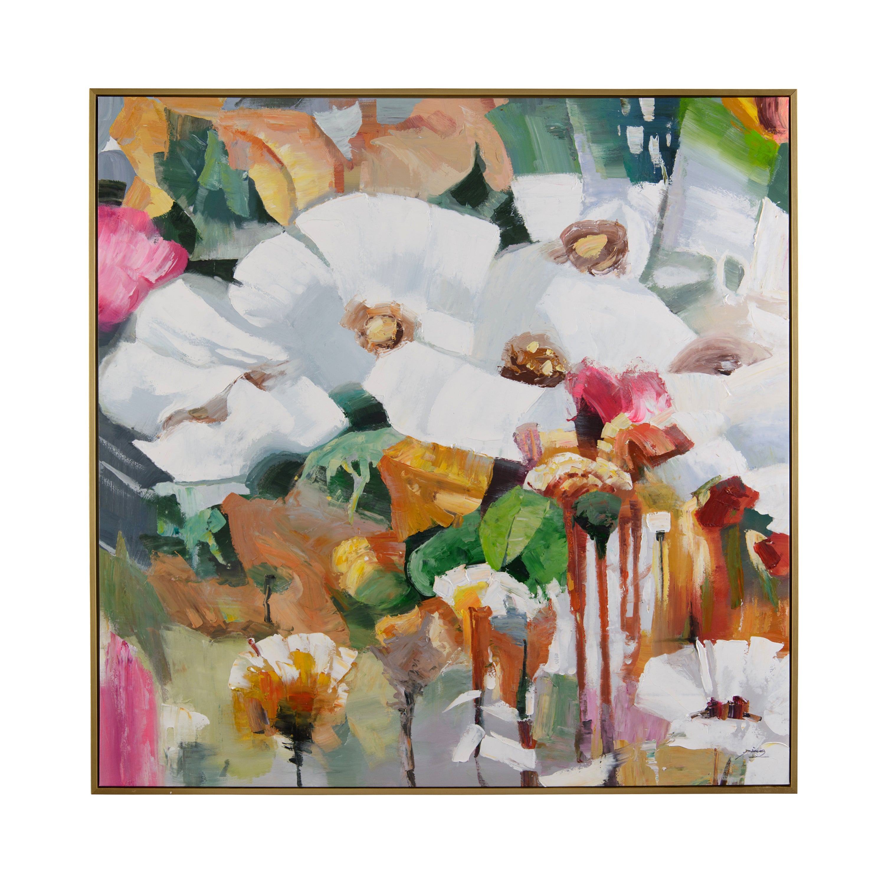 The summer special design of beautiful large white flower mixed with red, green, and white is reflective of happiness and new life. Framed in a gold molding.