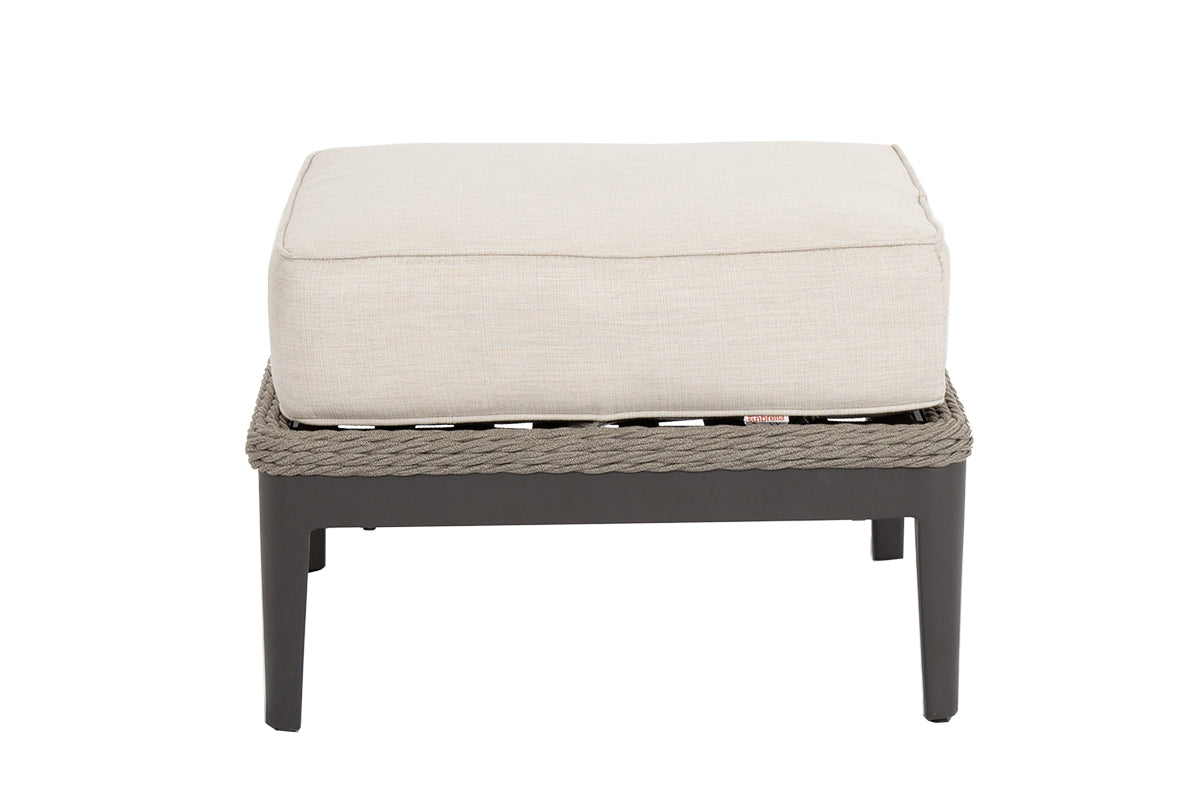 The Marbella Ottoman features a braided rope design plush 6" box cushion, and tapered leg in powder-coated aluminum.