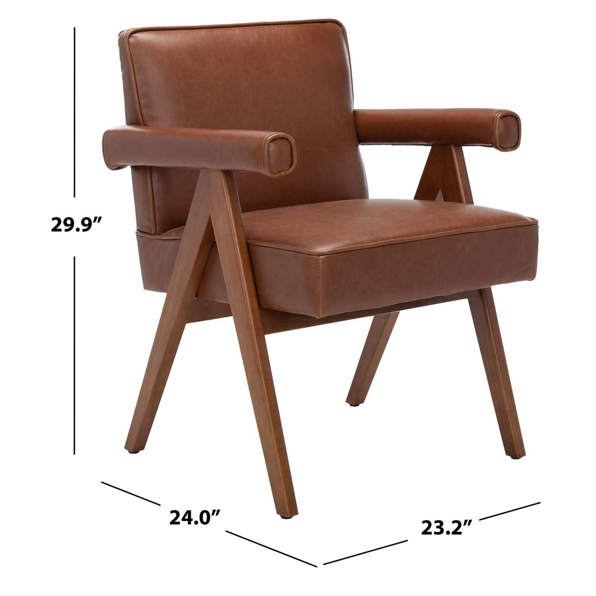 Indulge in modern luxury with the sleek design of this Suri Mid Century arm chair. Inspired by master artisans, Suri is finely crafted with rubberwood in a warm walnut finished and generously upholstered in rich cognac PU leather. Designers adore its bolster style round arms.