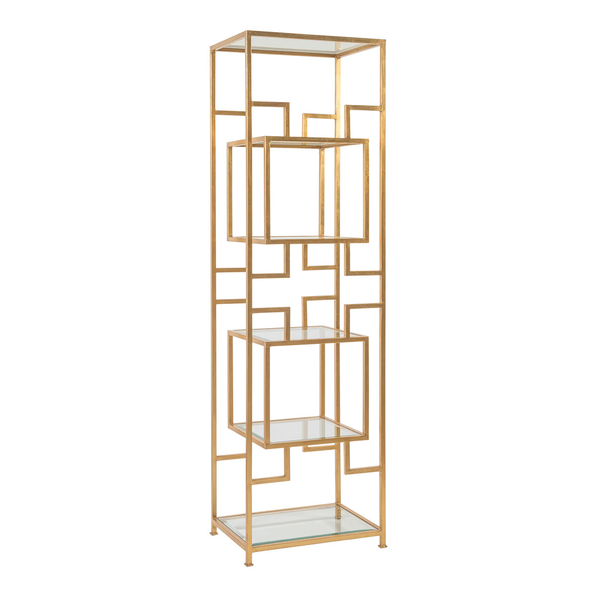Dramatic linear architectural form constructed of tubular steel in true gold leaf with antiqued effect. The tubular steel frame features six inset glass shelves, all tempered with 1-inch bevels, providing ample display. Available in all Artistica Metal Designs finishes. SUSPENSION - 2006 Dramatic linear architectural forms constructed of tubular steel and inset beveled glass. . . Tubular steel frame, 6 inset glass shelves , METAL DESIGNS ,