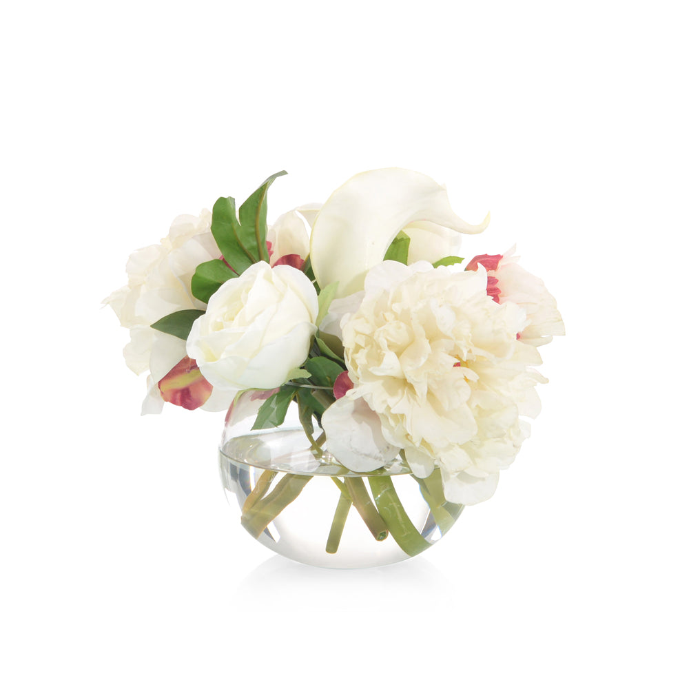 A clear glass bowl is filled with real-touch peonies, roses, callas, and faux water.