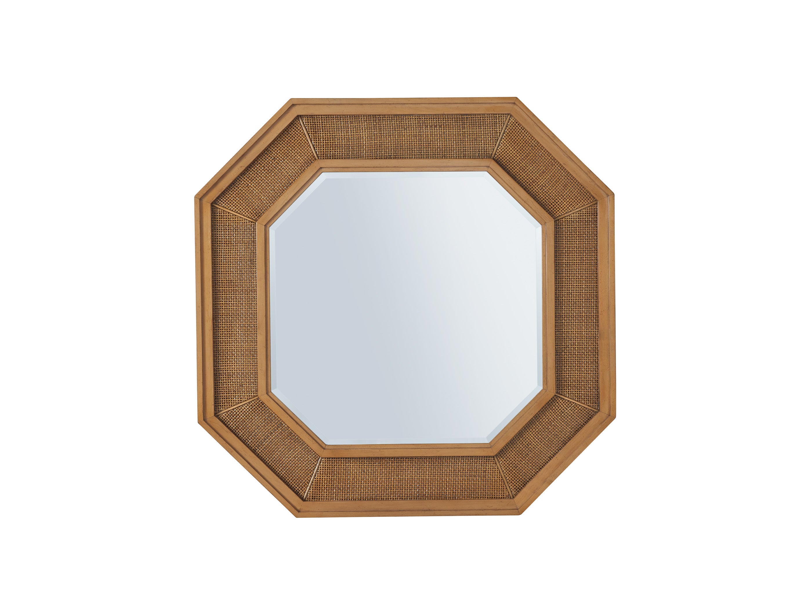 The octagonal mirror features a wooden frame with step moldings, inset cane around the perimeter, and a . 75-inch beveled mirror plate. Stepped wooden frame with woven cane inserts-, . 75 inch bevel. Plate cut to pattern - 25. 25W x 25. 25H.