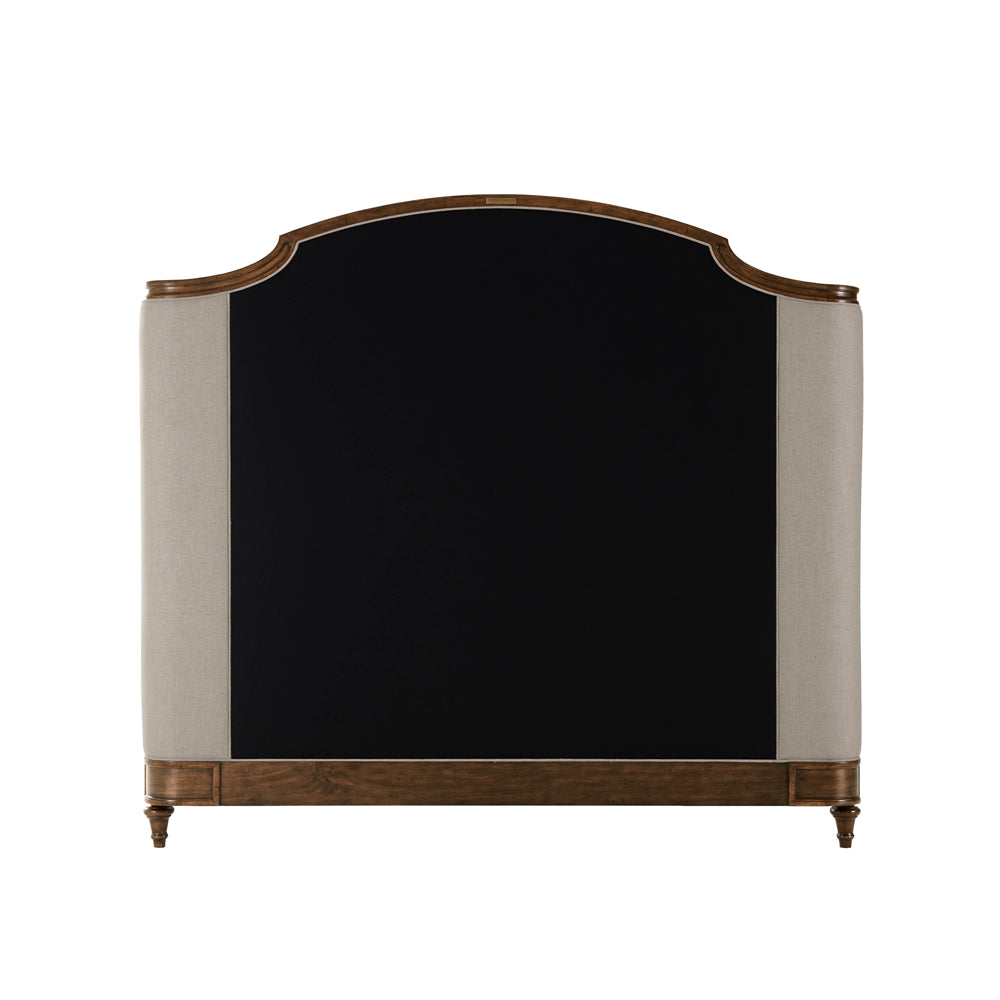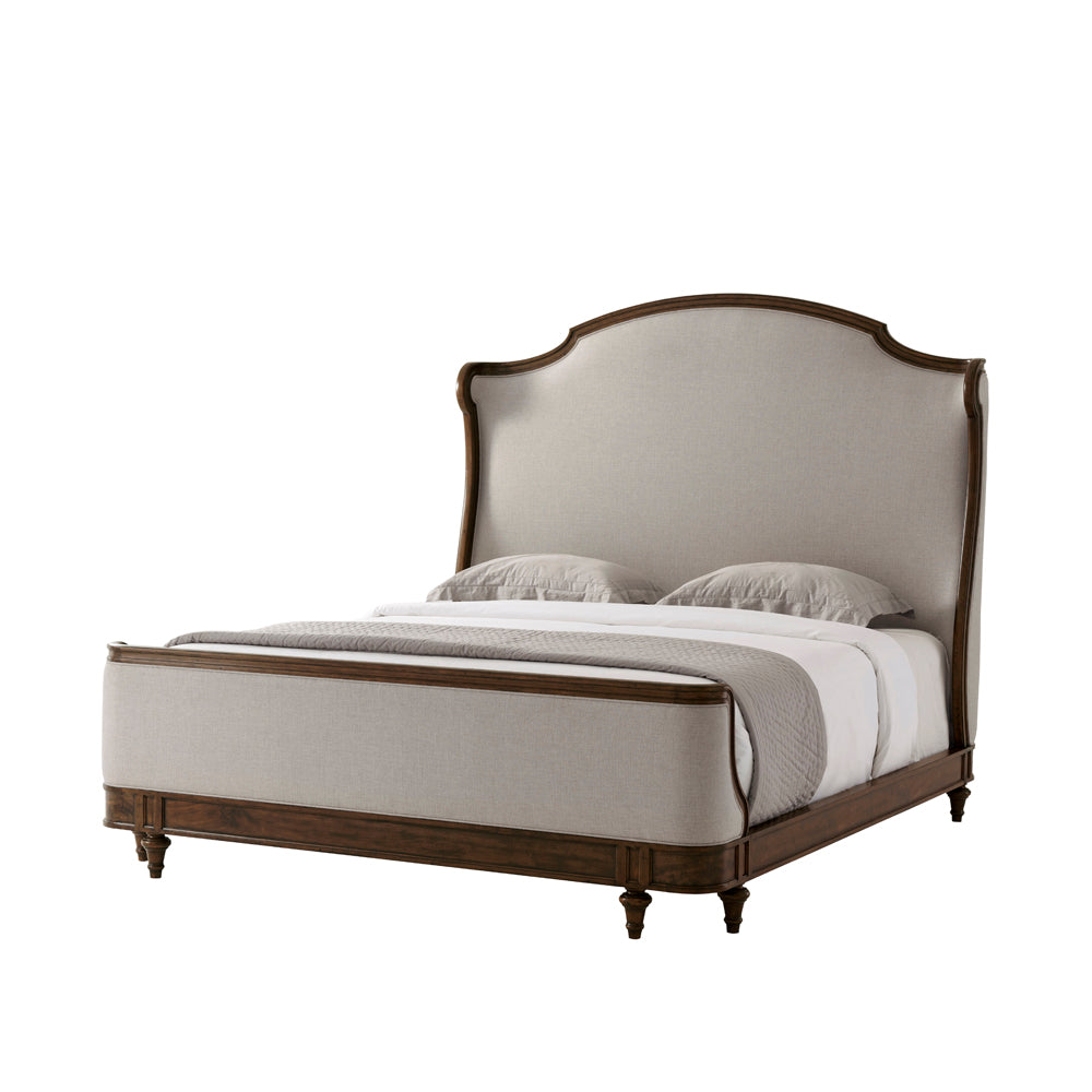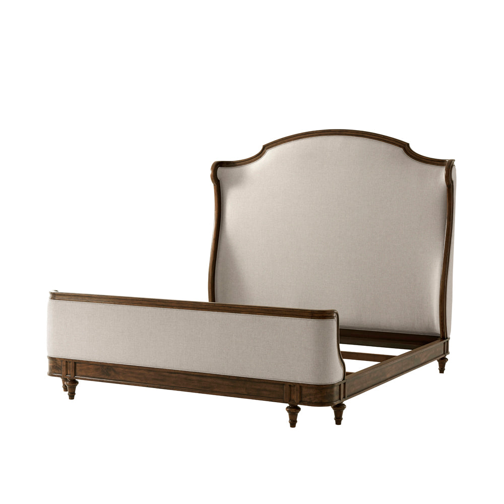 Beautiful hand-carved Beech and Oak wood bed with arched & molded upholstered headboard adorned with upholstered scroll wings. Hand carved low footboard with paneled rails rests atop peg feet.