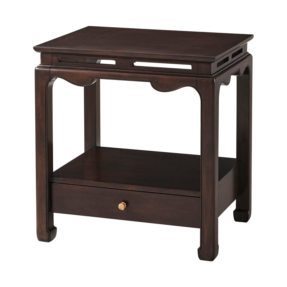 Based on a canonical Chau-footed side table, Alexa Hampton brings the Far East home with a striking yet understated accent table. Timothy is a master class in quiet detail: molded-edge top, slightly recessed and pierced apron, lower tier with drawer, and square legs with Chinese inscrolled feet. Mahogany and Mahogany veneered.