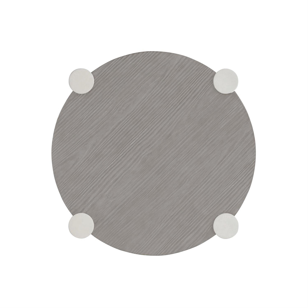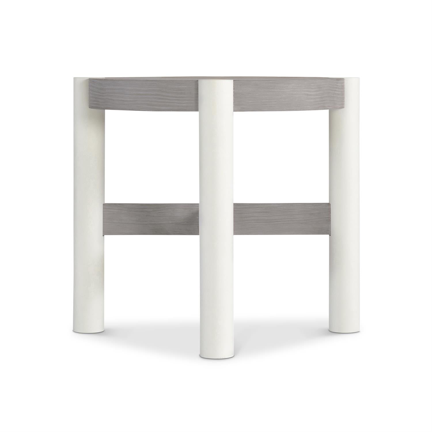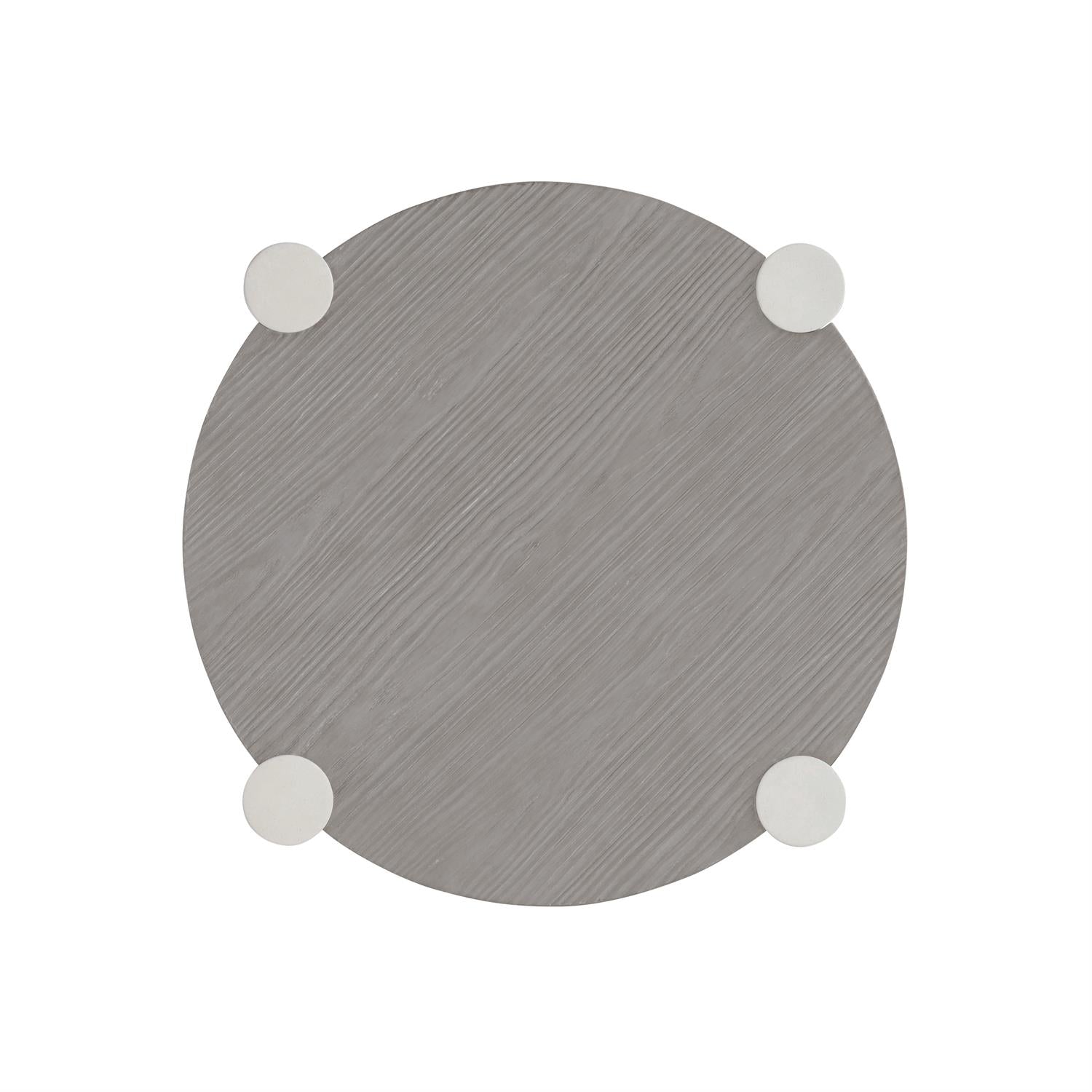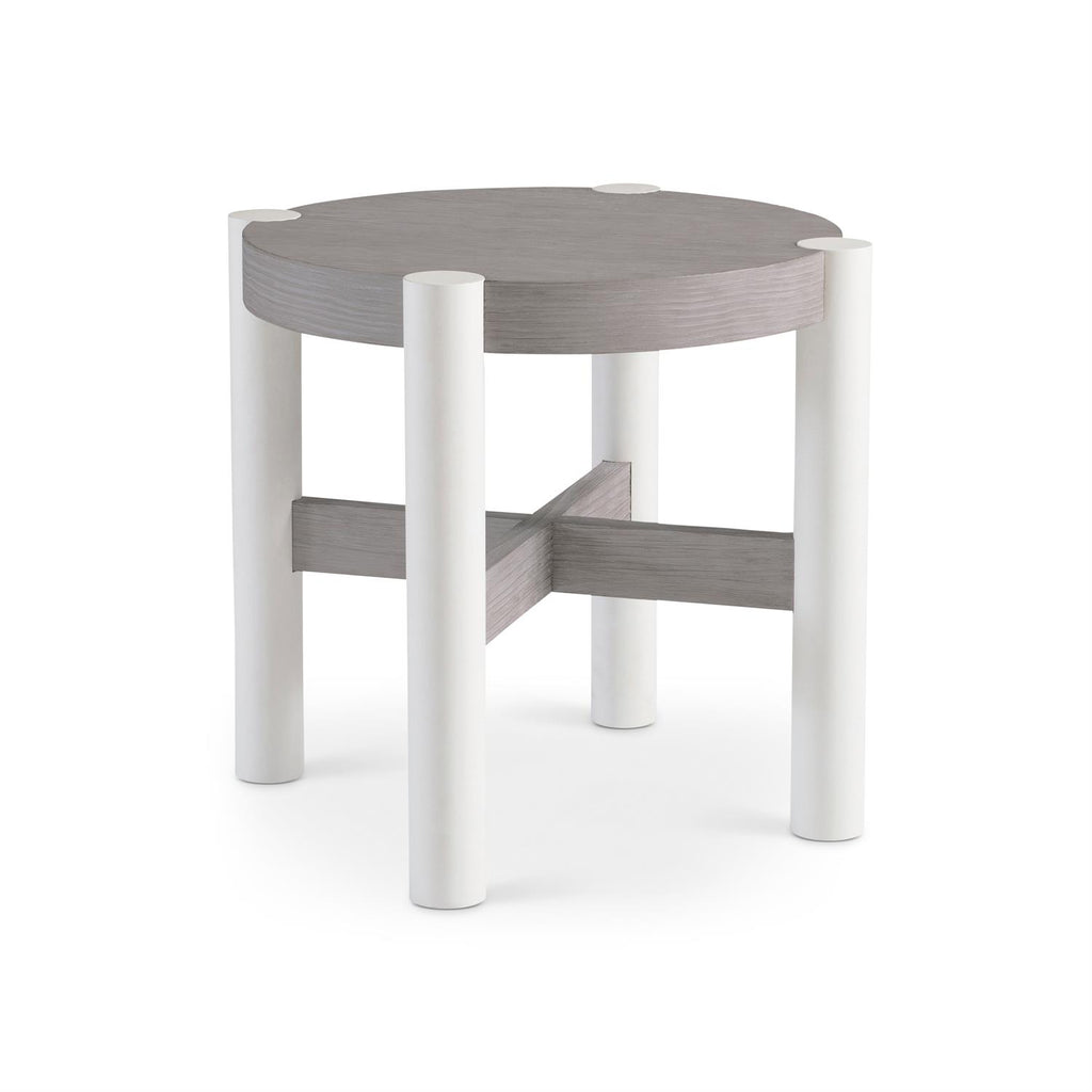 Gris Finish On Round Side Table With "X" Shaped Center Stretchers. Leg Posts In Smooth Quarry Faux Stone Finish. Adjustable Glides.