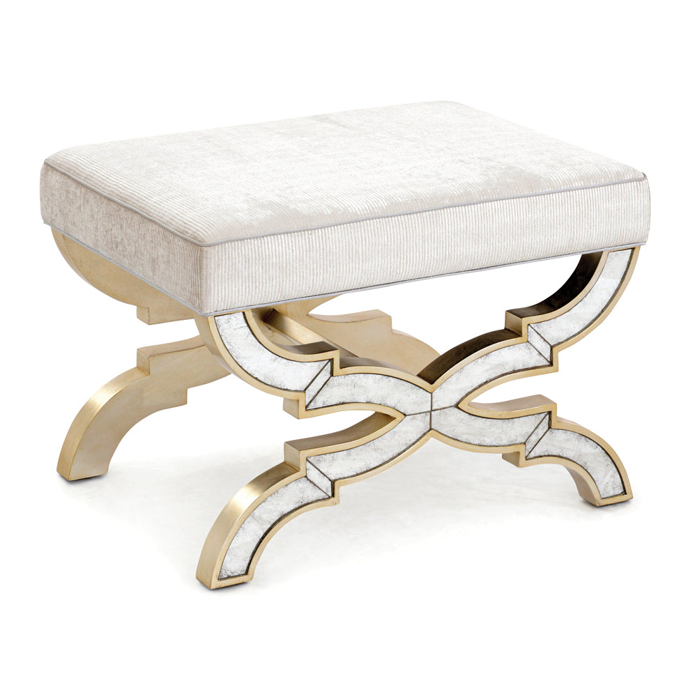This single bench with AglomisA and champagne moldings is upholstered in a neutral fabric.
