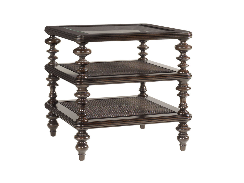 The beveled inset glass top showcases two woven wicker shelves below with beautifully carved legs completing this elegant design. Named for the spectacular oceanfront enclave on the island of Oahu, Royal Kahala represents the most refined and elegant of the lifestyles within the Tommy Bahama Home portfolio. Crafted from Ribbon Stripe Mahogany, the collection evokes a sense of romance and intrigue through the fusion of eclectic design, exotic natural materials and distinctive finishes. a connoisseur's approach to elegant island living.