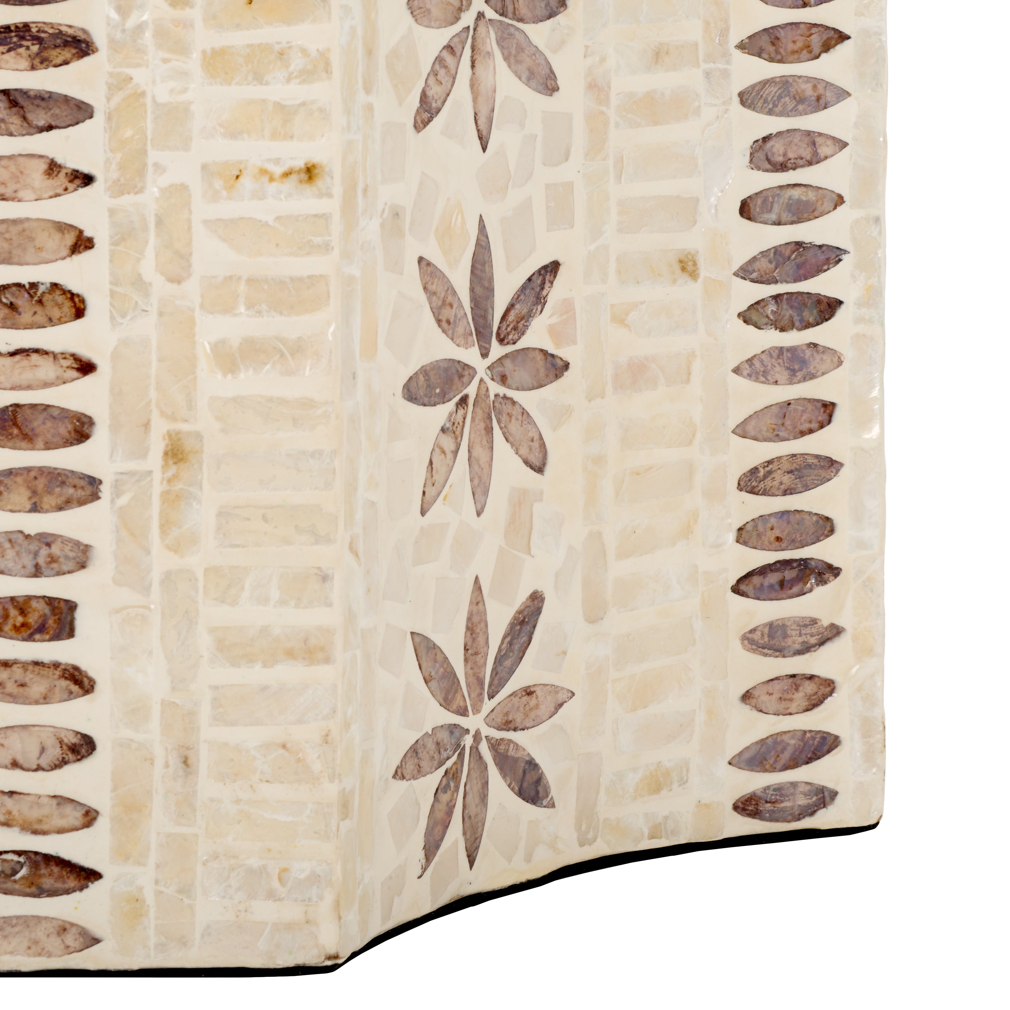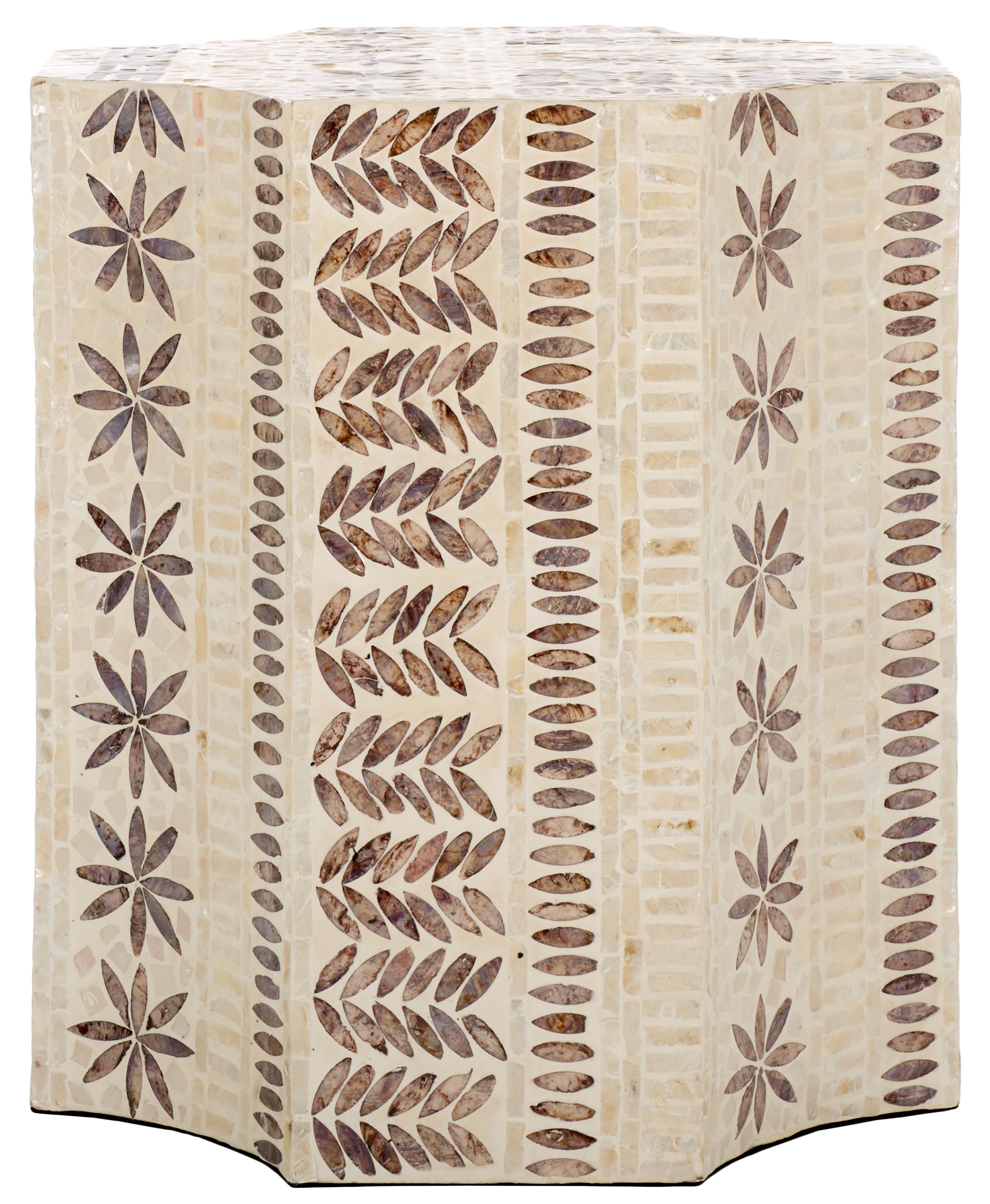 Uplift any corner with the eye-catching beauty and charm of our Tuley accent table. A rich artisanal appeal and sculptural silhouette make our accent table a true stunner. A capiz inlay creates a beautiful harmony of exotic patterns and motifs to accentuate the sleek curves of our table. It is finished off in an iridescent and translucent white and gold finish to lend refined glamour to any corner. A perfect accent for an upscale space or eclectic environment, our end table remains the perfect companion to your sofa, bed, or chaise.