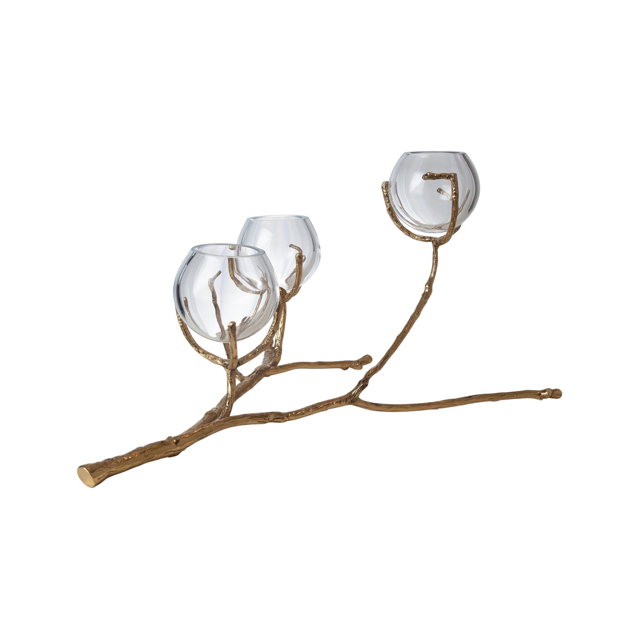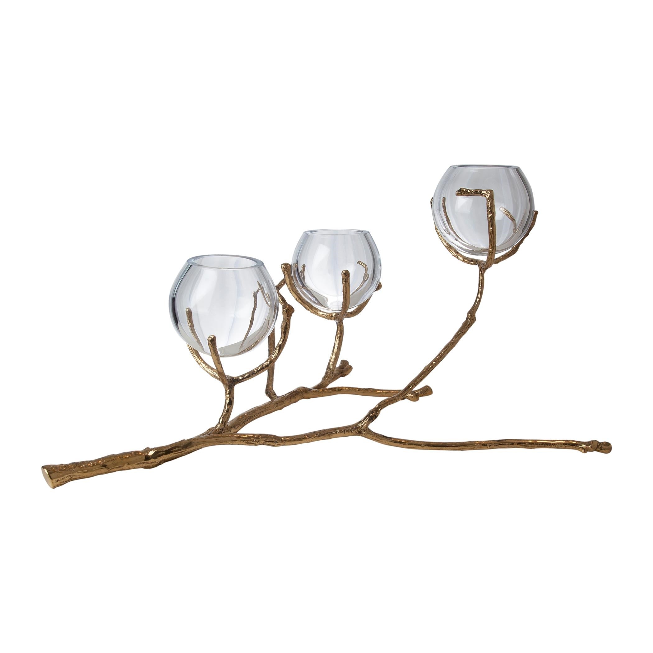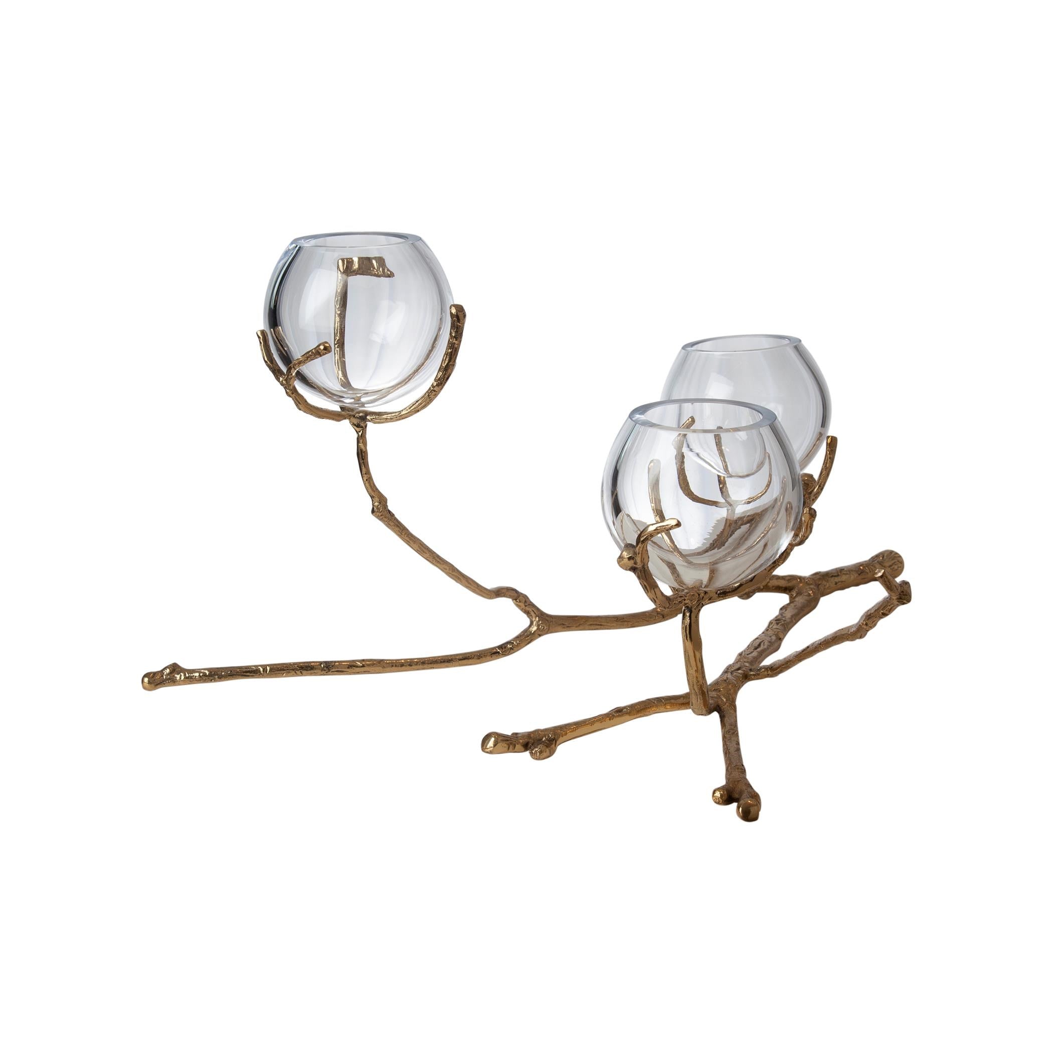 Stems of solid sand-cast brass twist and turn creating our Twig Vase Holders. These delicate vase holders have taken natural elements and turned them into glowing artful accessories. The glass bulb-shaped vases display small buds beautifully. Display one piece for a simple look or show all three sizes together for a dramatic tablescape. Available in three sizes: Large 3-vase holder, Medium 2-vase holder, and Small 1-vase holder. Also available in Nickel.