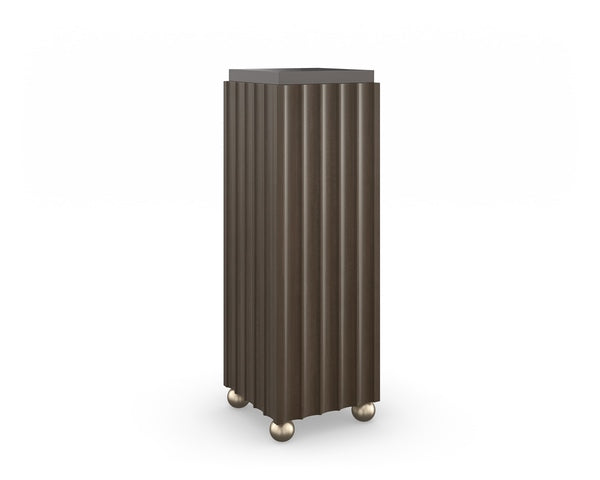 With a nod to Greco-Roman architecture, this simple yet sculptural form elevates flora and objects of interest. Defined by a tall, fluted pedestal, it features an inset Bronze Glass top framed in Dark Chocolate, and metallic ball feet in a Brushed Whisper of Gold for a hint of shimmer and ease of mobility. Style on its own, or pair with Next To You to create a multi-dimensional, gallery-like display.