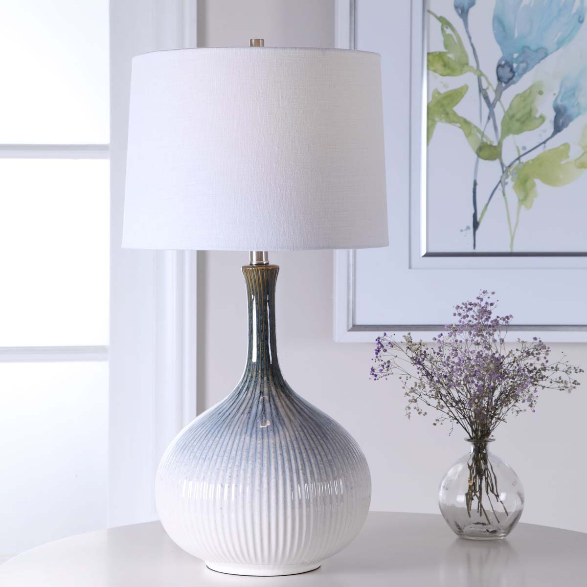 Uttermost's Lamps Combine Premium Quality Materials With Unique High-style Design.With The Advanced Product Engineering And Packaging Reinforcement, Uttermost Maintains Some Of The Lowest Damage Rates In The Industry. Each Product Is Designed, Manufactured And Packaged With Shipping In Mind. Mid-century Inspired Table Lamp Has A Fluted Ceramic Base With Noticeable Ribbed Texture And Is Finished In A Cream, Light Blue, Indigo, And Dark Brown Ombre Glaze With Brushed Nickel Plated Accents. The Lamp Is Paired With A Tapered Round Hardback Shade In An Off-white Linen Fabric With Light Slubbing.